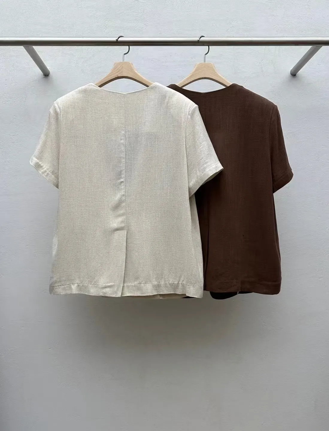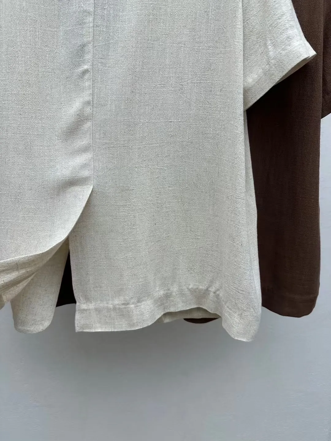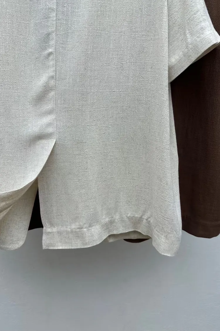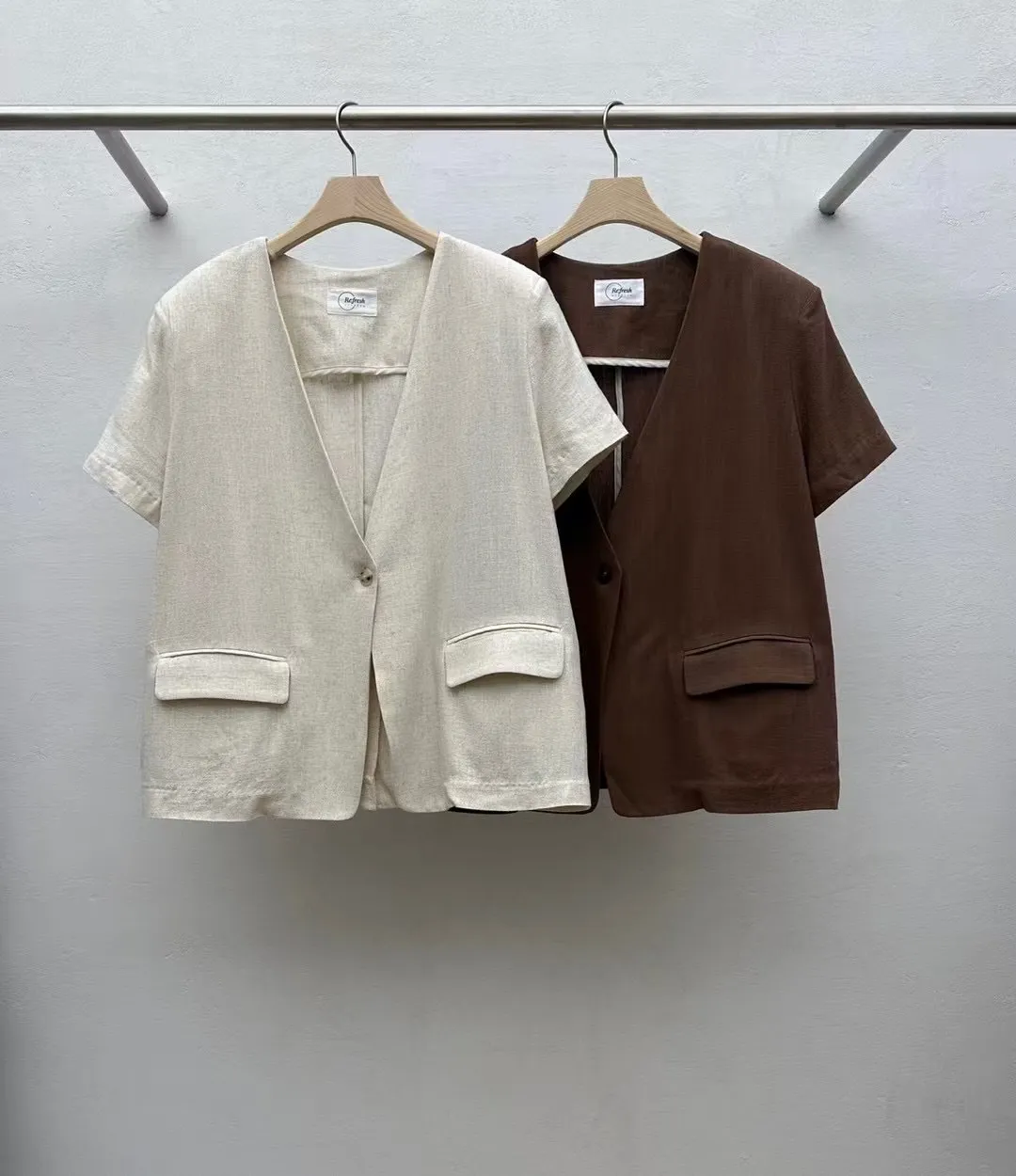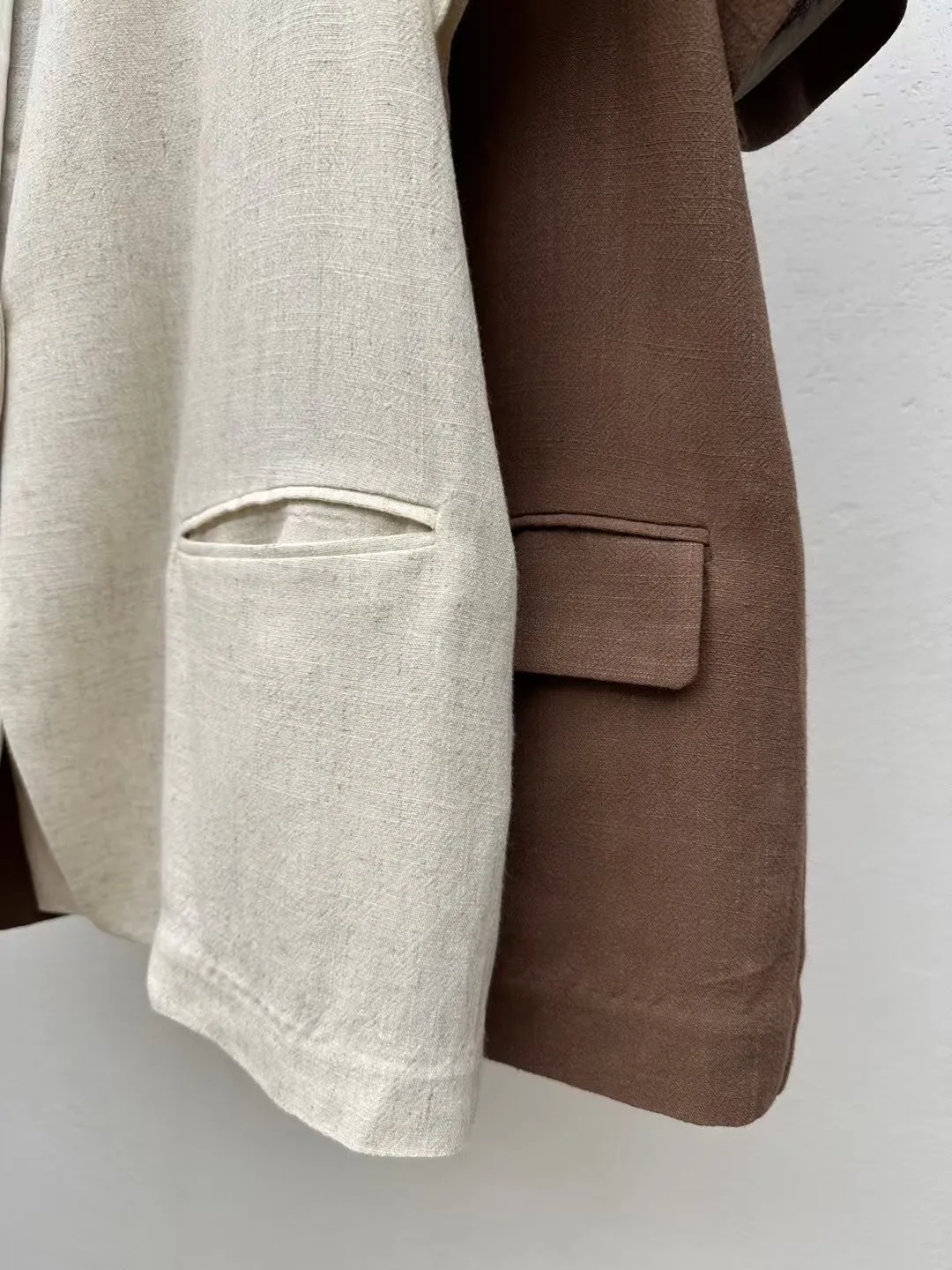 GM445俐落夏日薄款亞麻西裝外套 米 咖 官網價$1450 線上價$1420縲縈+亞麻 薄款輕盈 微磅數垂墜感 後開叉 有口袋 親膚不刺癢 超敏肌略過亞麻面料均有自然植物纖維雜質,非瑕疵。肩寬47胸寬60全長67以下顏色,米>咖