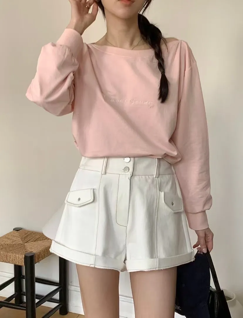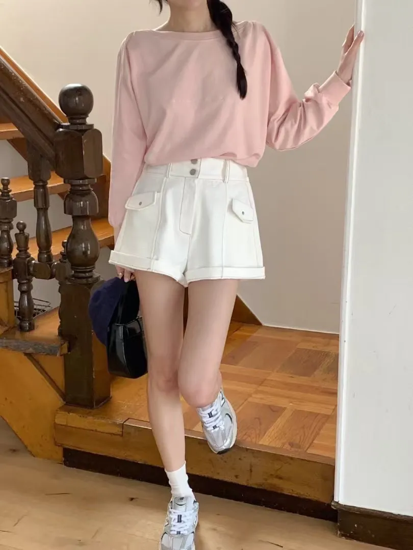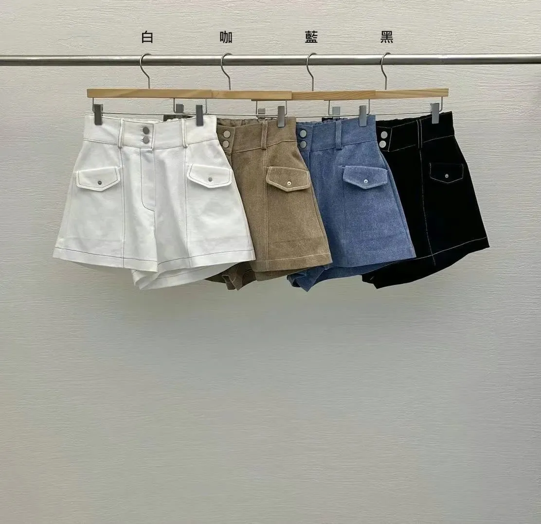 棉 斜紋棉 寬腰雙釦拉鍊穿脫 可愛側口袋 跳色車線 有口袋 可反摺