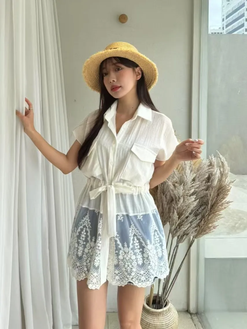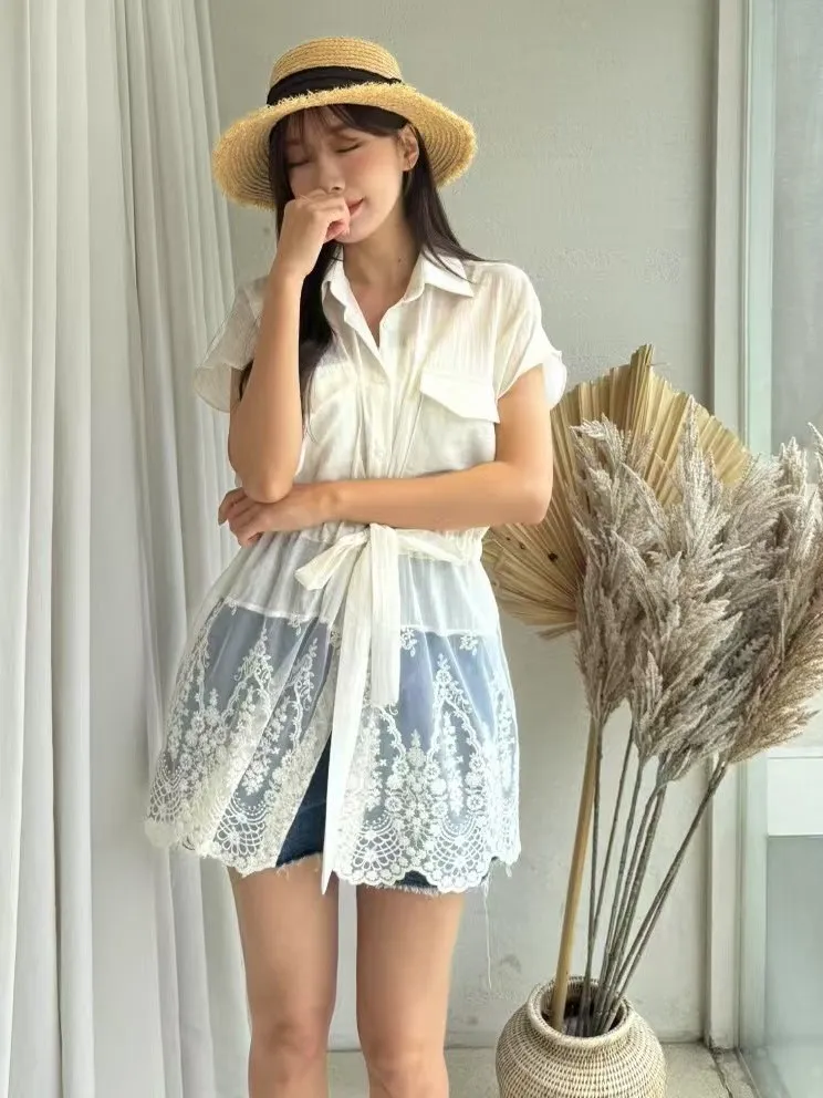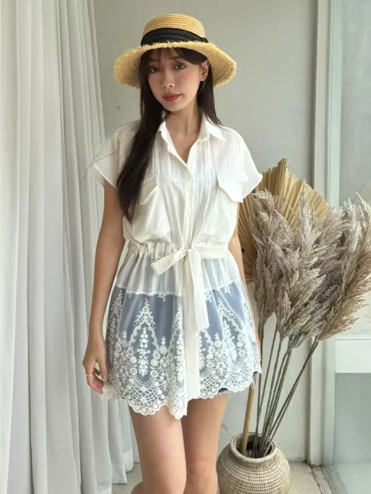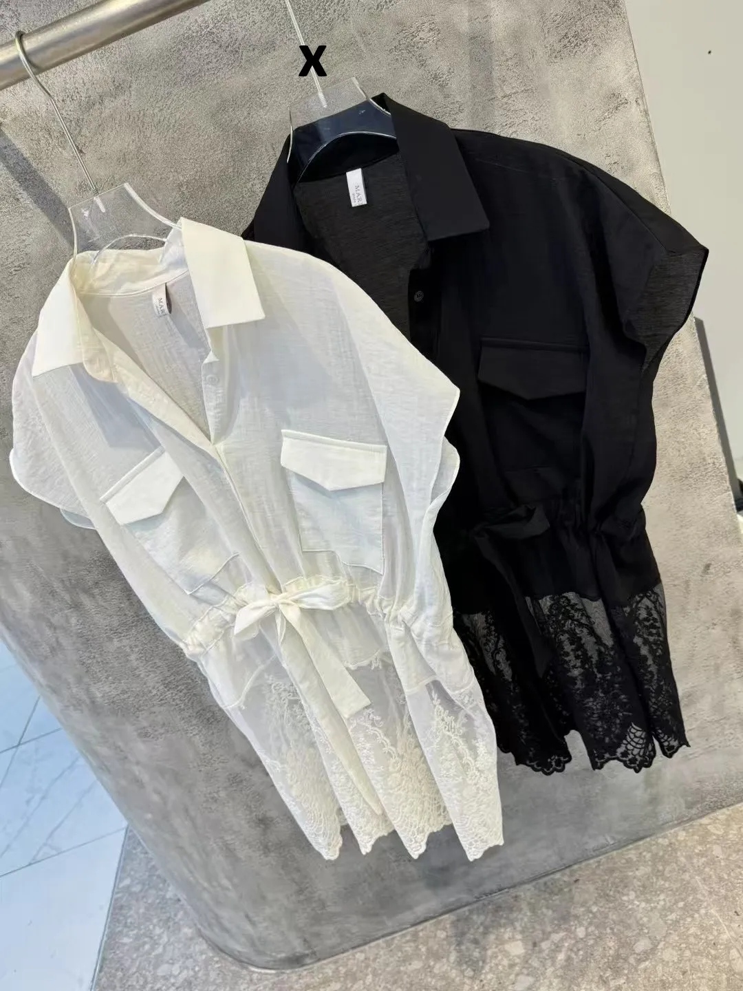 尼龍+亞麻 胸前雙口袋 下擺蕾絲 腰綁線 可上衣可罩衫