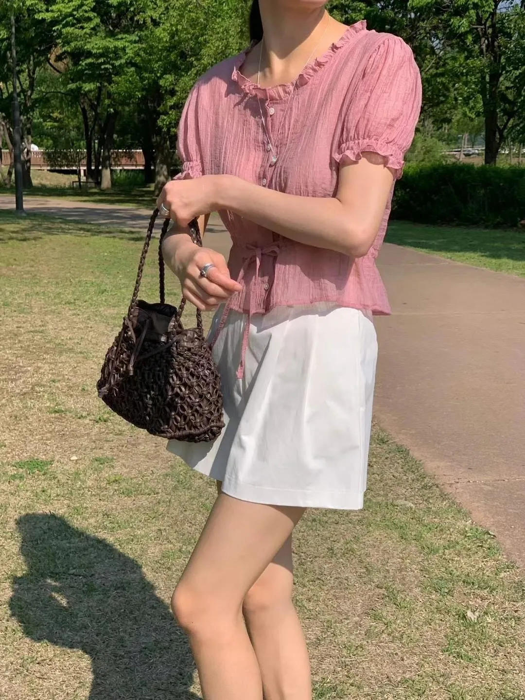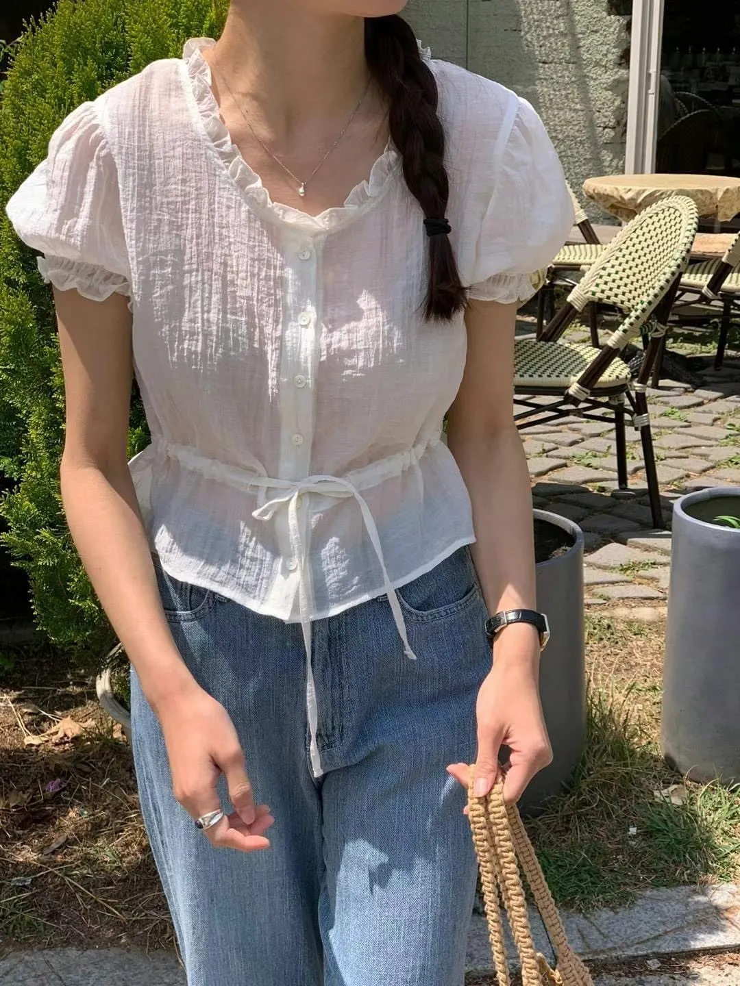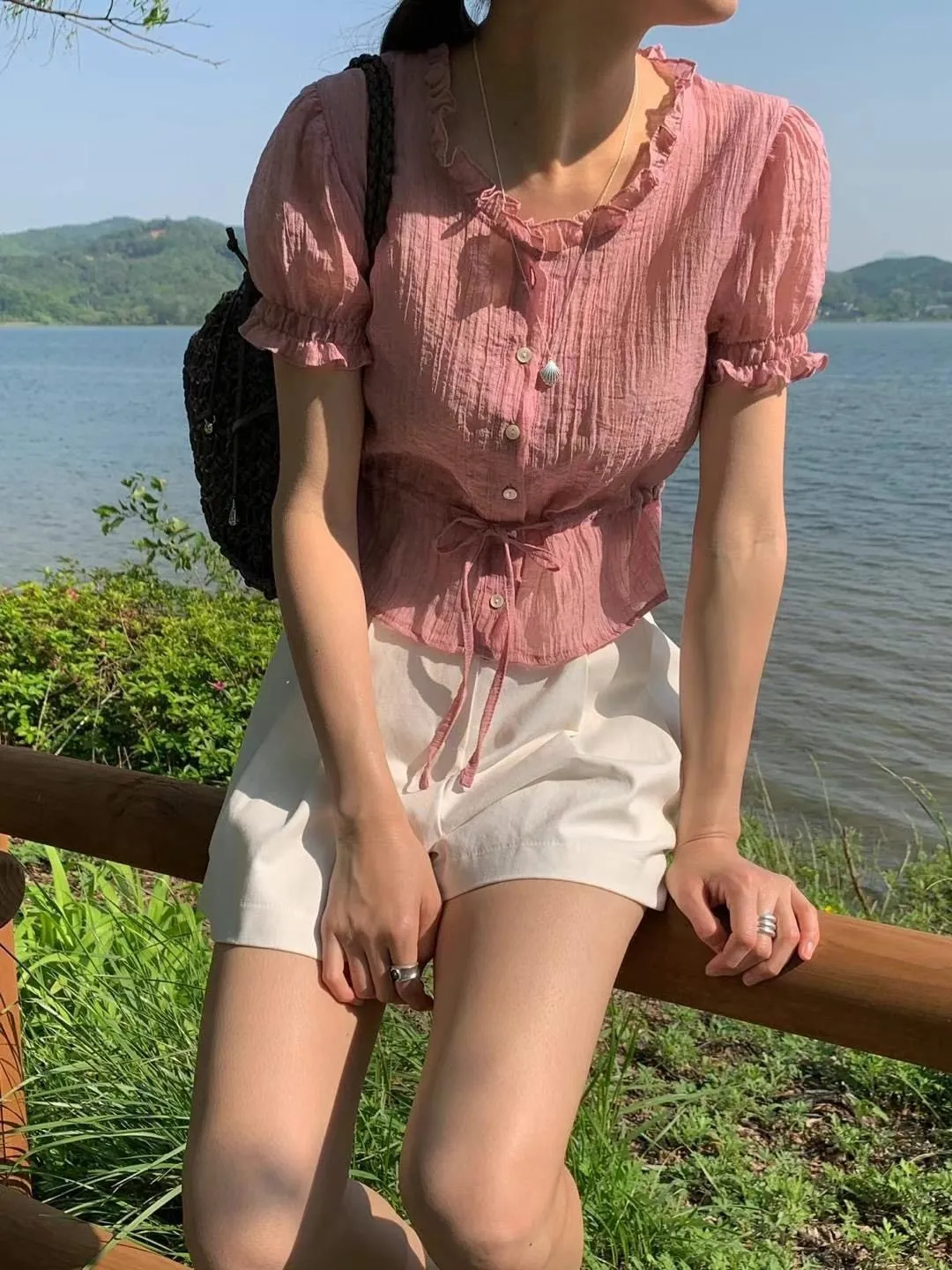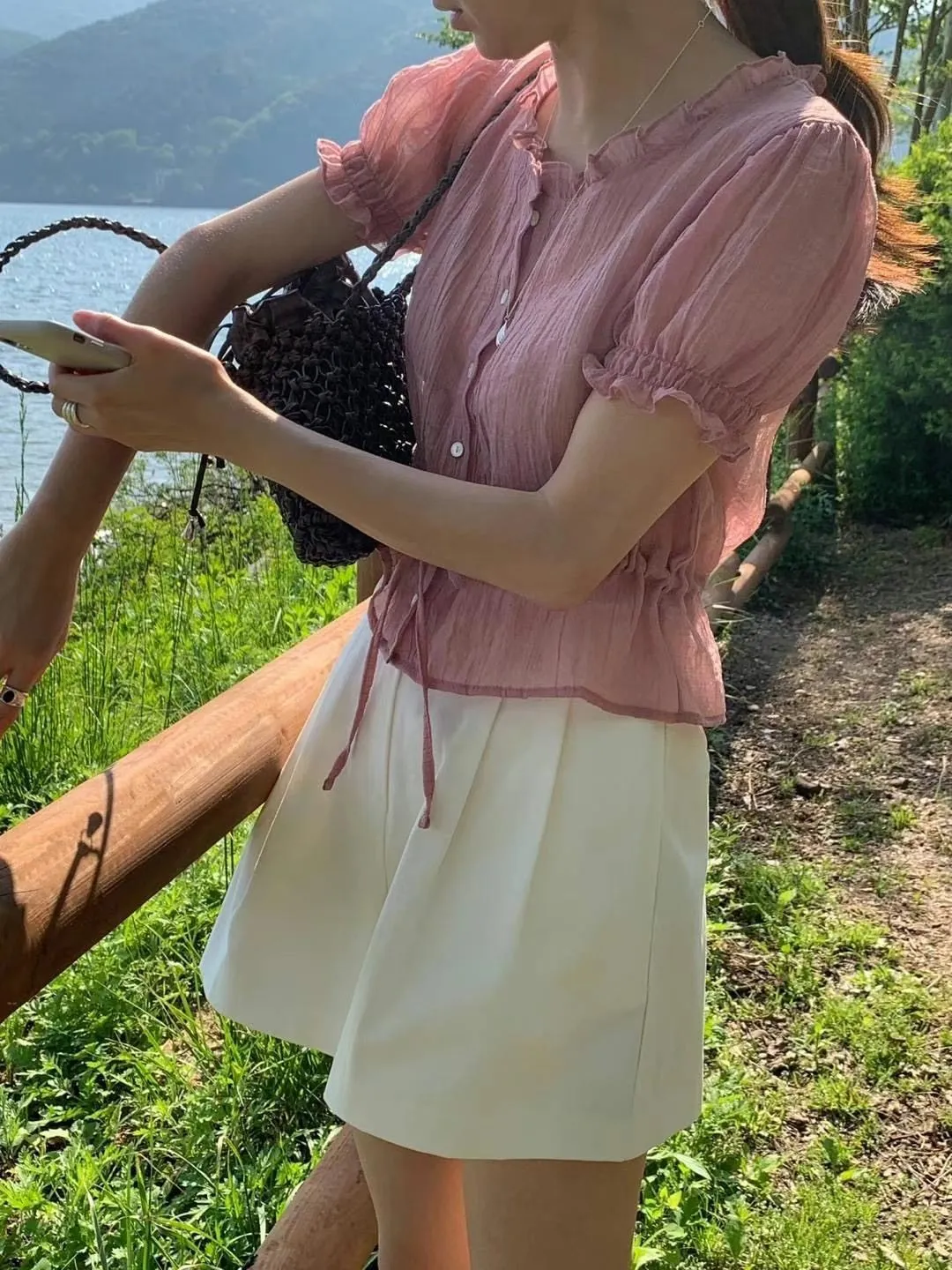 天絲80%+尼龍 荷葉領 絲滑薄款透光 細腰抽繩 貝殼釦