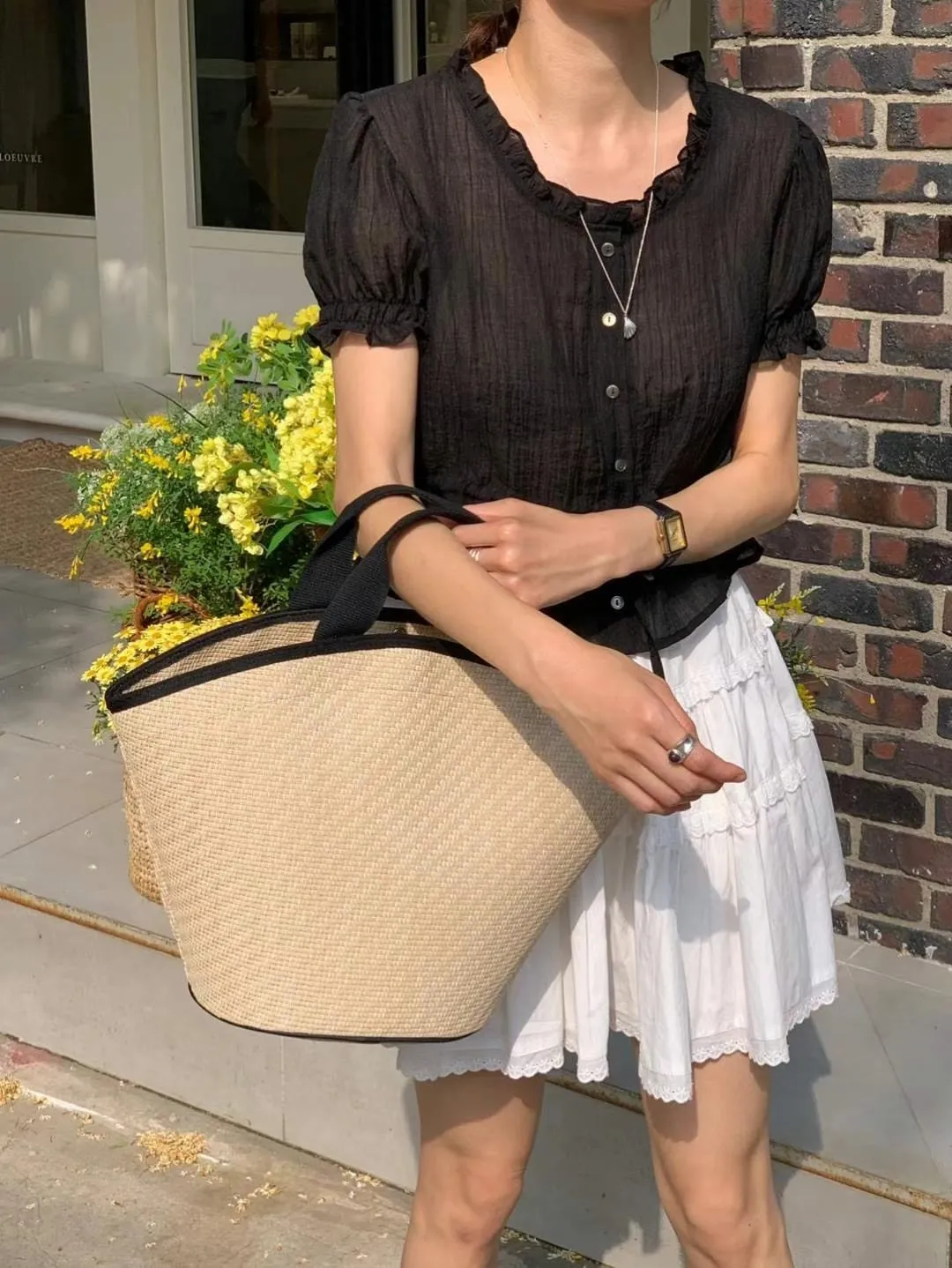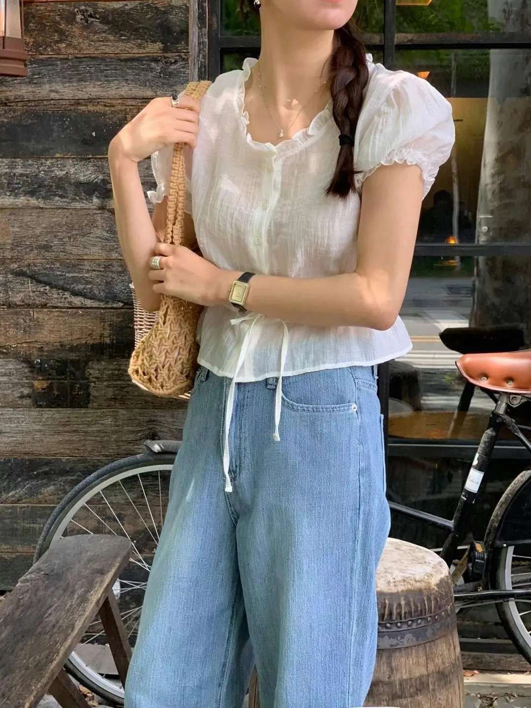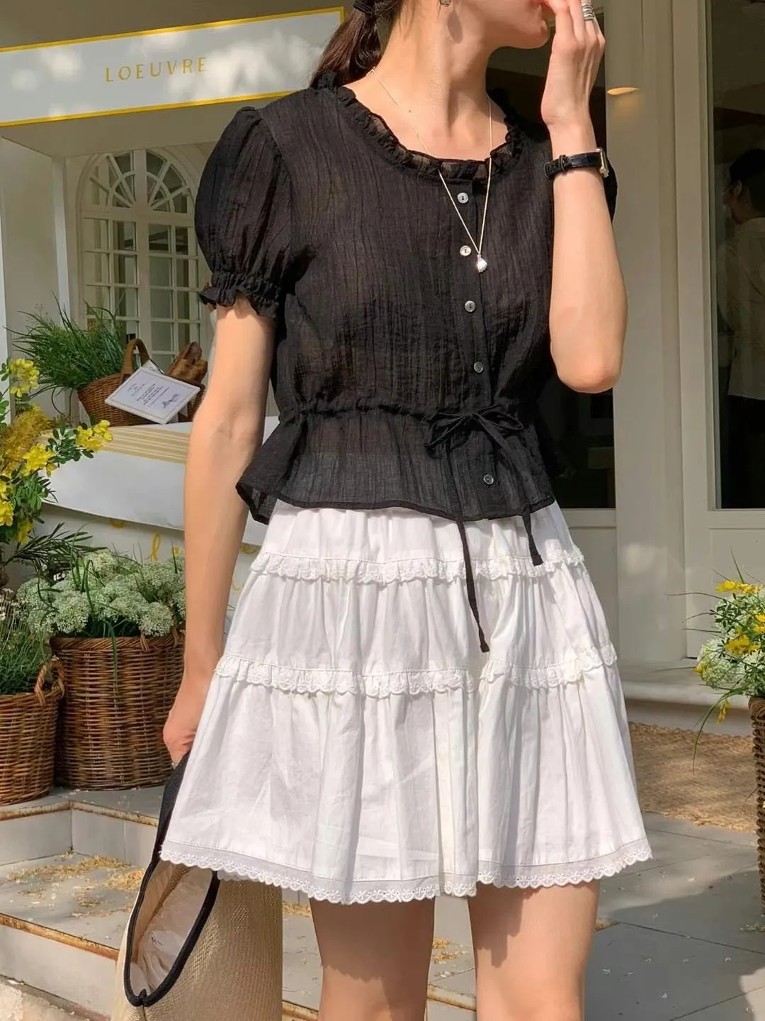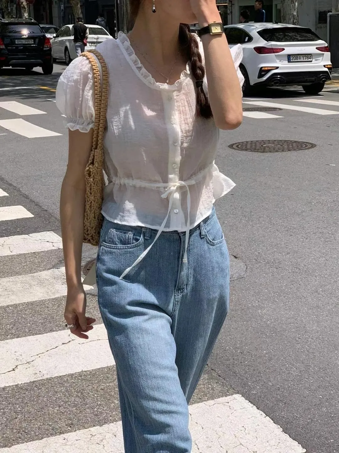 天絲80%+尼龍 荷葉領 絲滑薄款透光 細腰抽繩 貝殼釦