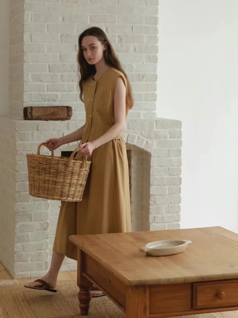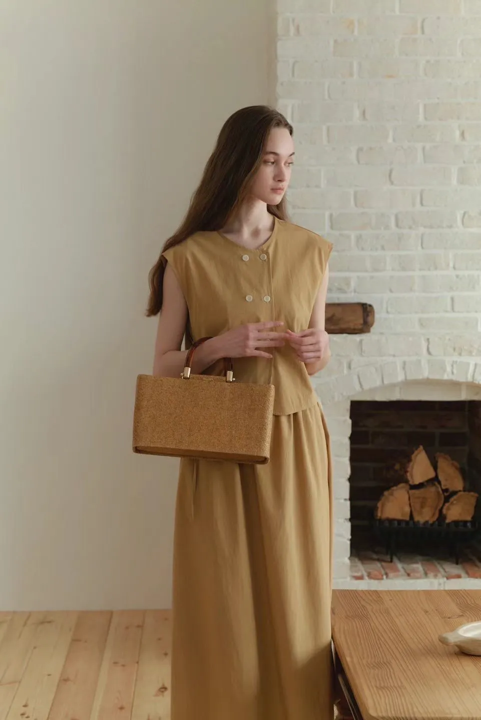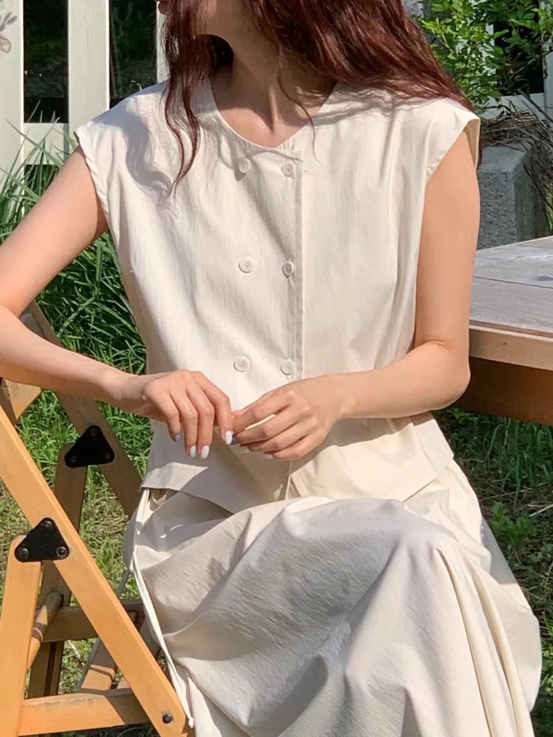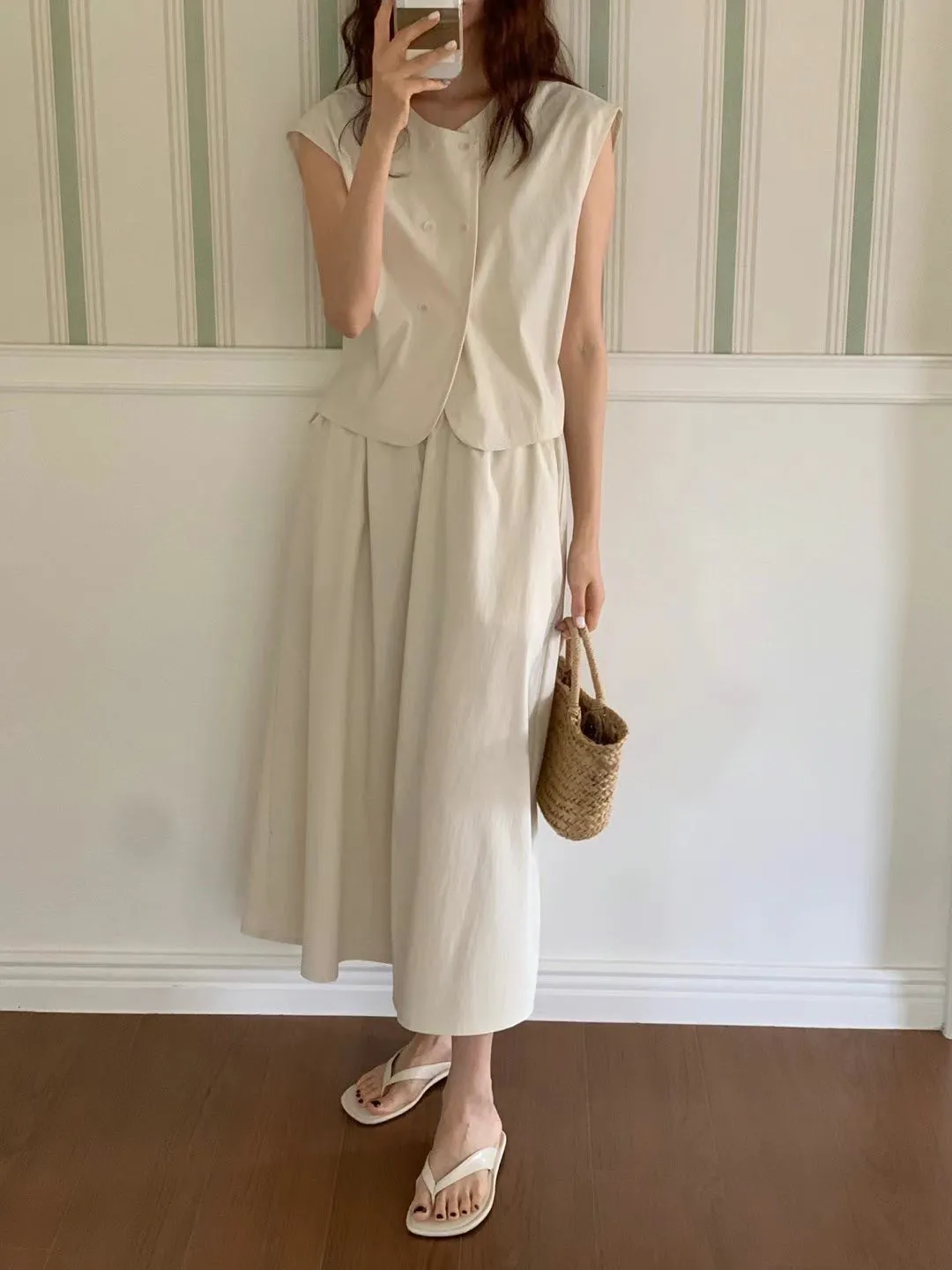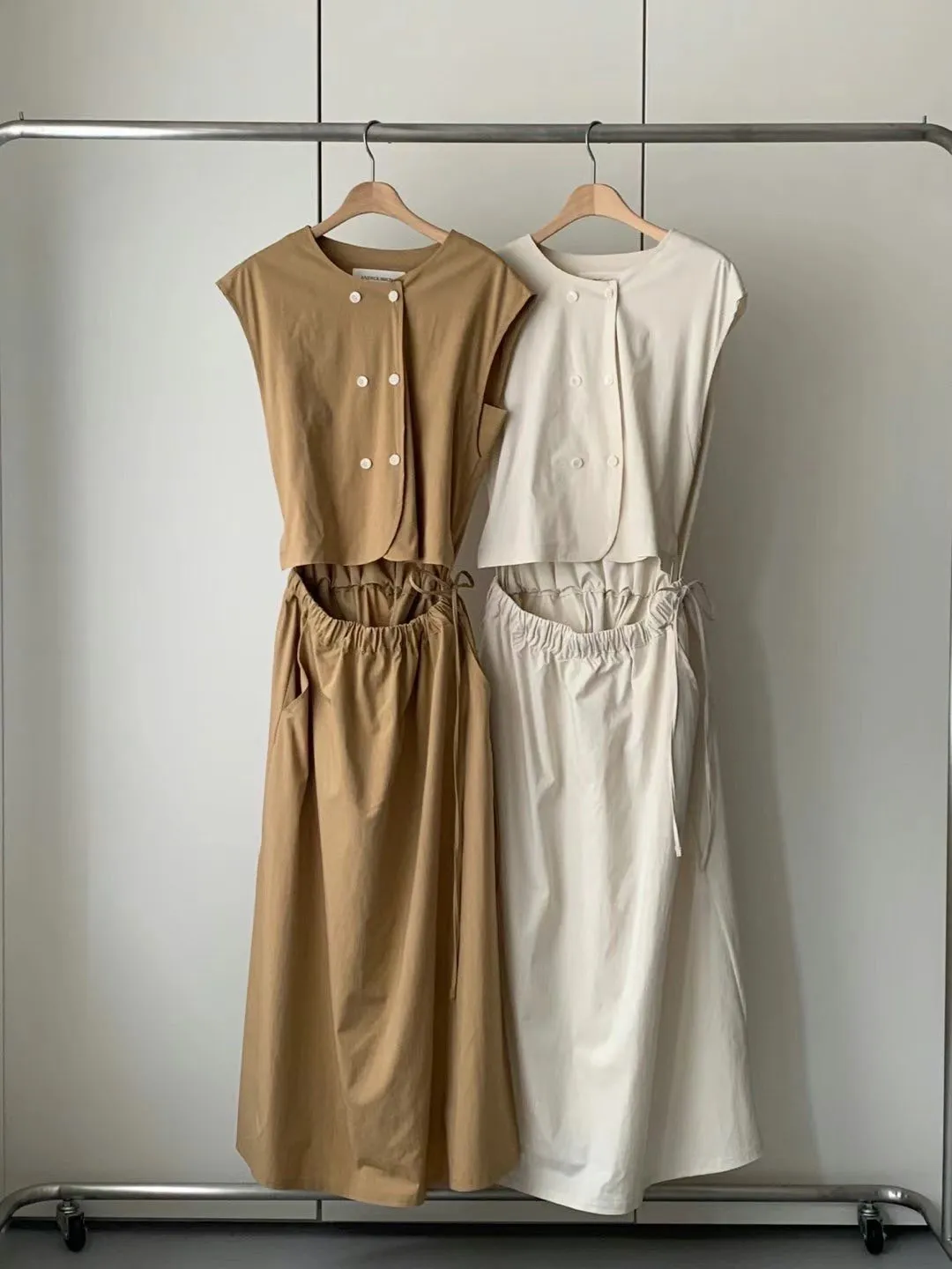 棉+人造絲 輕薄面料 雙排釦背心 腰有鬆緊 有口袋