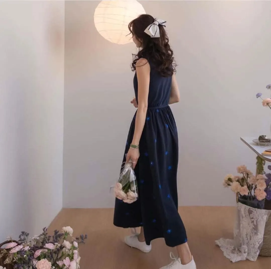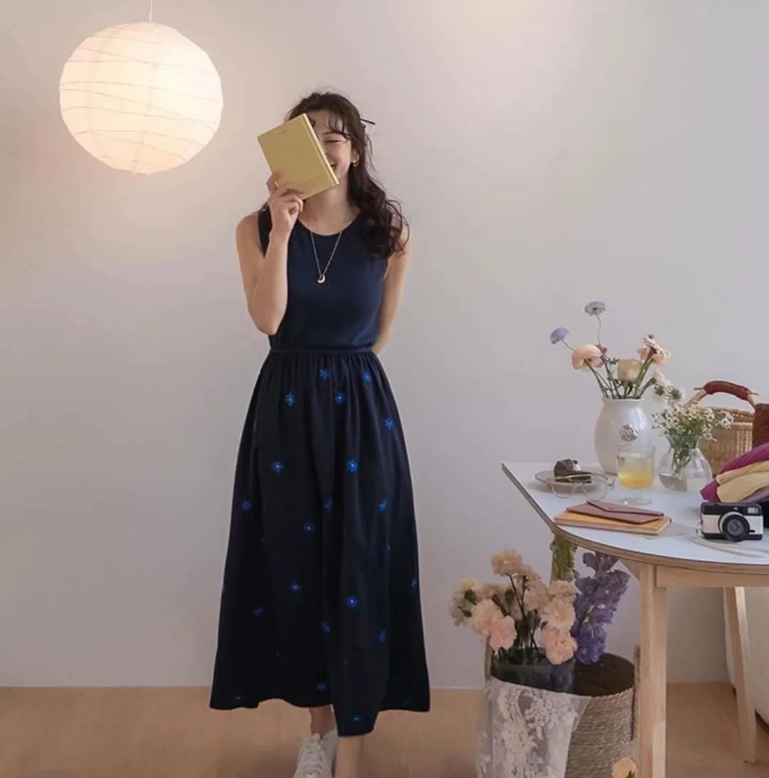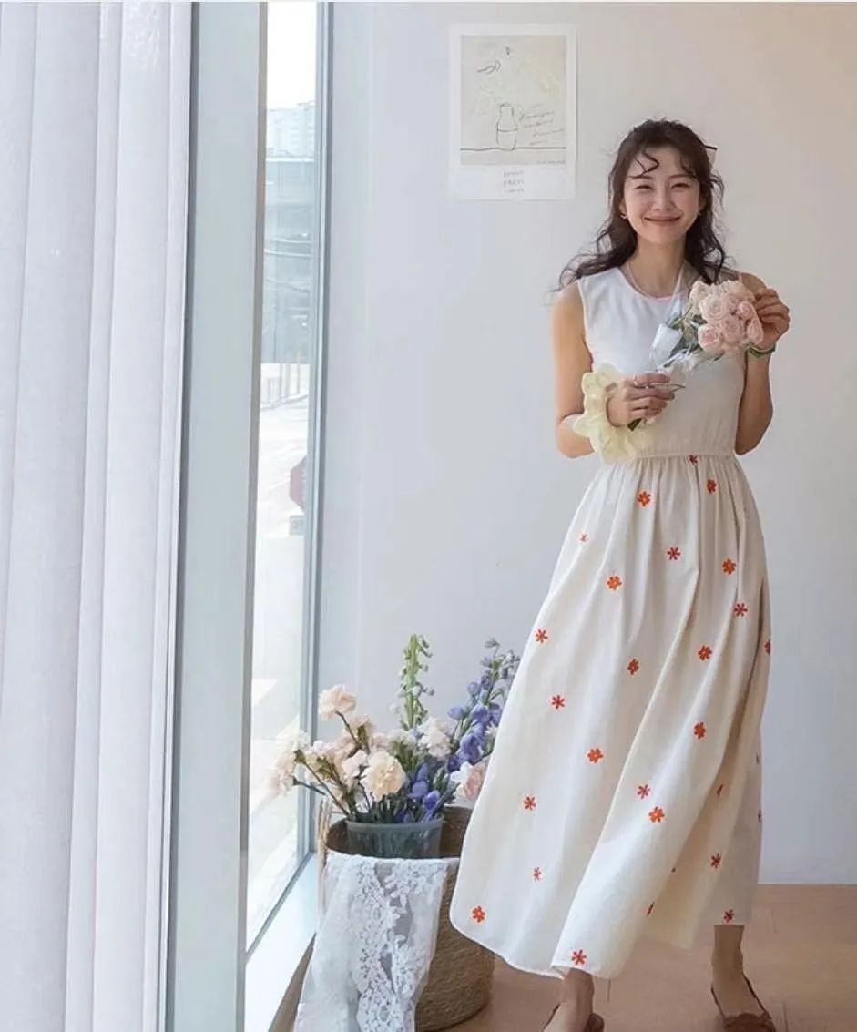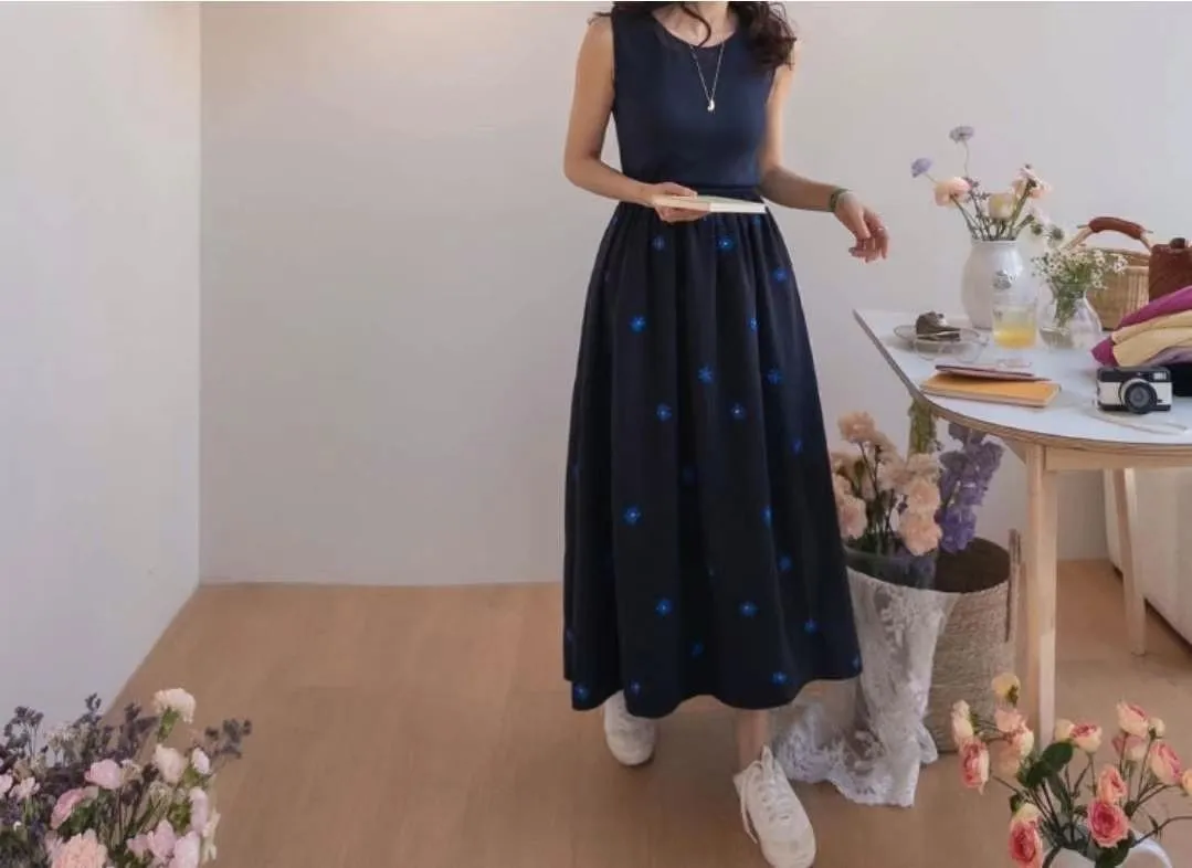 棉 上身和腰車線都有彈性 刺繡小花 襯衫棉傘狀裙擺