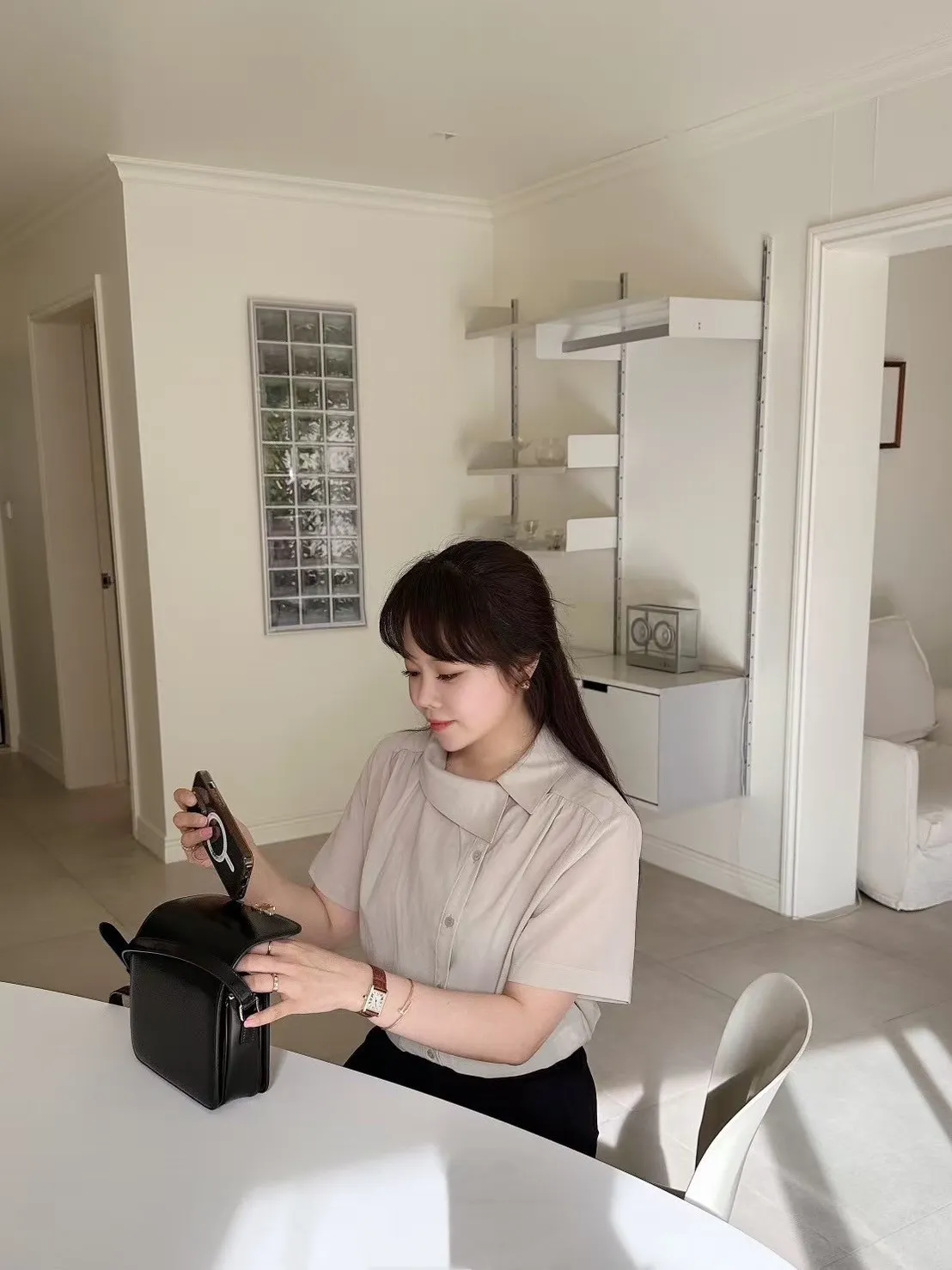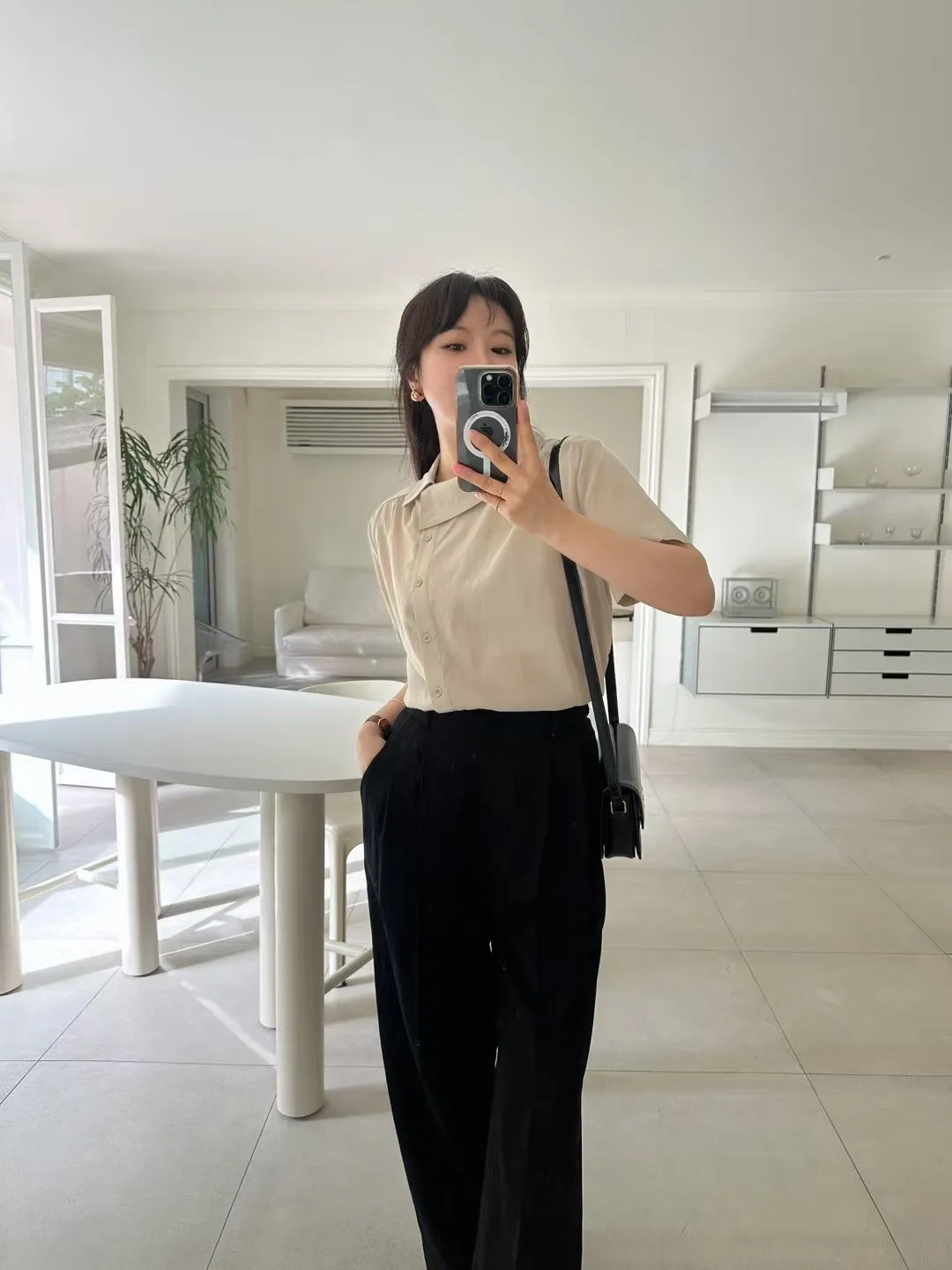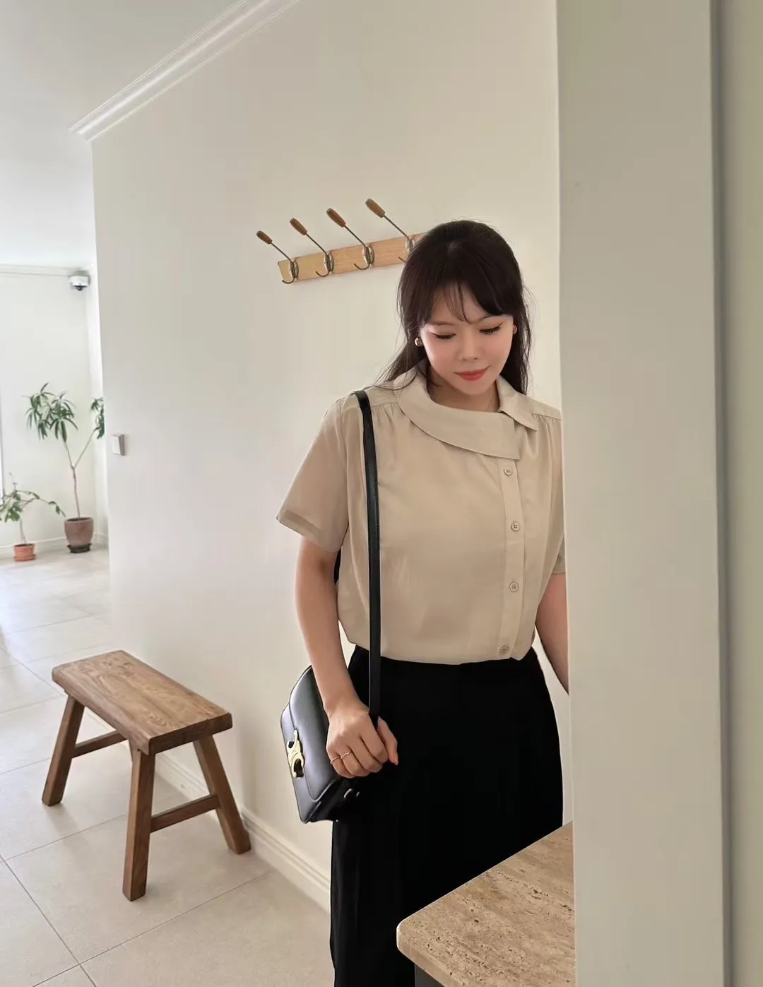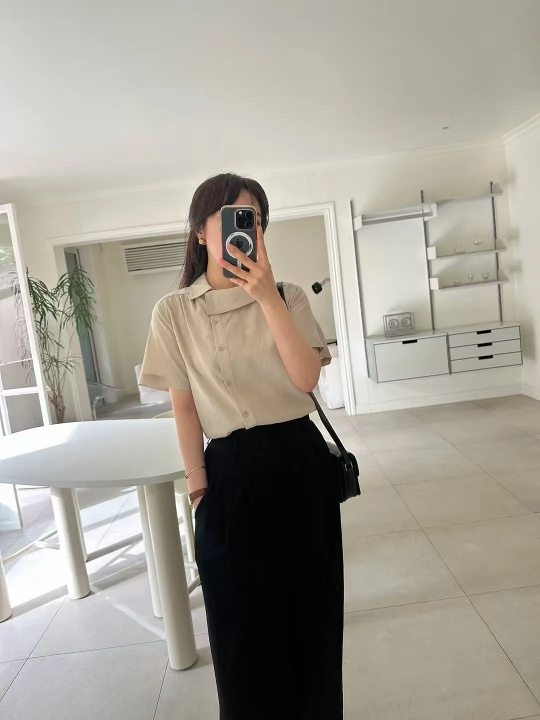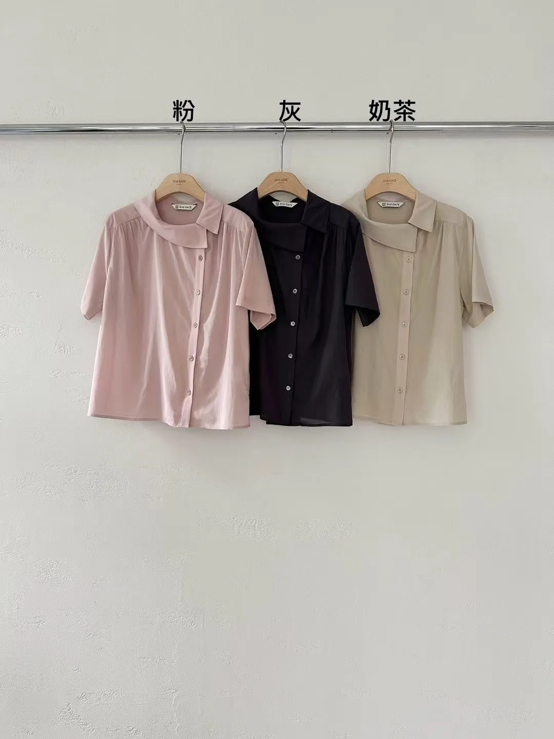 GM767空姐領斜釦襯衫 粉 灰 奶茶 官網價$1080 線上價$1050萊賽爾纖維+縲縈+棉 涼感舒適 肩線細抓皺 側小開叉 L號友善肩寬40胸寬55袖長22全長56以下奶茶色穿搭👇🏻 以下顏色,如圖所示