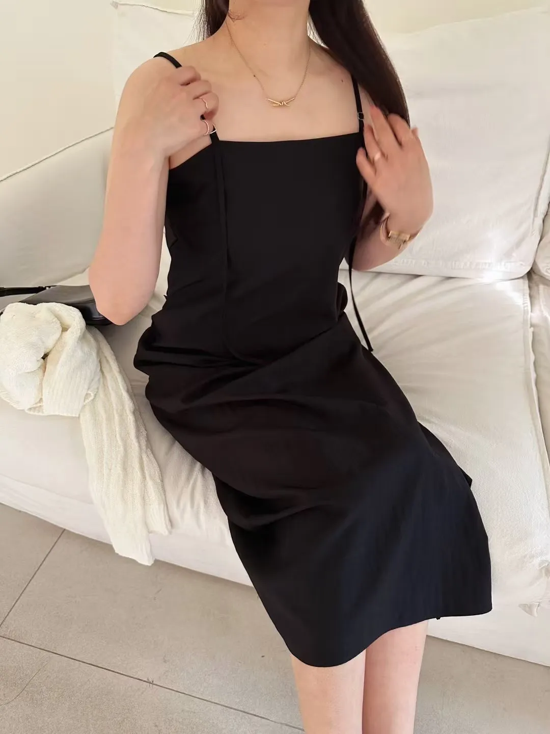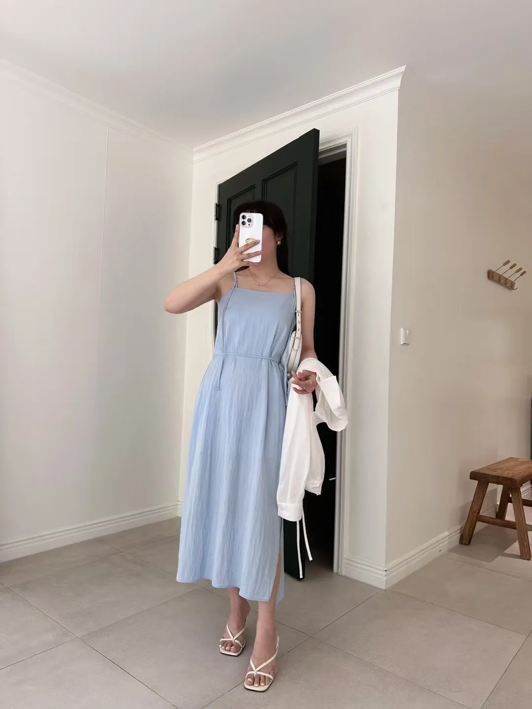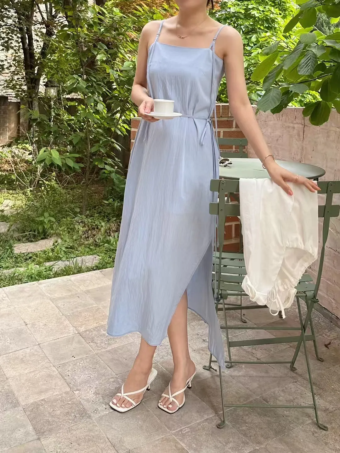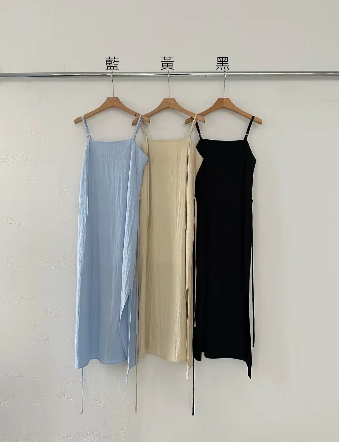 縲縈+尼龍 肩帶可調整 腰帶設計 側腿開叉 有內裡 後拉鍊穿脫