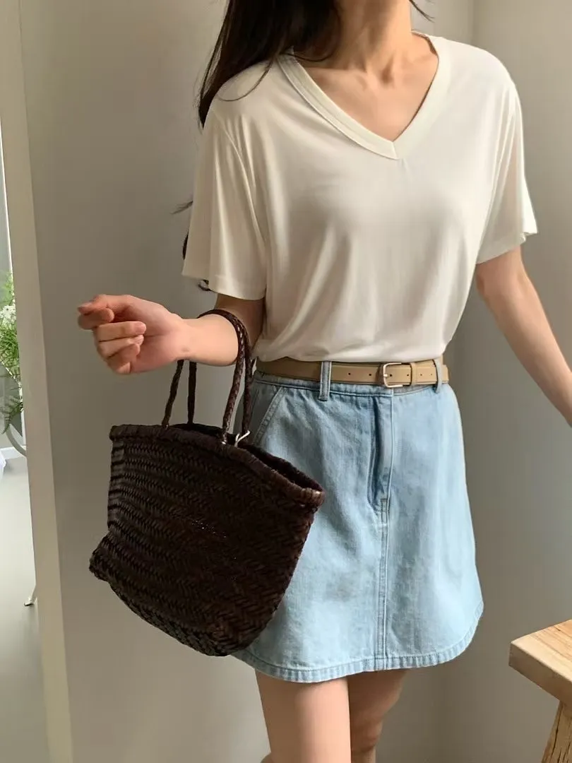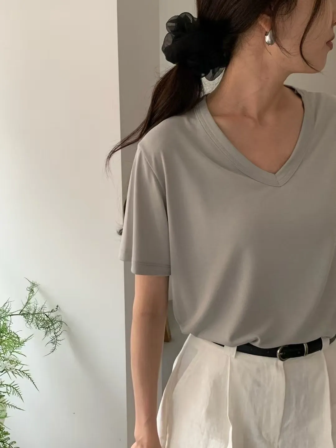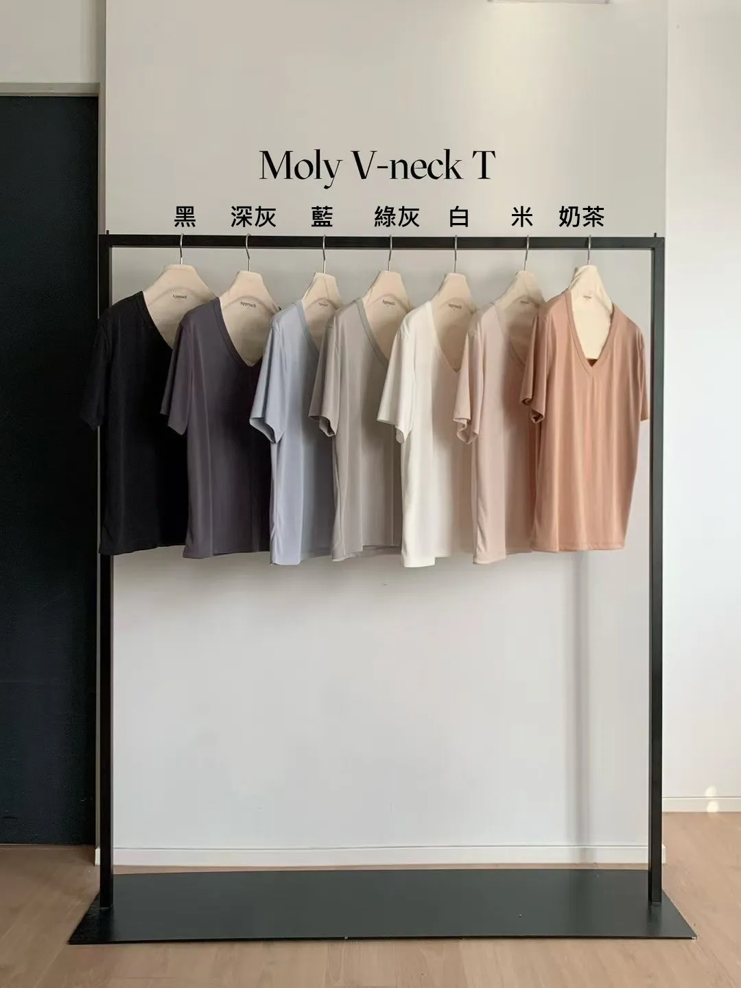 莫代爾+彈力纖維 涼感舒適 夏天很舒服 V領車線加固