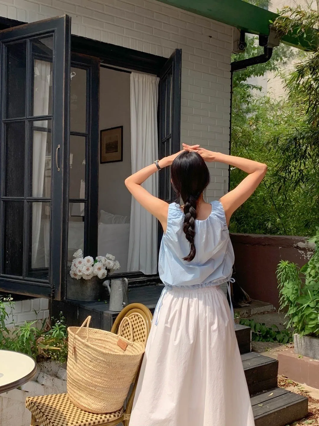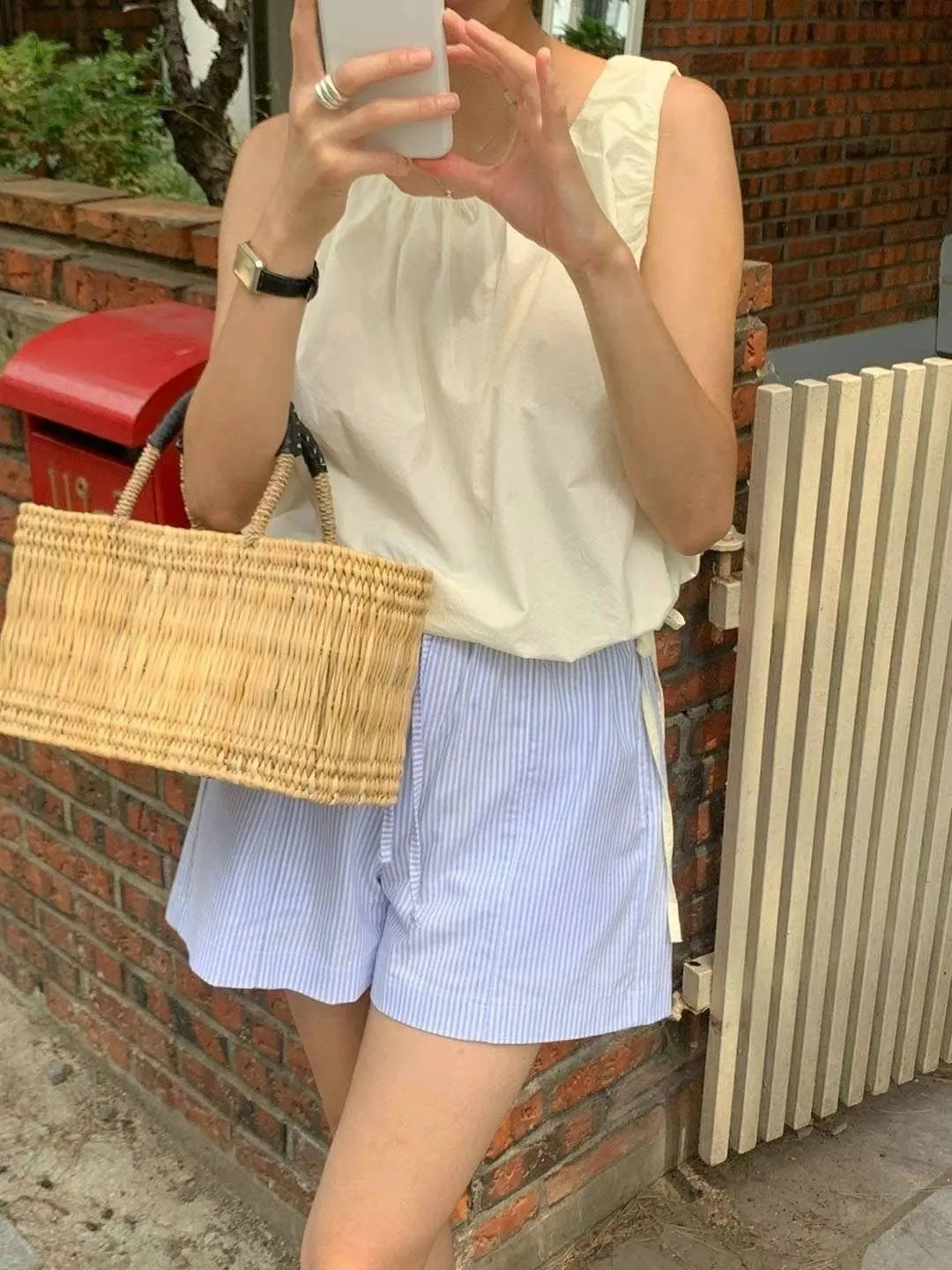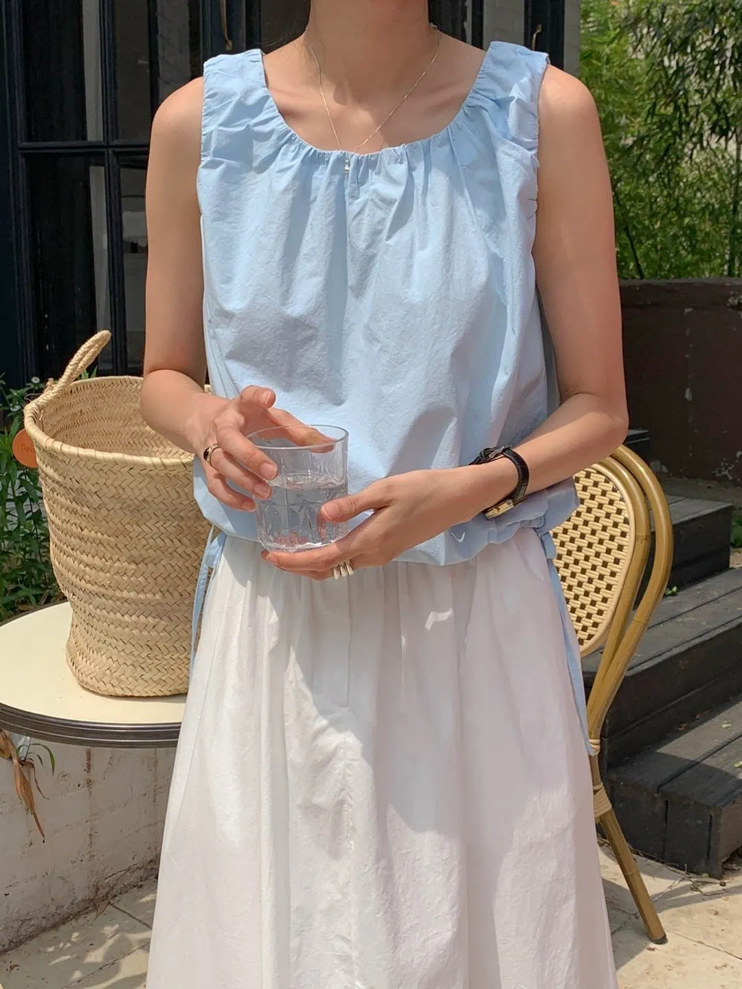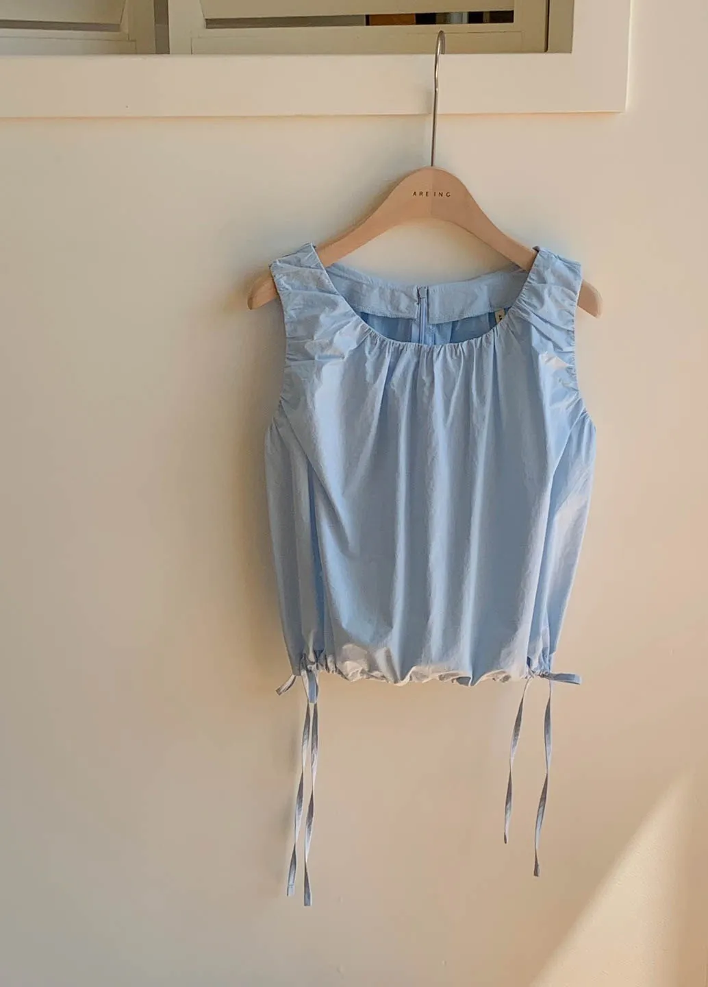 HJ019雲朵寬肩帶側腰雙綁帶無袖上衣 白 米 藍 官網價$670 線上價$640