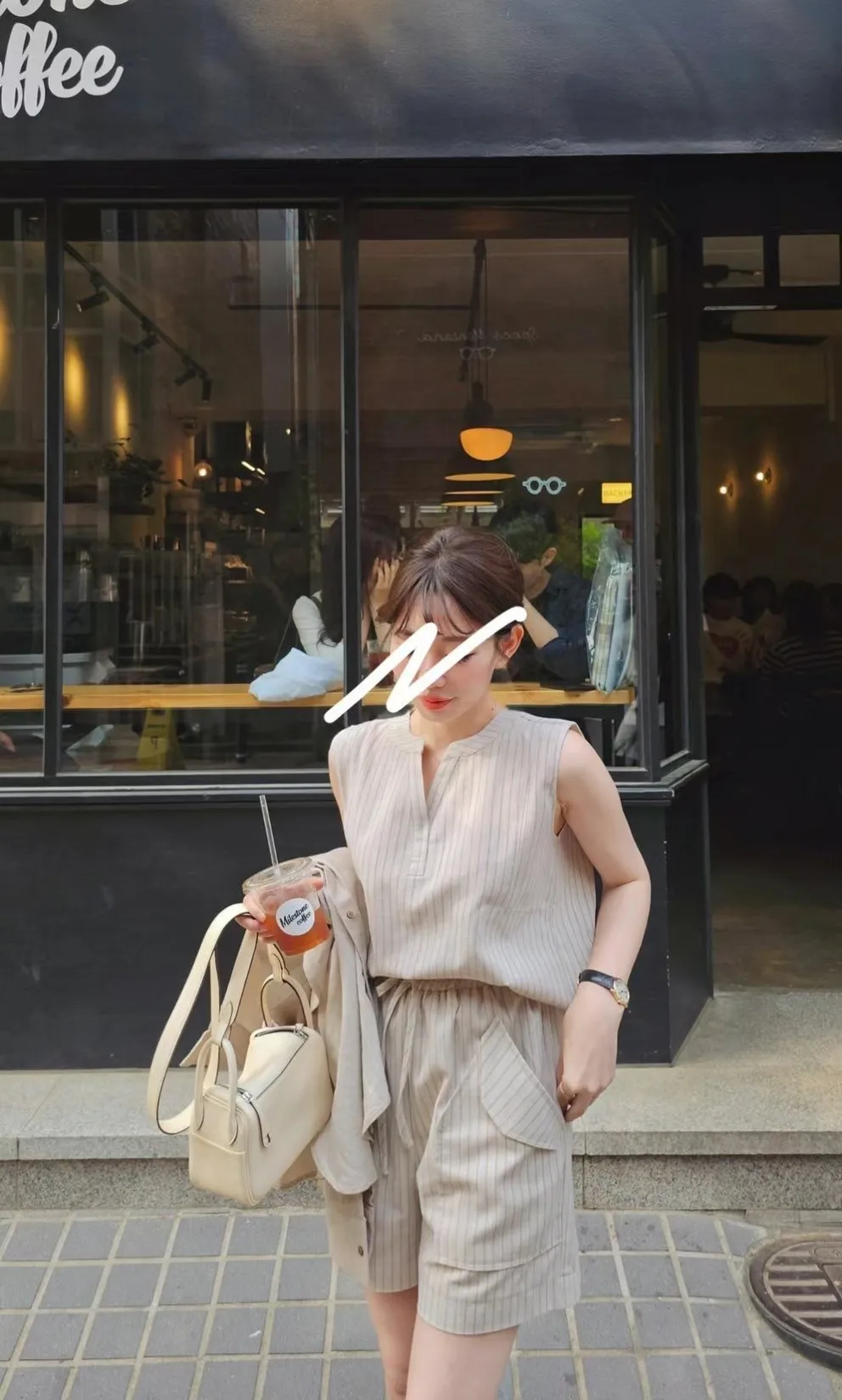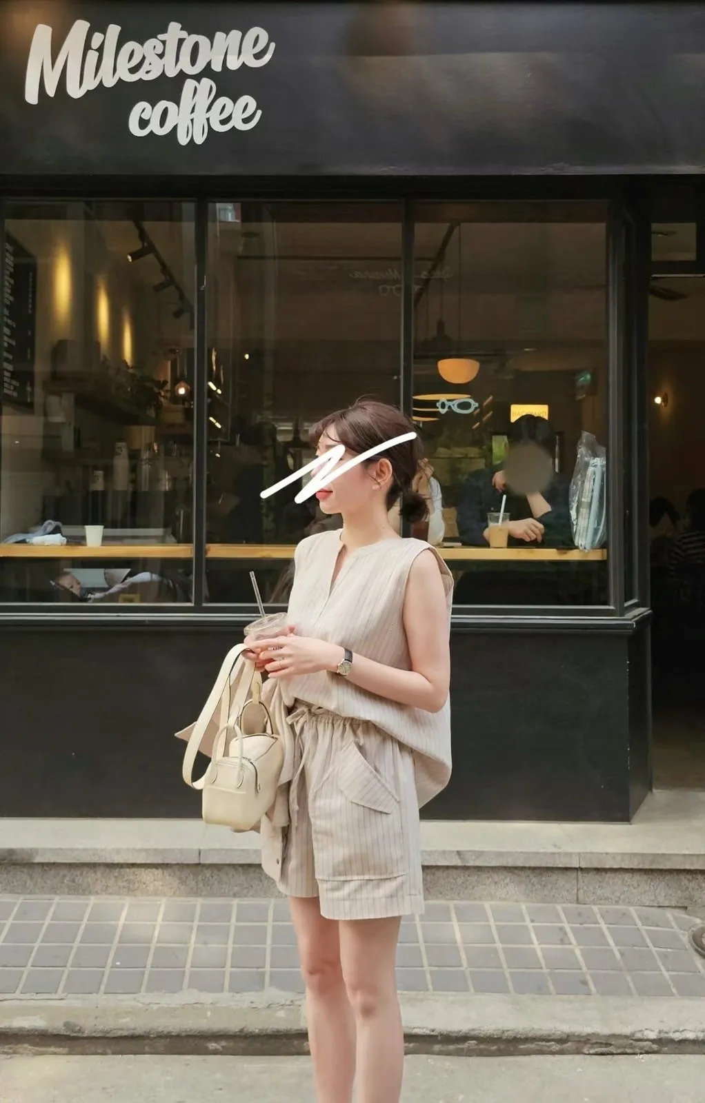 HJ055套裝的V領細條紋上衣 奶茶 藍 官網價$1080 線上價$1050