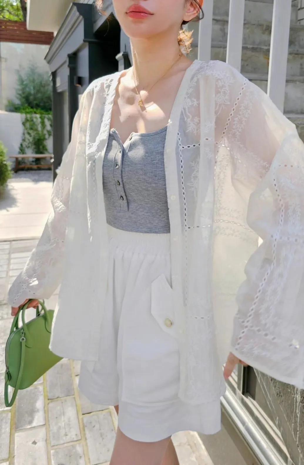 縲縈+棉+聚酯 微光澤紡紗刺繡 細緻簍空 珍珠母貝釦 敏肌略過