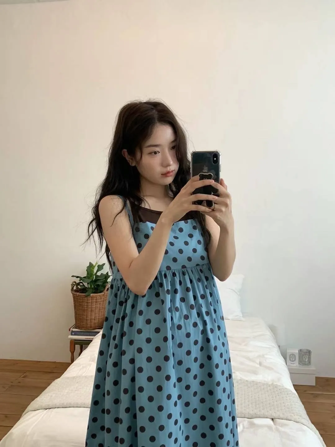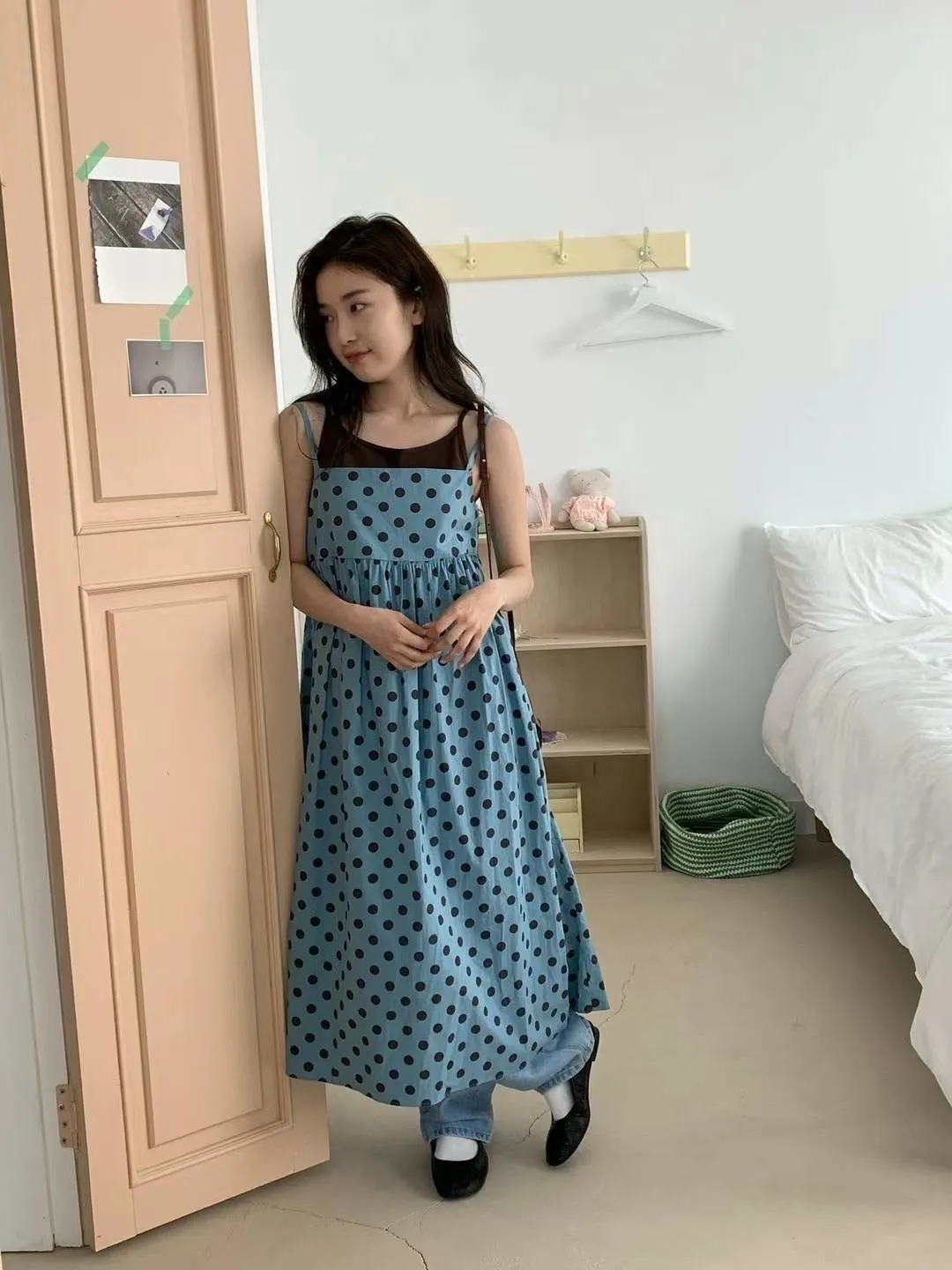 棉100% 無口袋 傘擺顯瘦 無內裡 藍色洋裝的點點是咖色