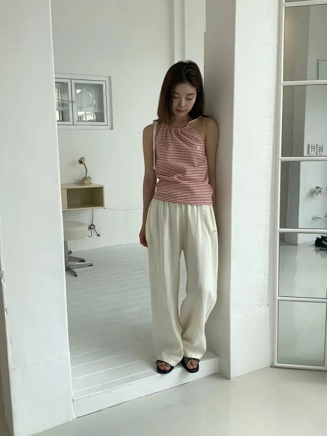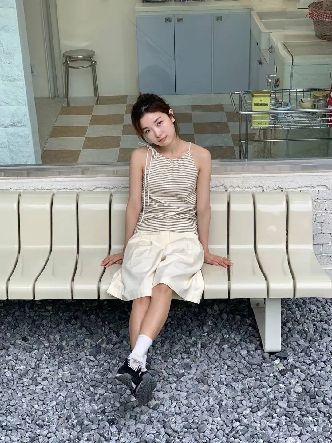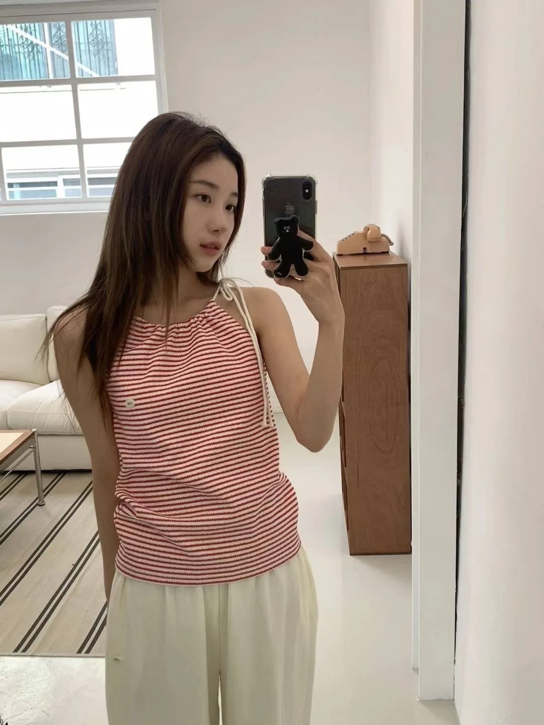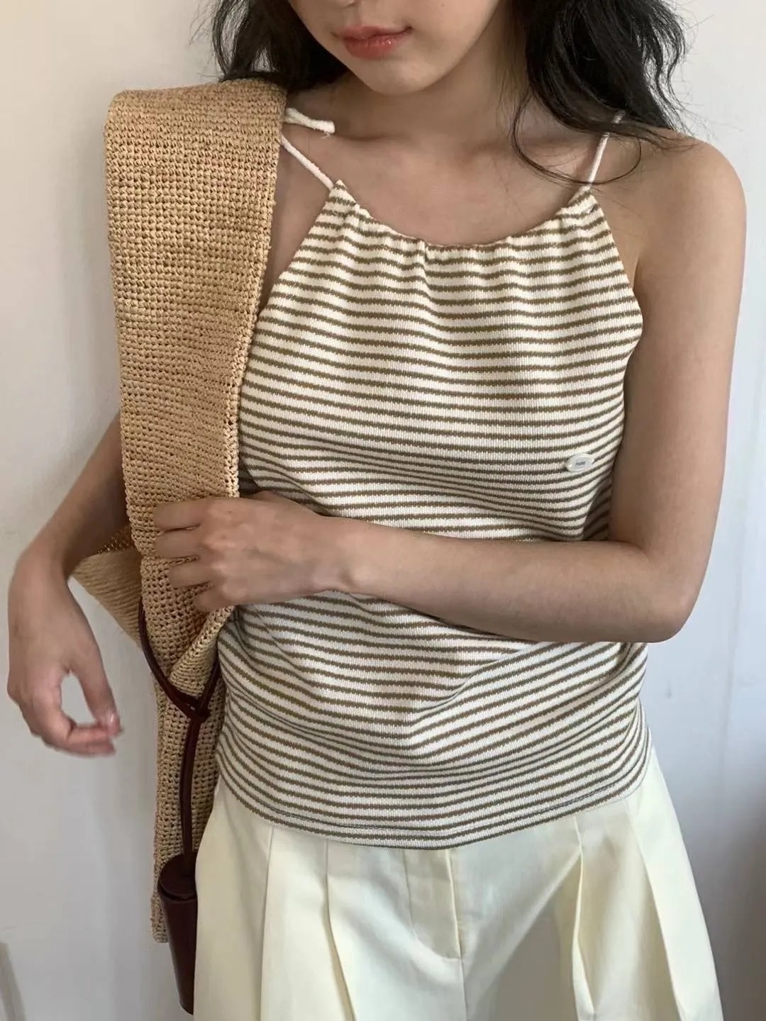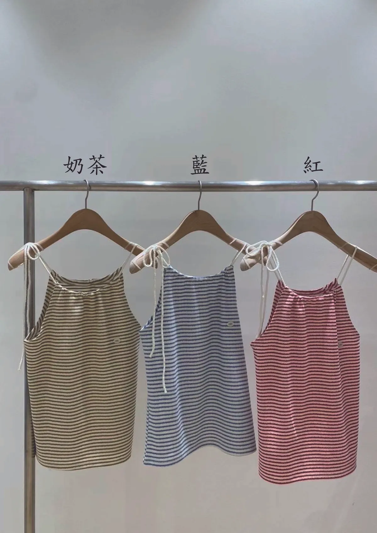 HJ074細肩帶綁繩條紋上衣 藍 紅 奶茶 官網價$570 線上價$540