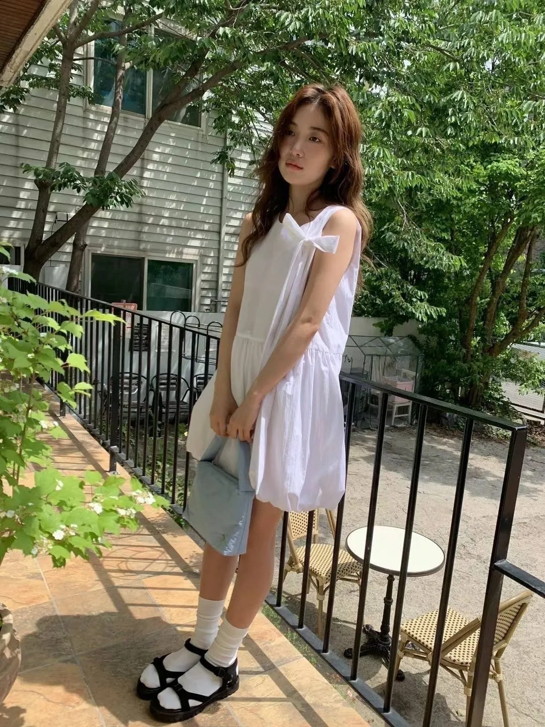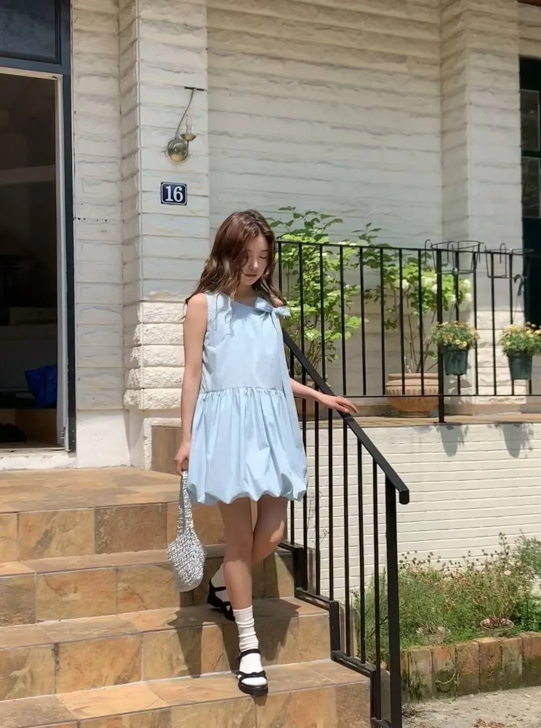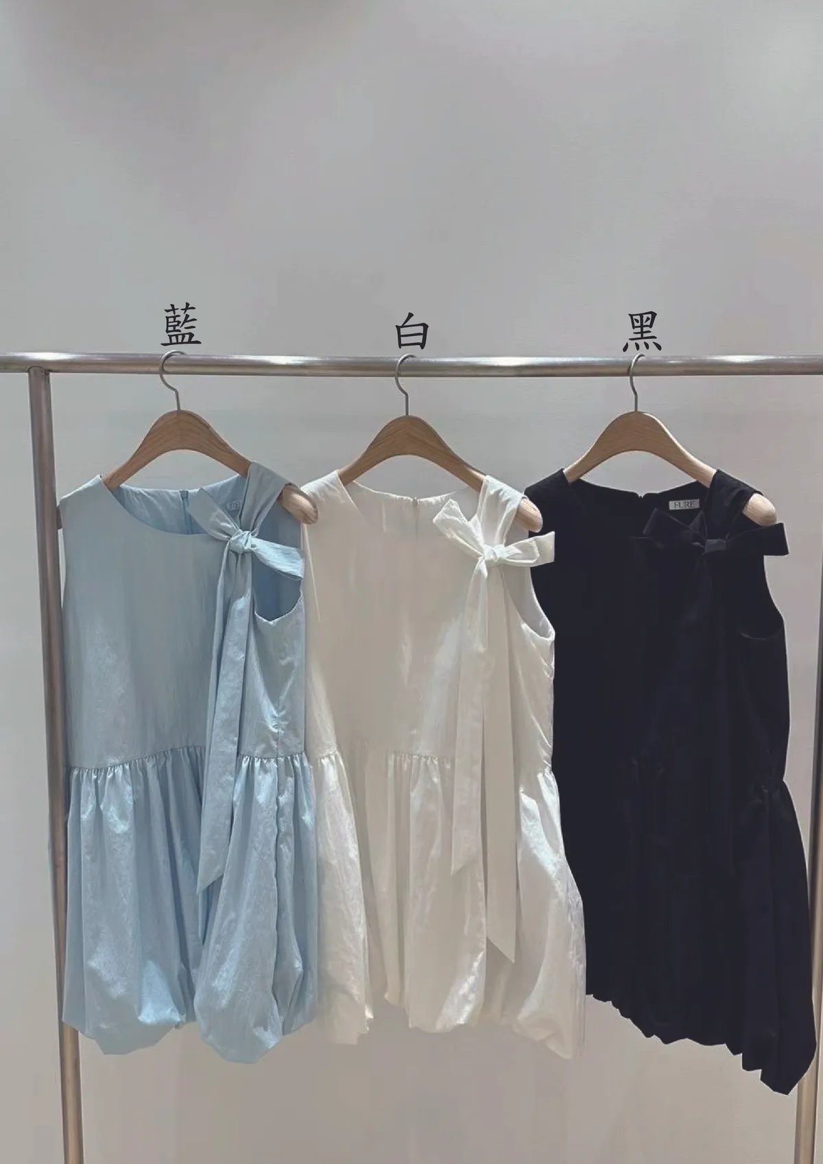 HJ087側肩蝴蝶結南瓜裙洋裝 白 藍 黑 官網價$1420 線上價$1390