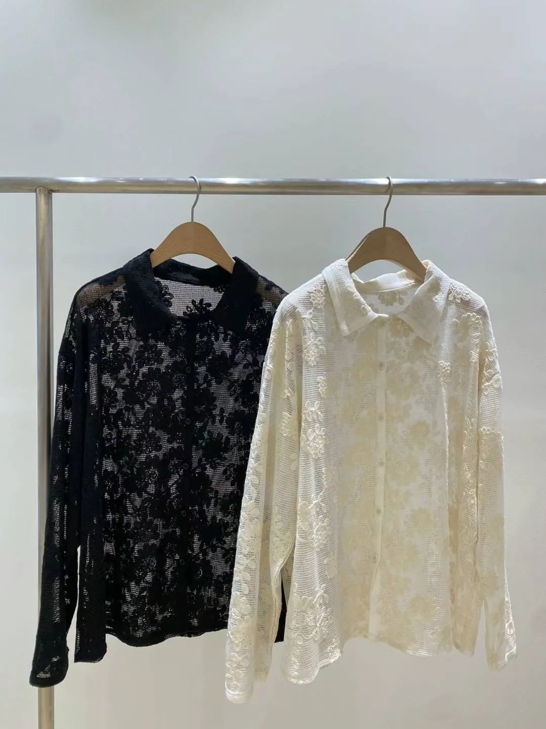 HJ090精緻花朵刺繡蕾絲透光罩衫 米 黑 官網價$1290 線上價$1260