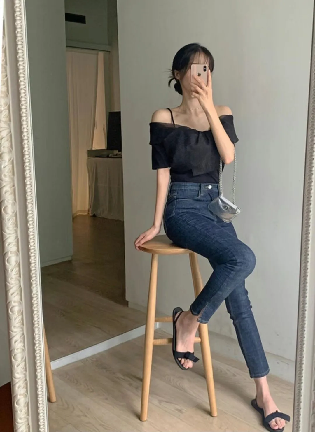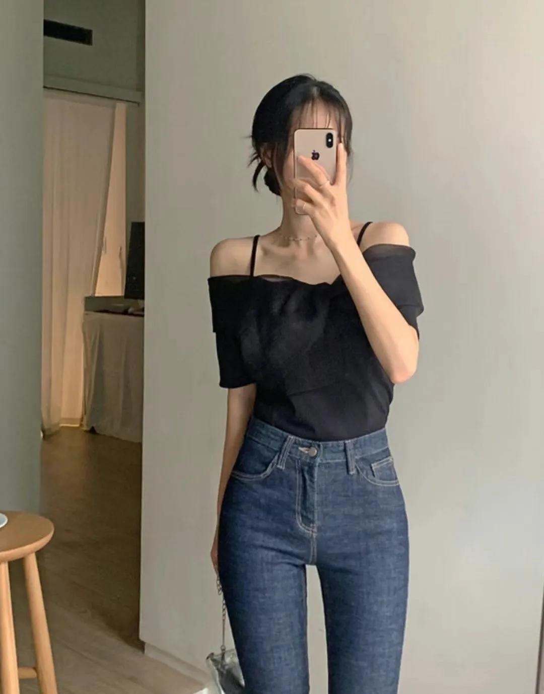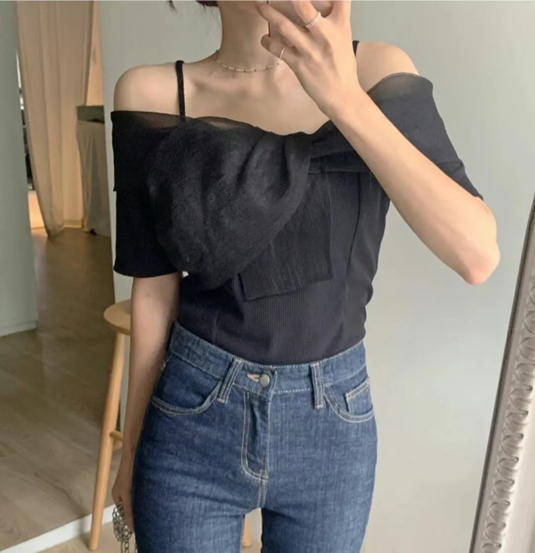 棉+聚酯+彈力 親膚舒適 彈性佳 細細肩帶一字領感