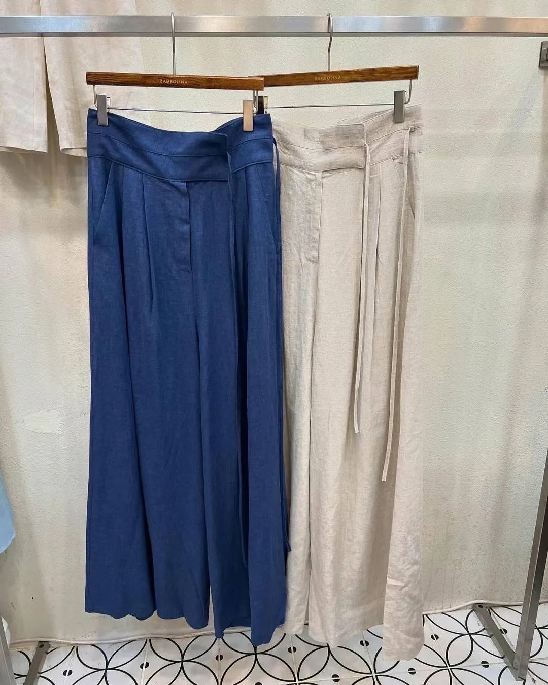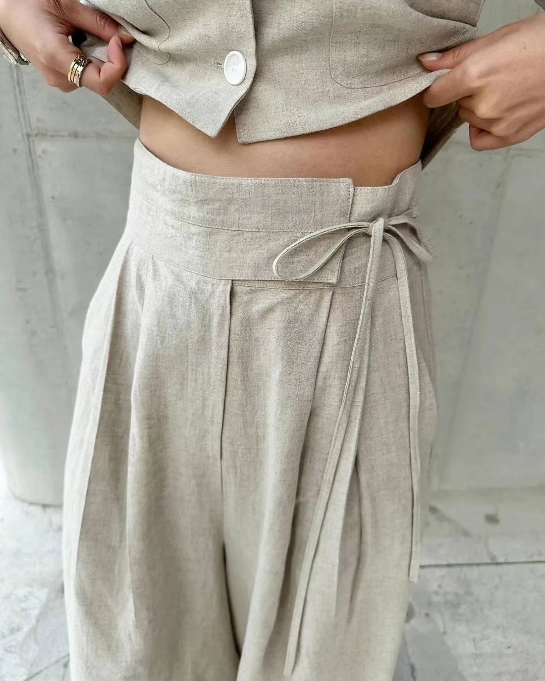 HJ1033寬腰帶側綁大寬褲 燕麥 藍 S M 官網價$1470 線上價$1440