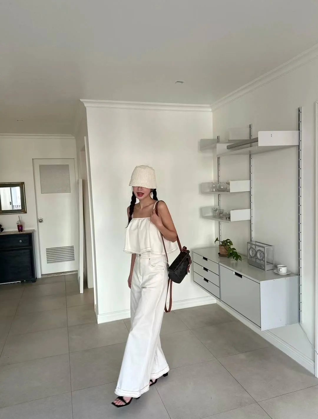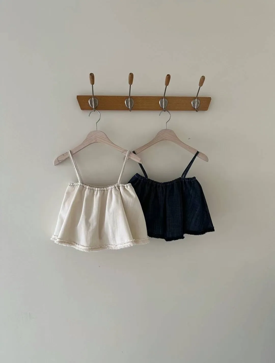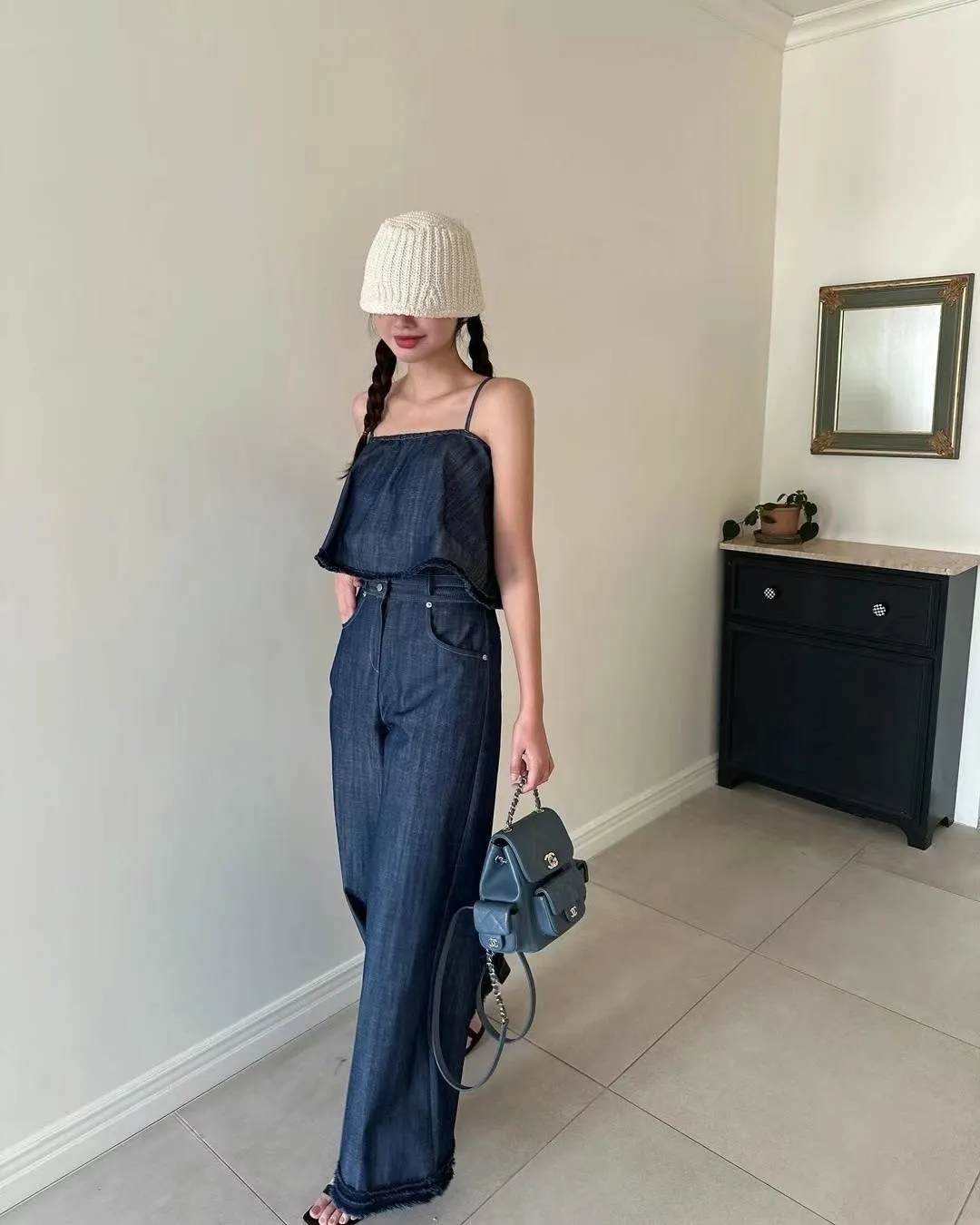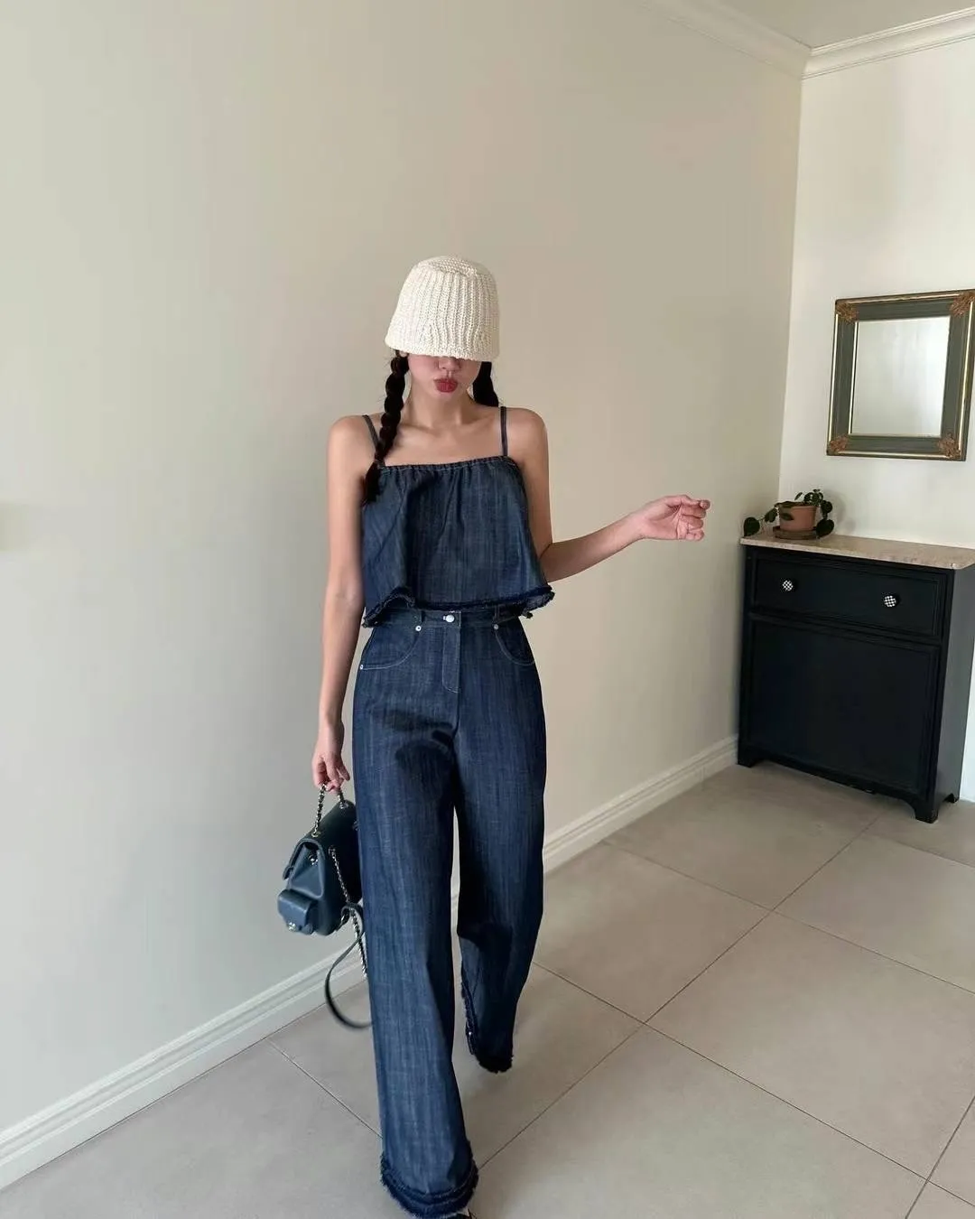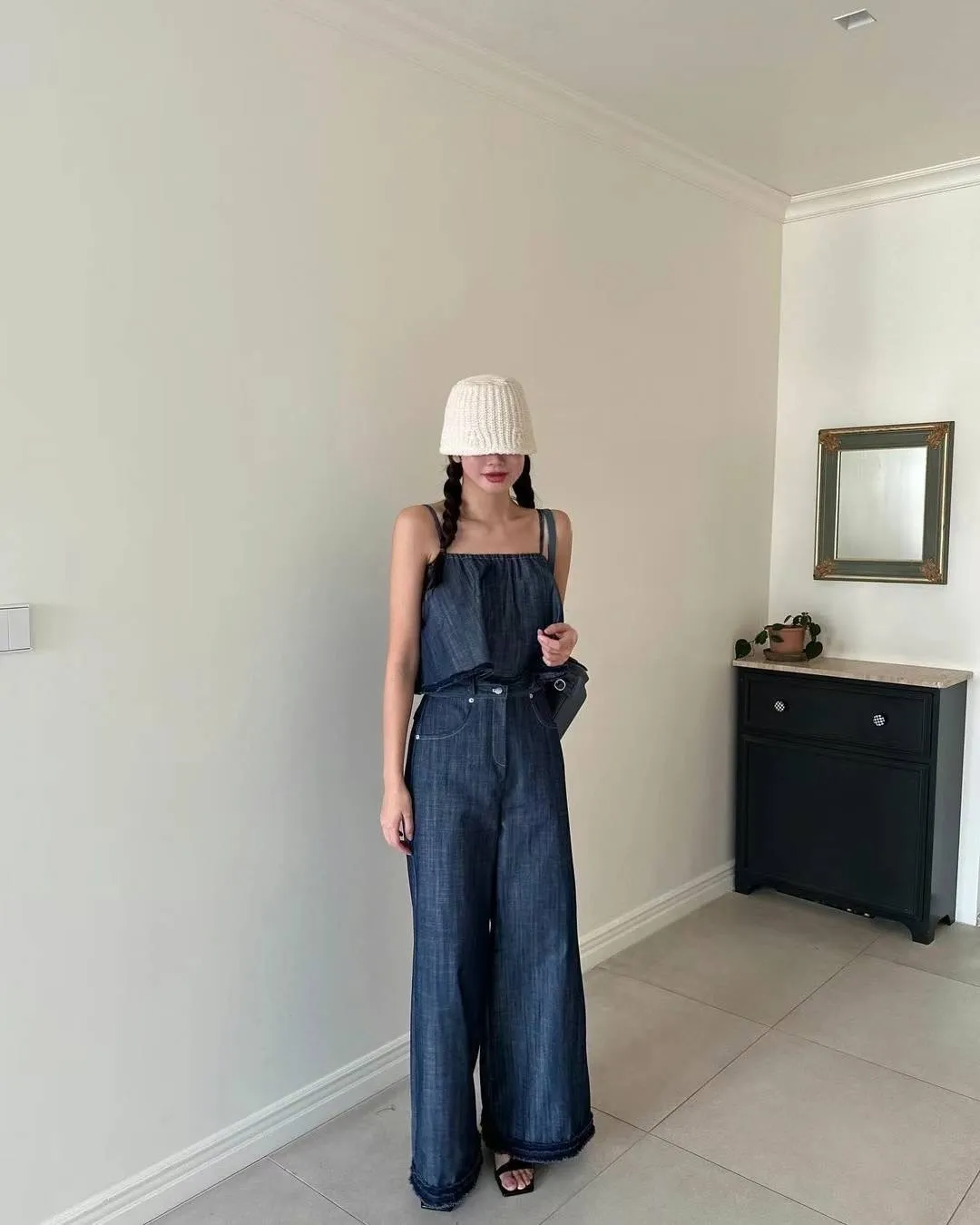 HJ1036套裝的細肩帶雙層丹寧上衣 米 藍 官網價$1180 線上價$1150
