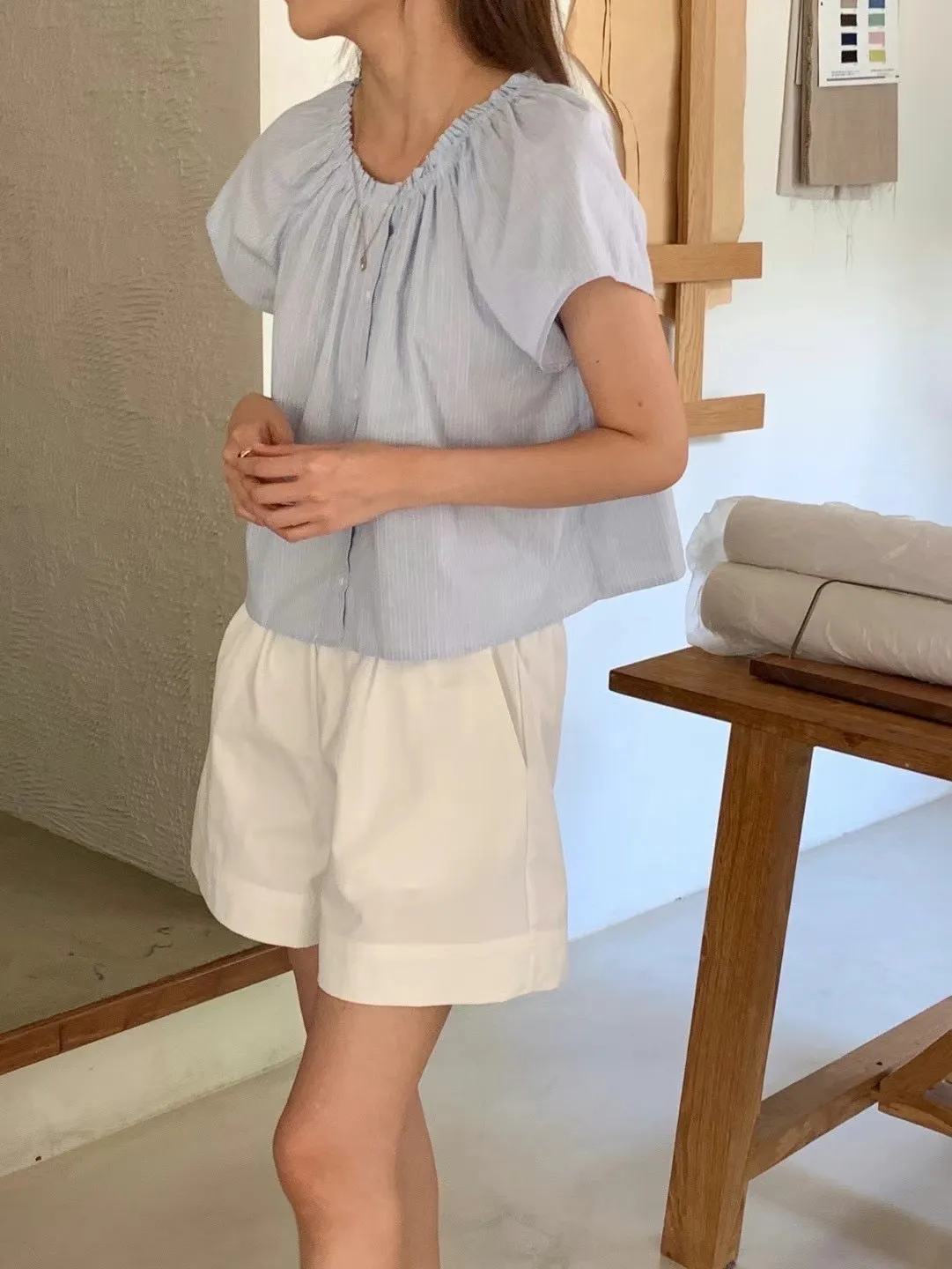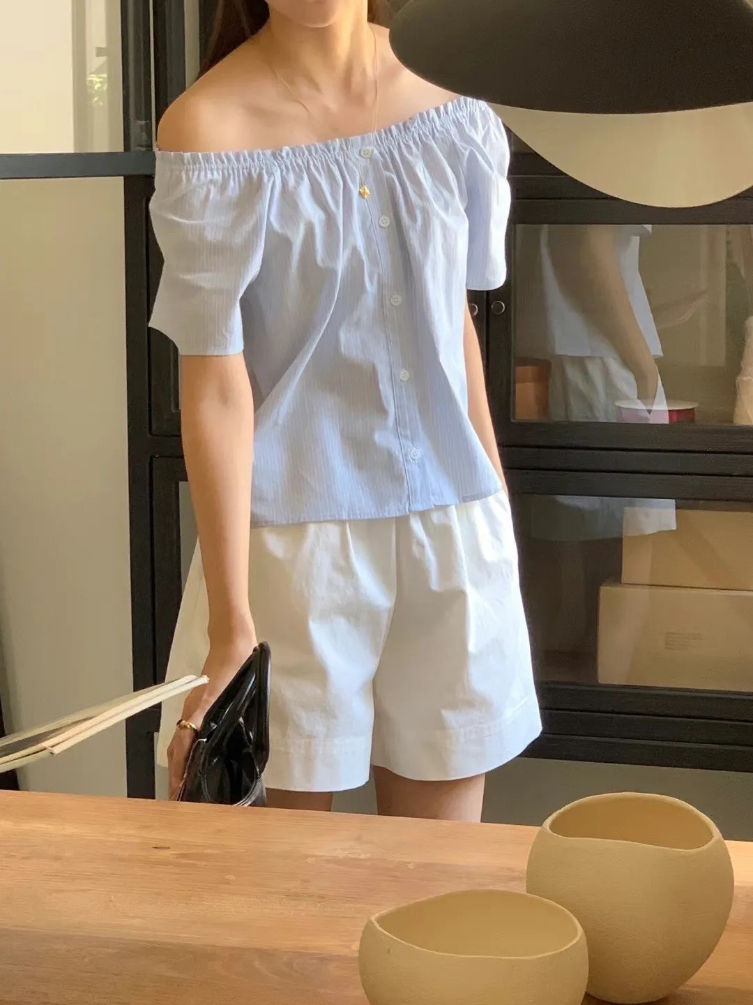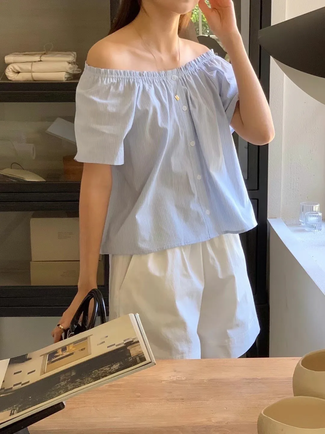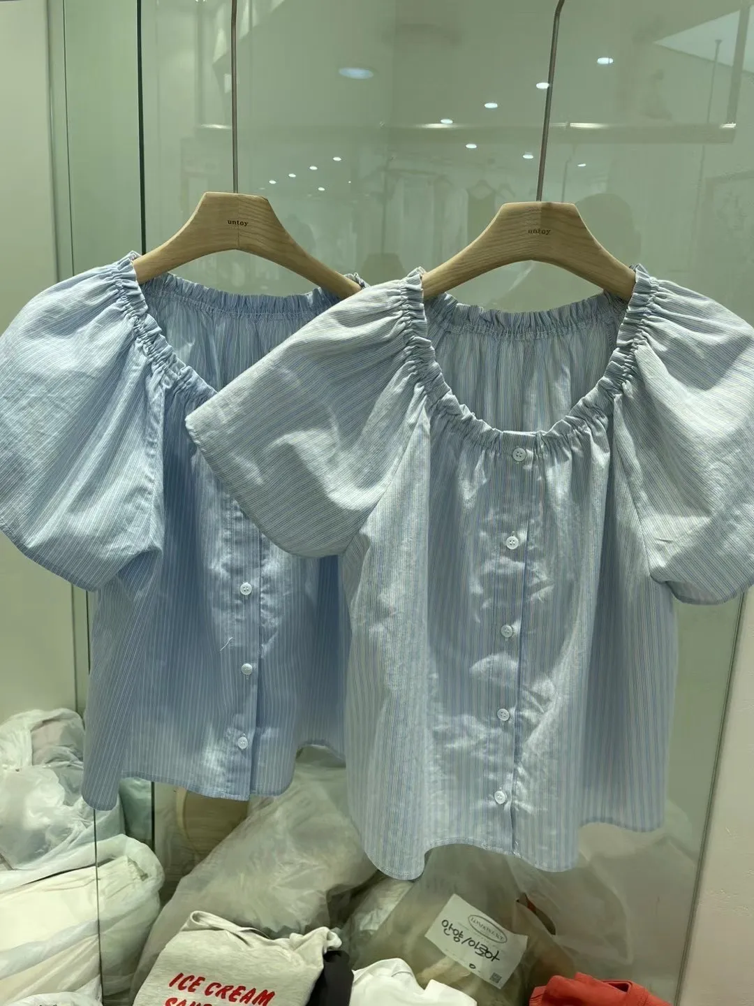HJ1063網美條紋一字鬆緊上衣 米 藍 官網價$ 680 線上價$650