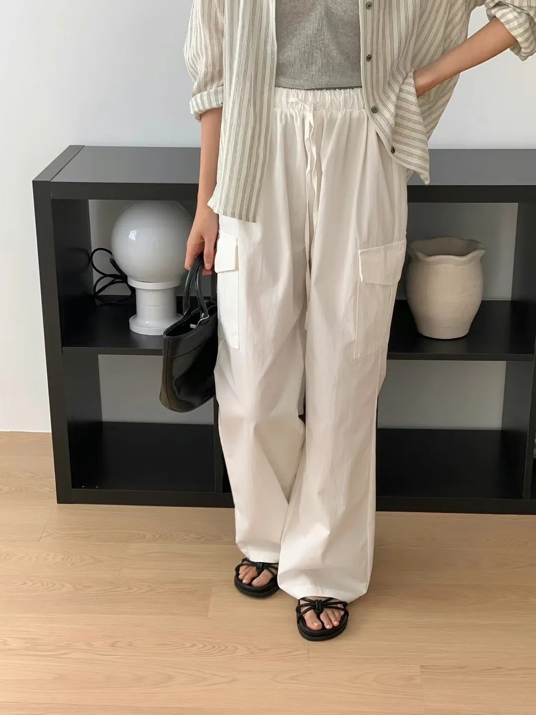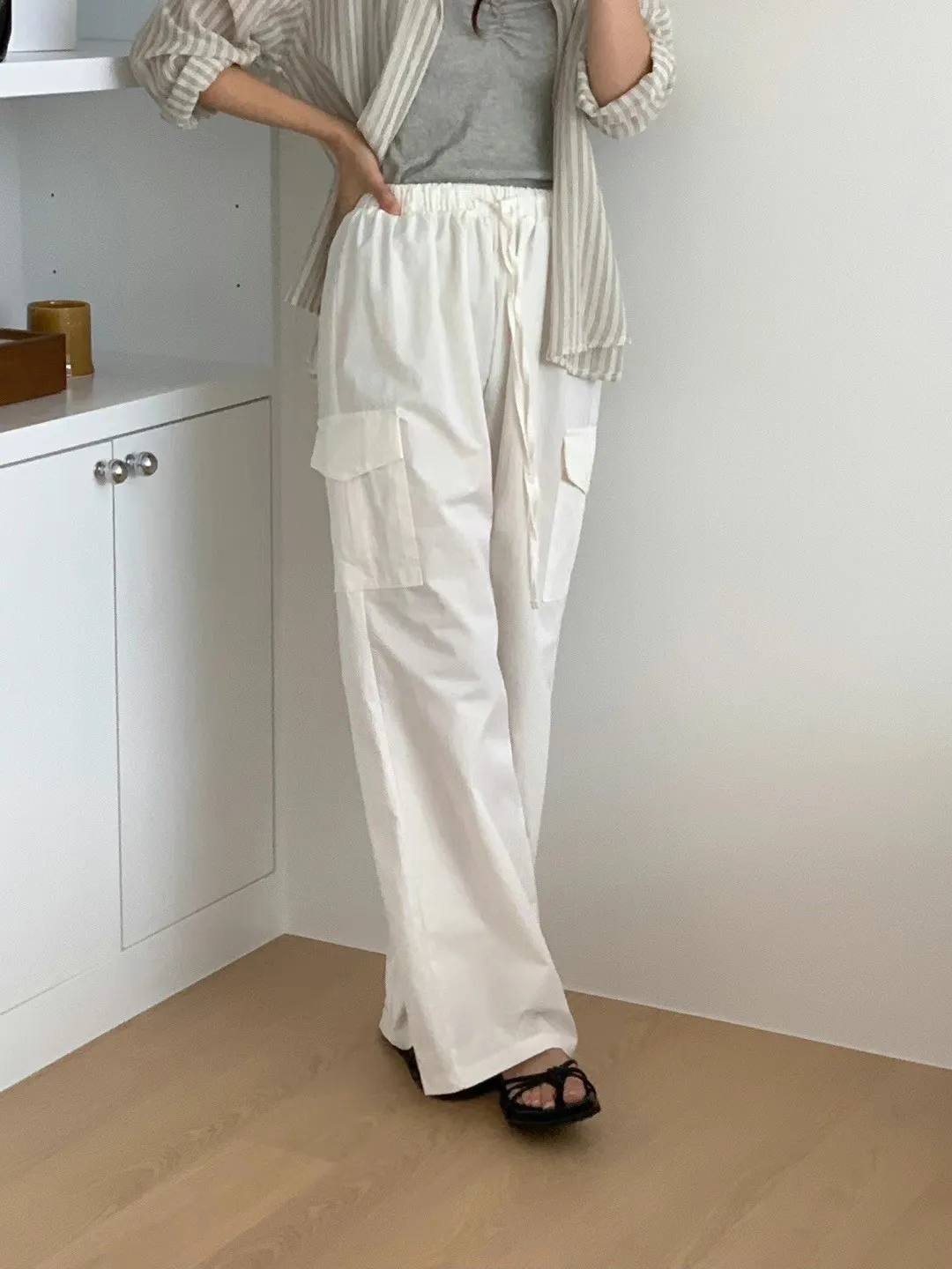 棉 全腰鬆緊有抽繩 雙側口袋 只有側面有口袋 白微透