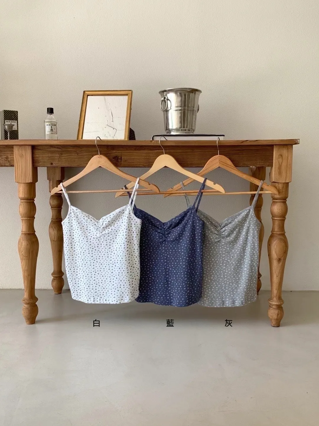 HJ1079桃心領胸抓皺小碎花背心 白 藍 灰 官網價$380 線上價$350
