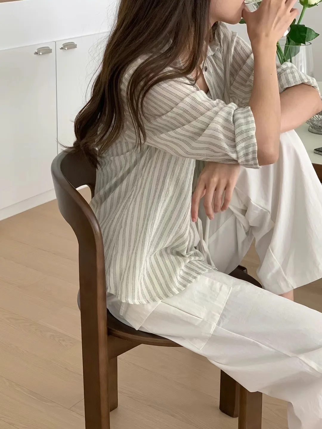 HJ1088亞麻柔軟舒適長袖襯衫 米 藍 官網價$770 線上價$740