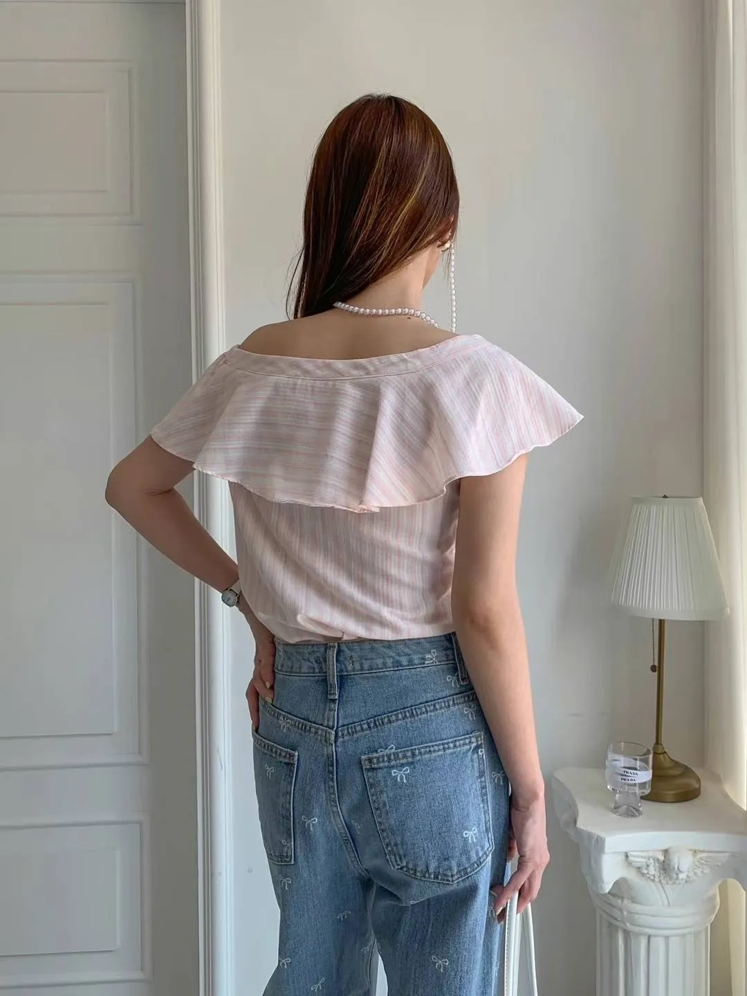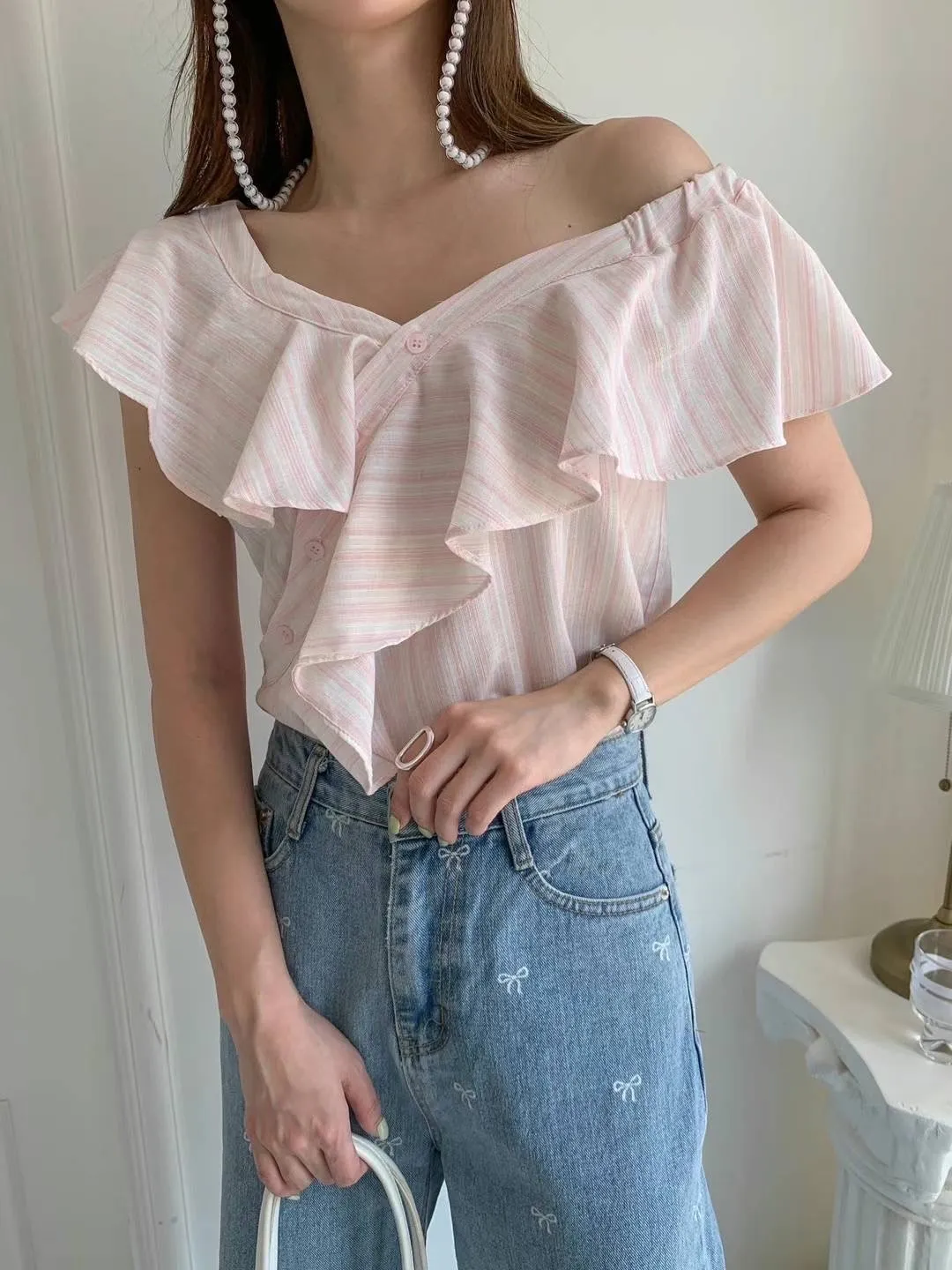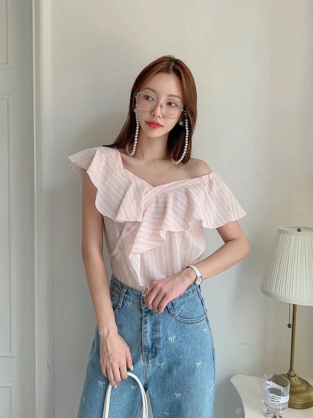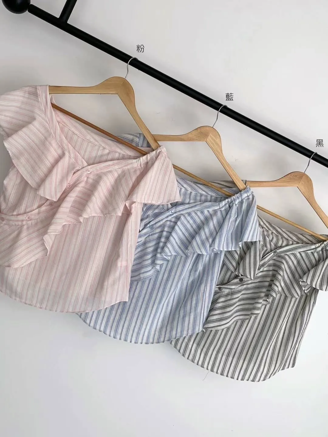 HJ1101斜釦美肩設計條紋上衣 藍 粉 黑 官網價$920 線上價$890
