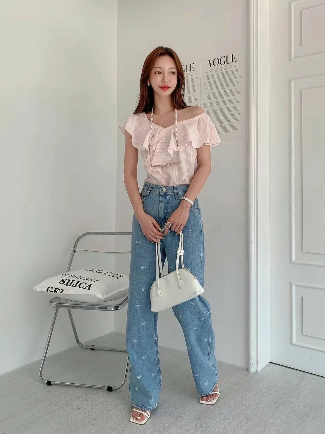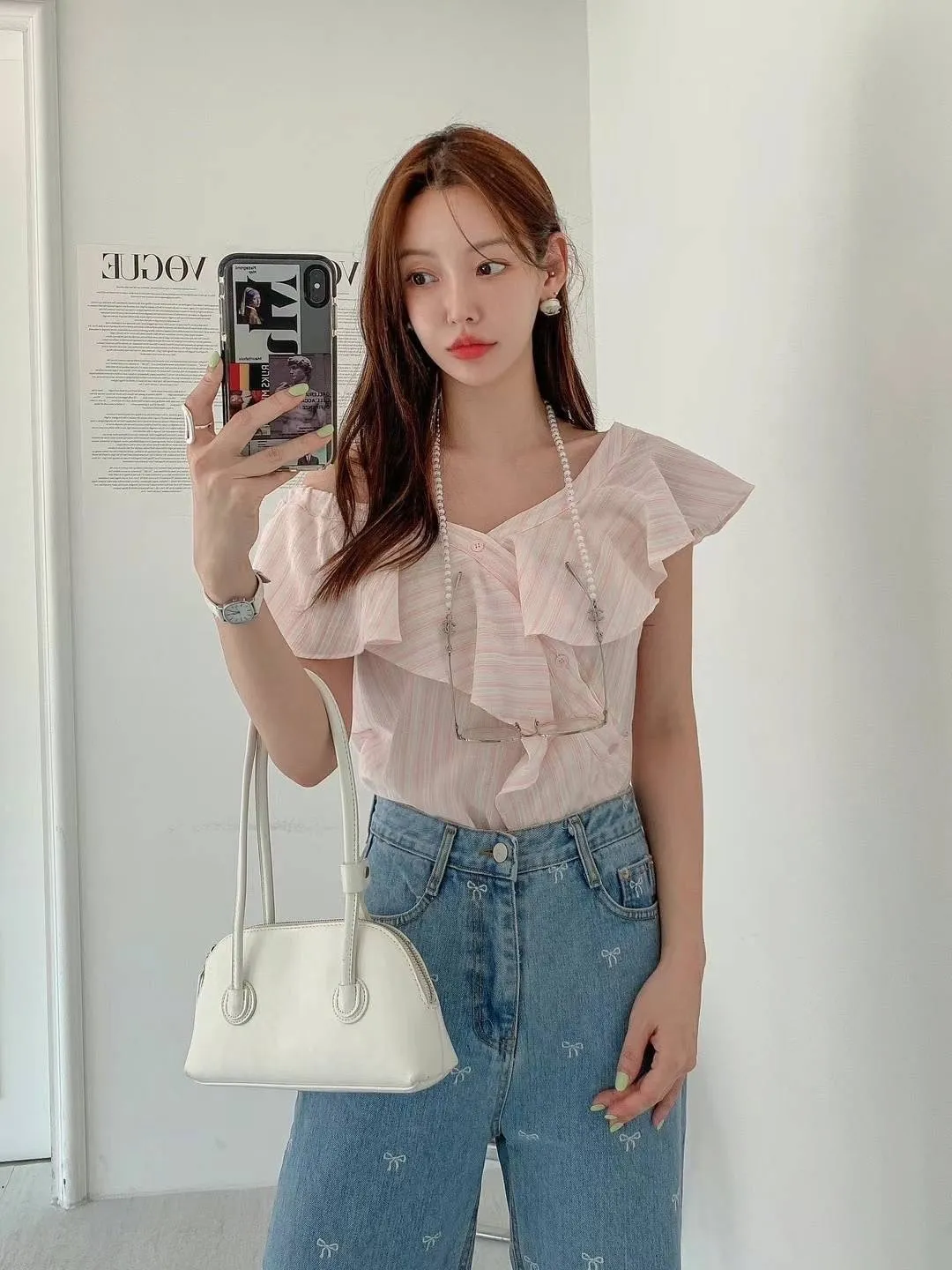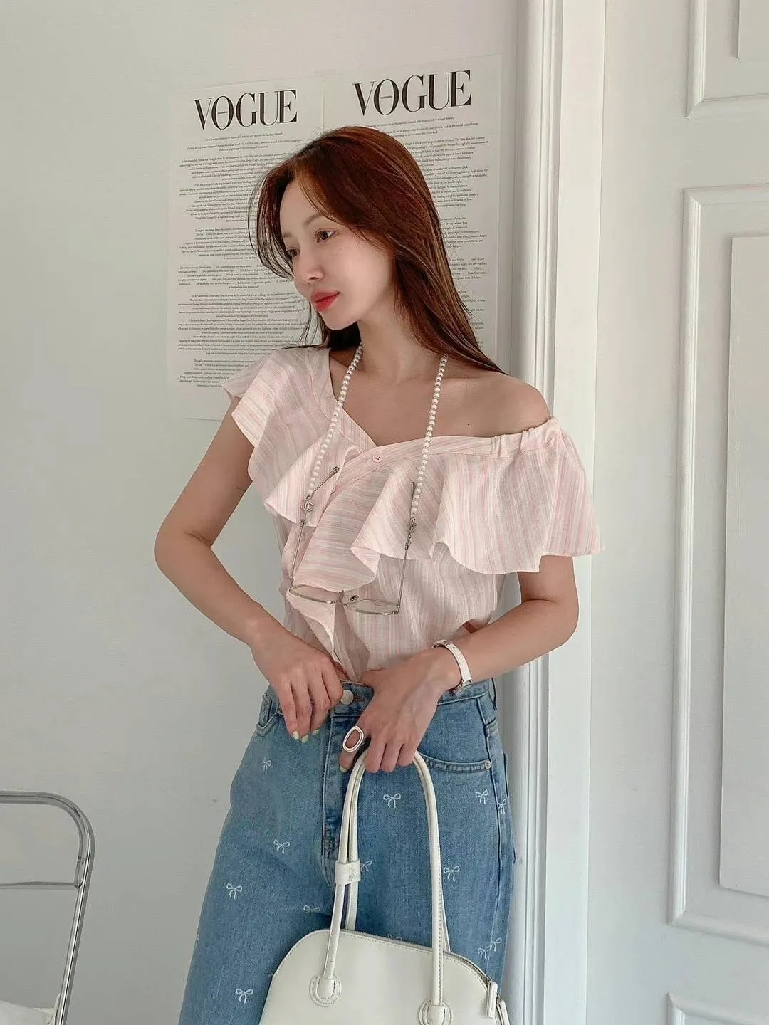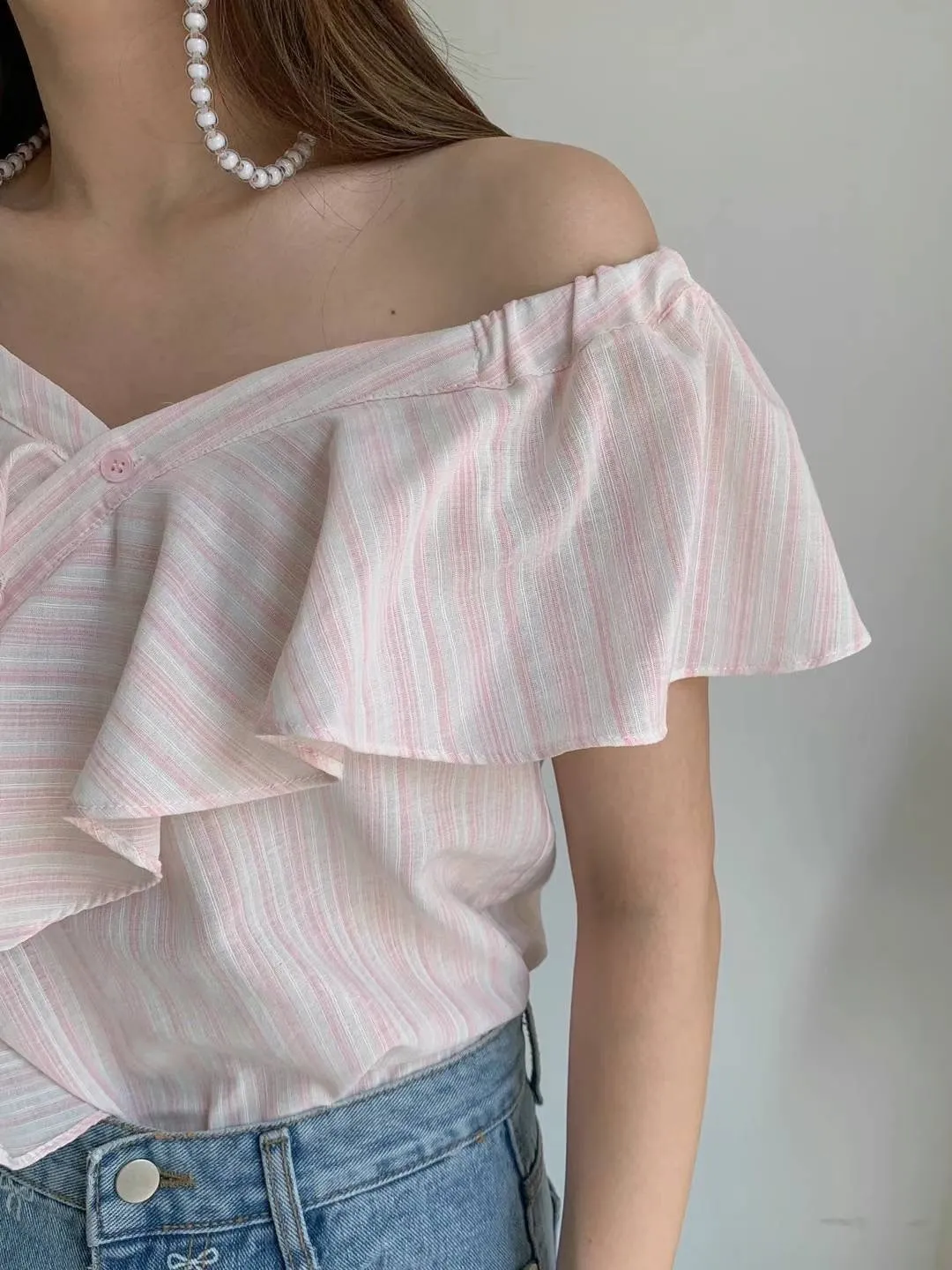 HJ1101斜釦美肩設計條紋上衣 藍 粉 黑 官網價$920 線上價$890