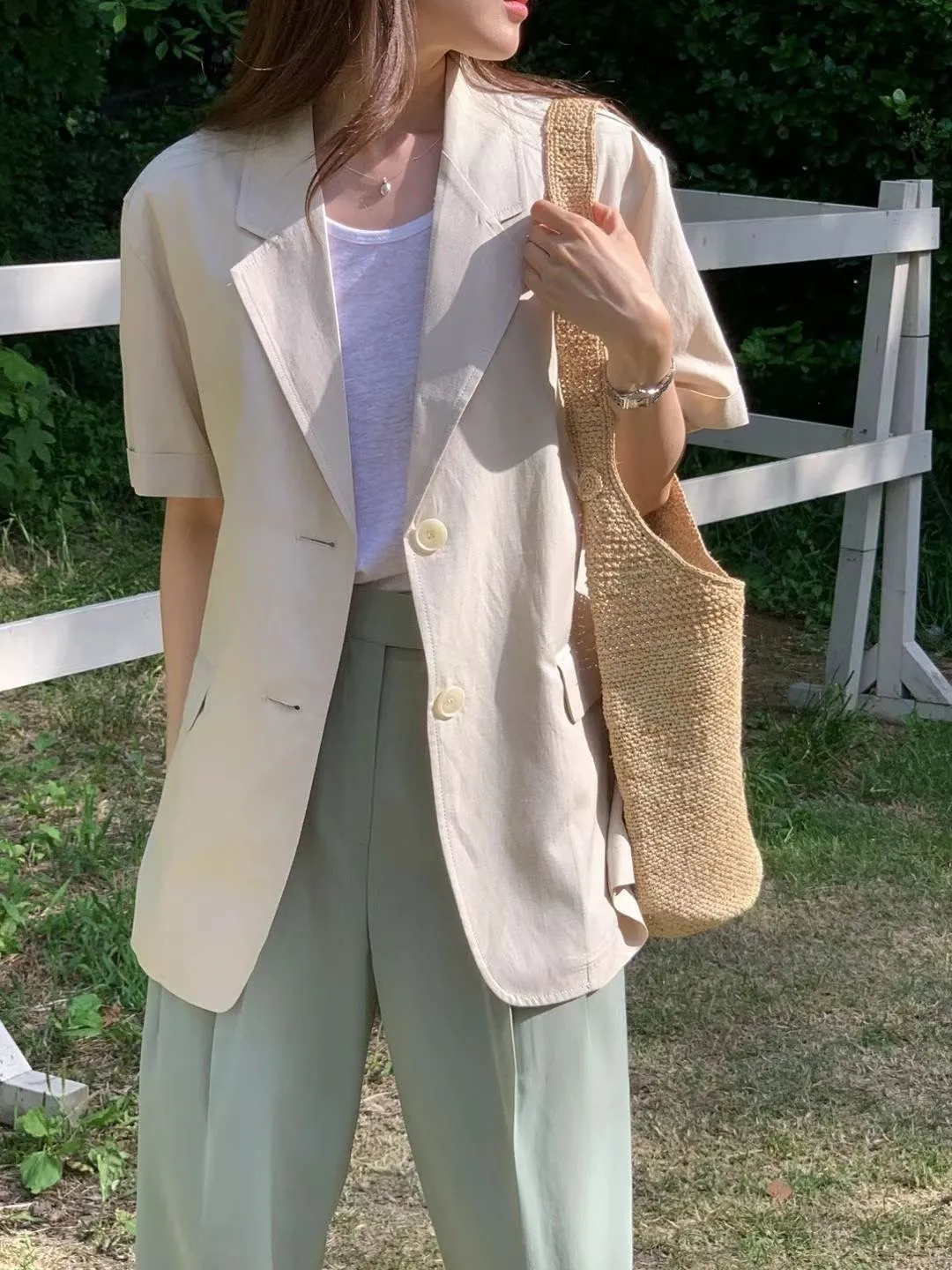 棉+麻+聚酯,肩寬48胸寬58臂寬26袖長22袖口20全長64