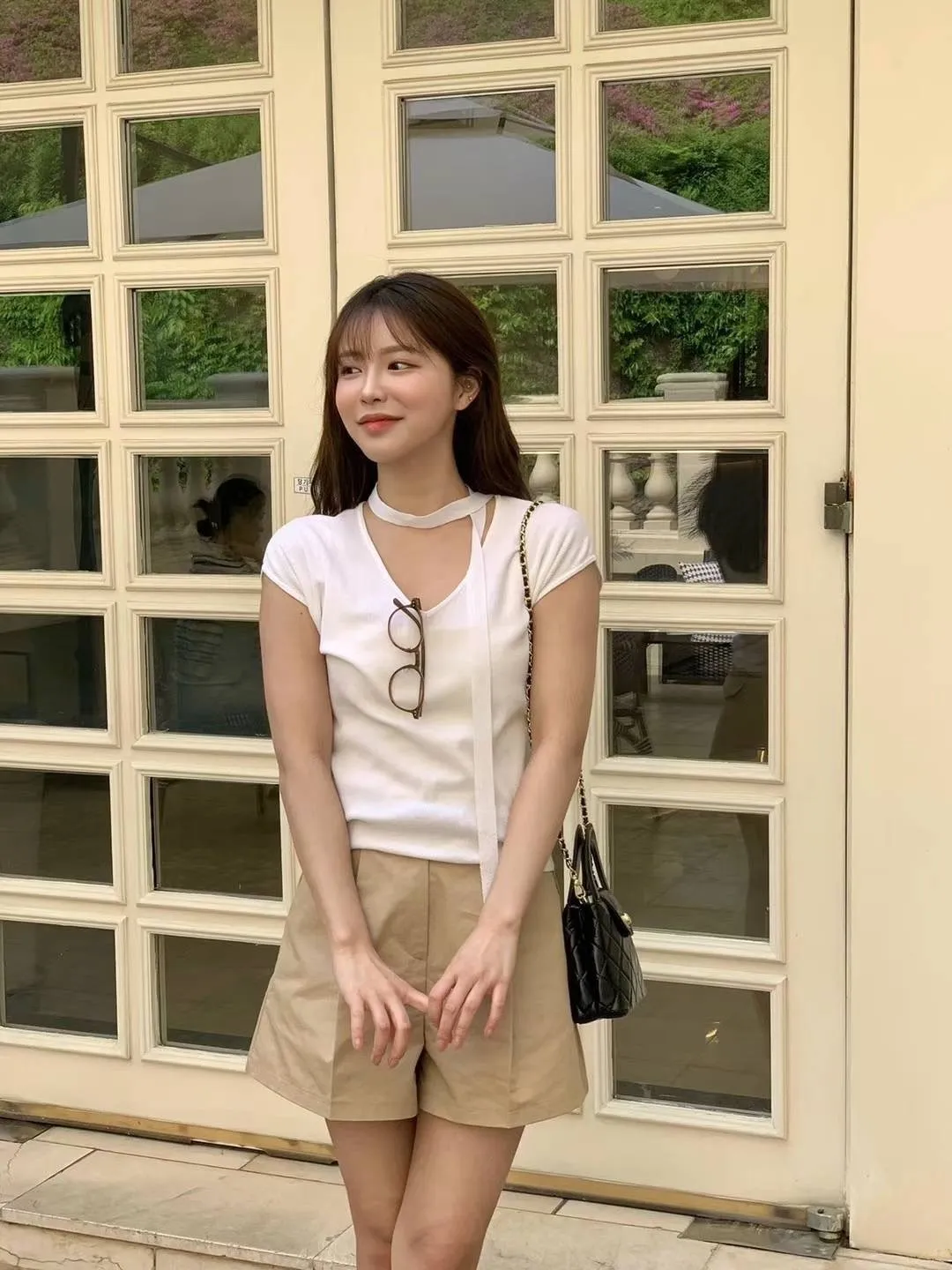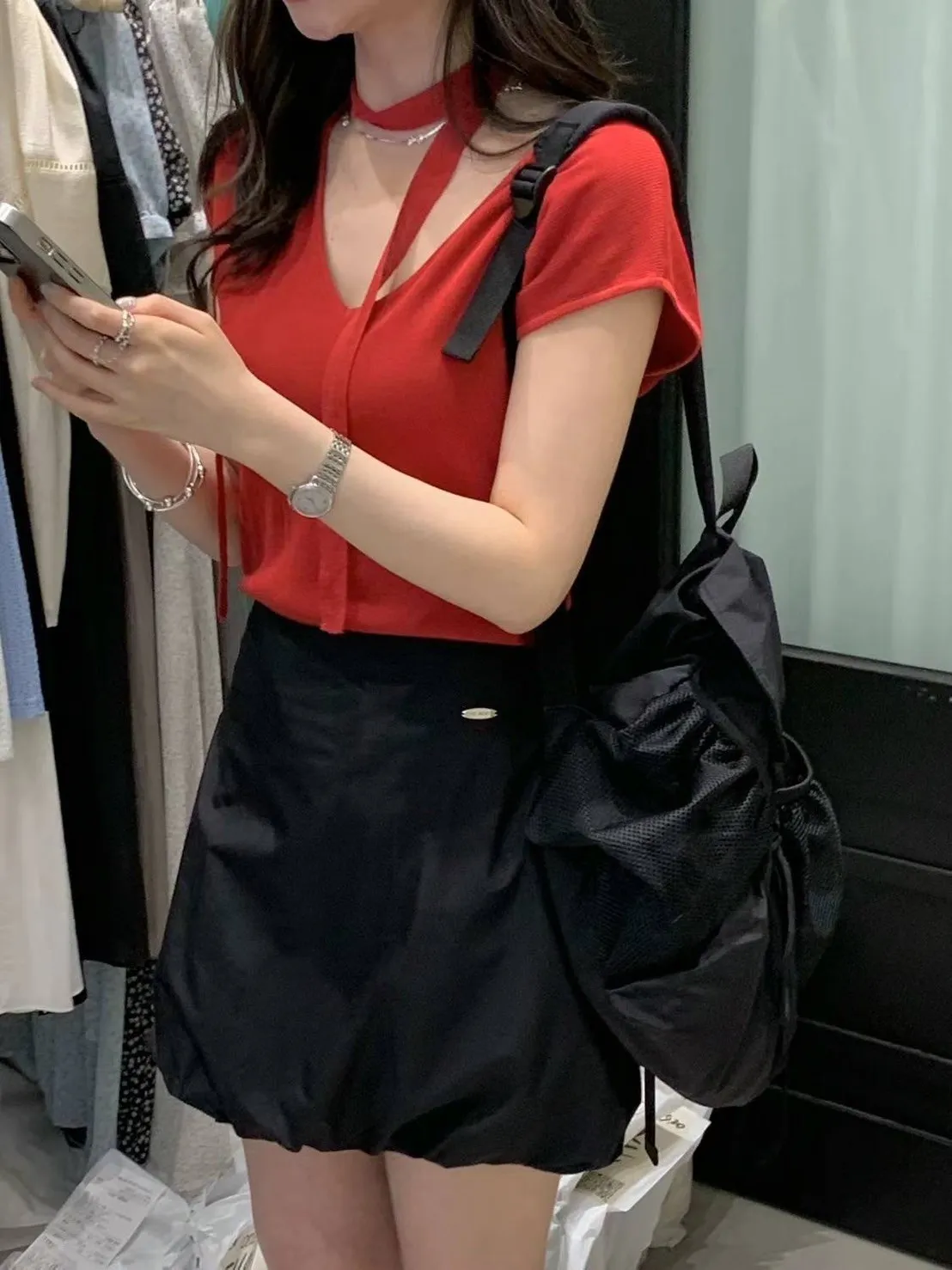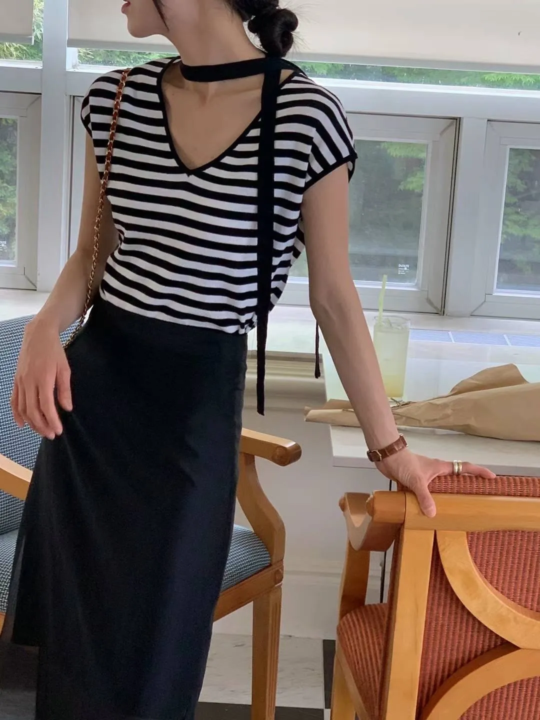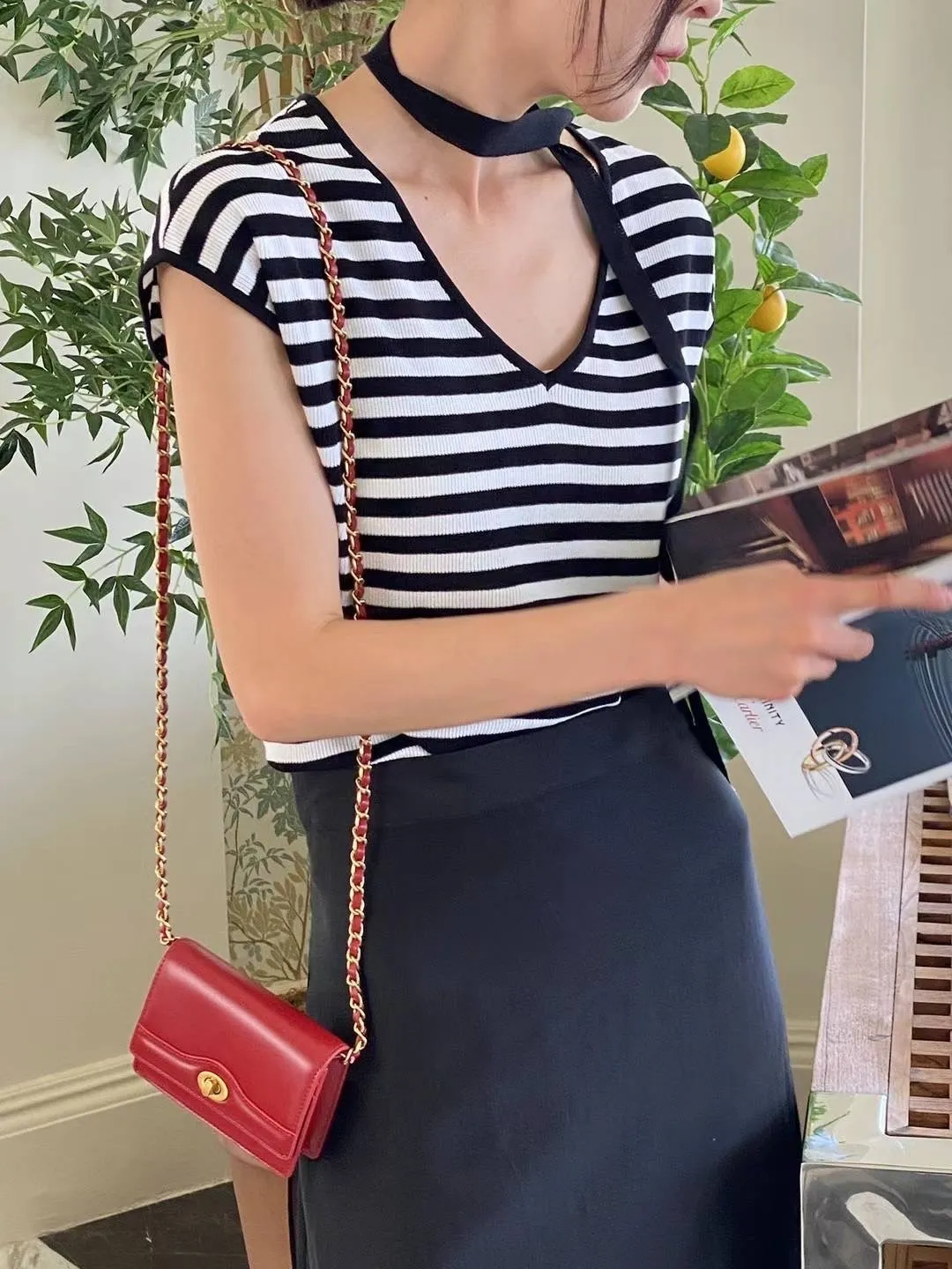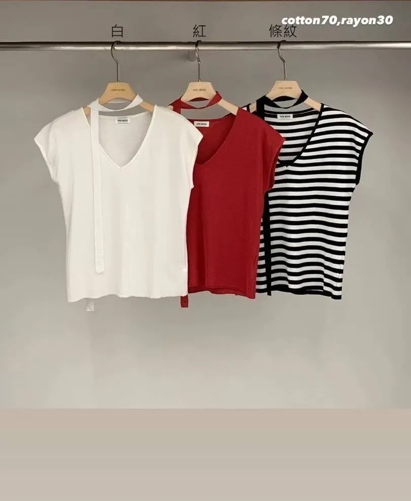HJ1140質感U領針織上衣(脖綁帶) 白 紅 條紋 官網價$920 線上價$890