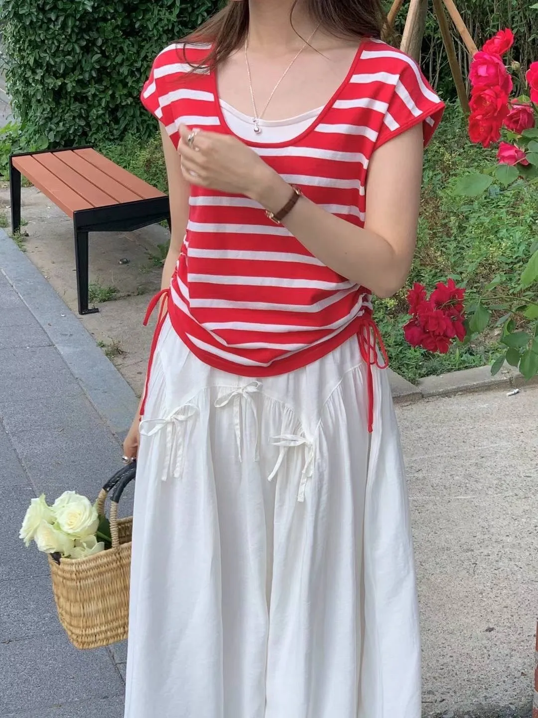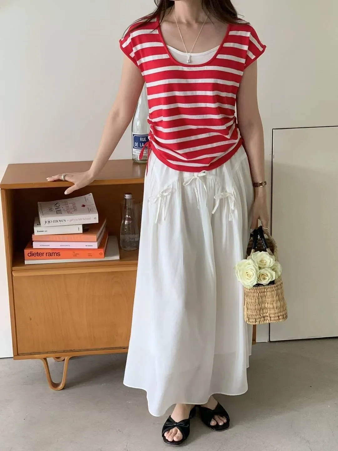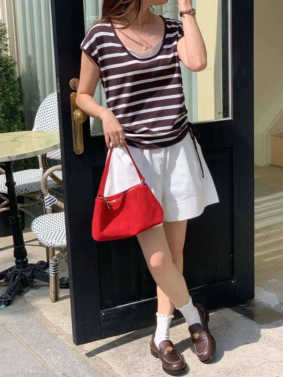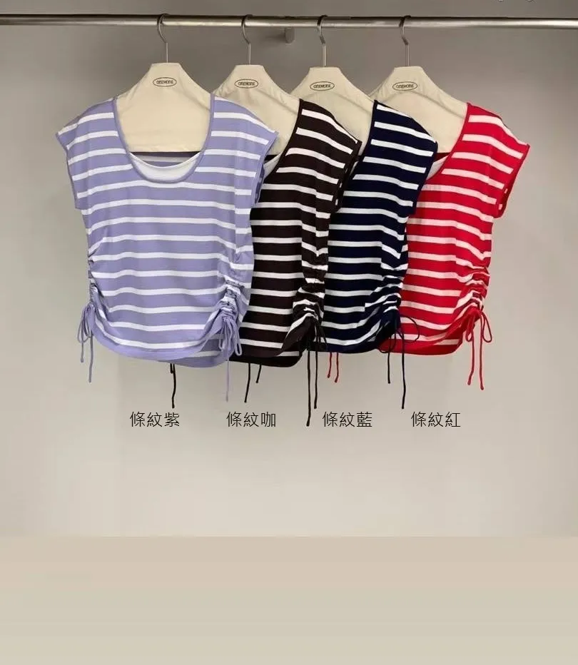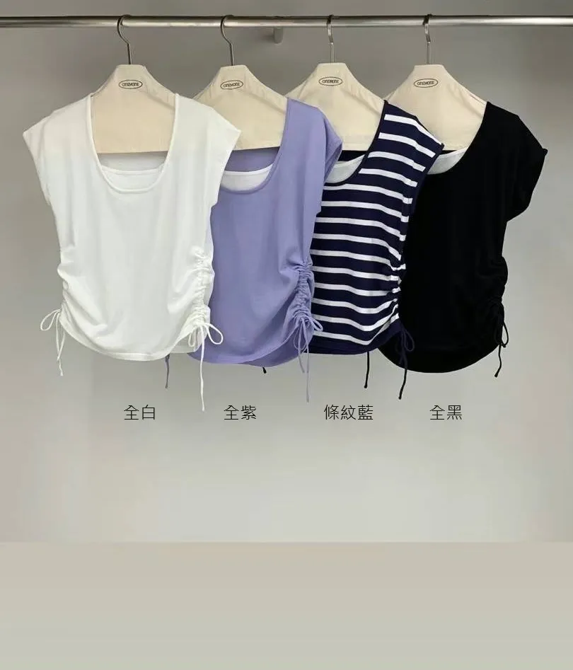 HJ1156側腰抽繩U領假兩件上衣 全白 全黑 全紫 條紋紫 條紋藍 條紋紅 條紋咖 官網價$870 線上價$840