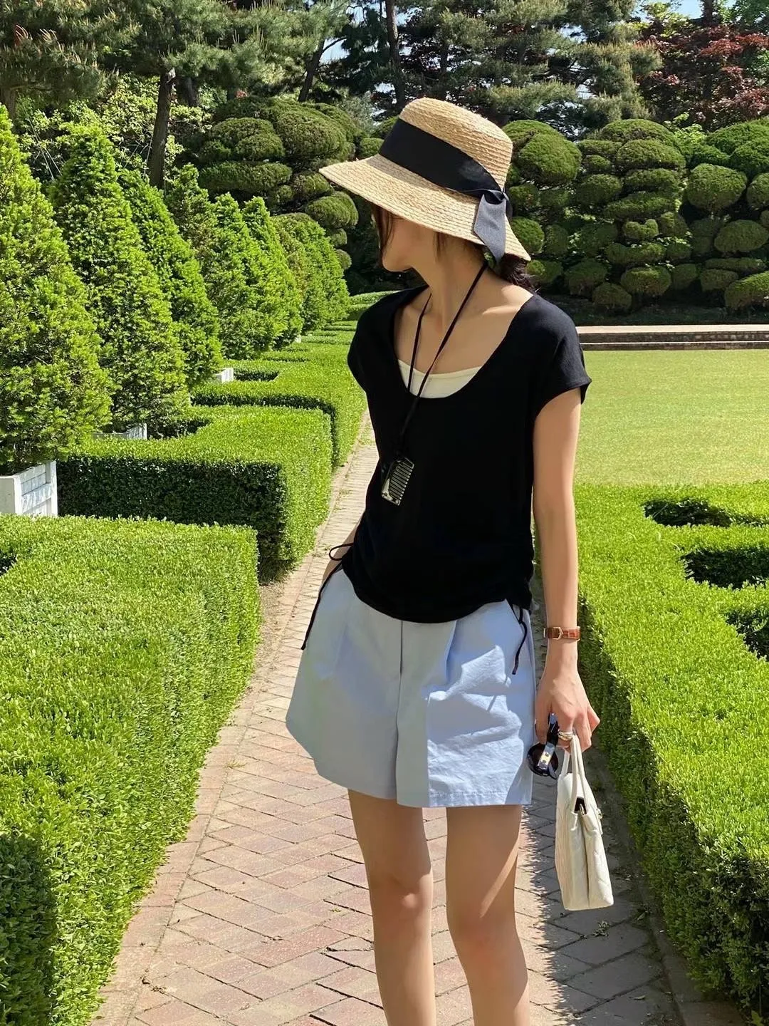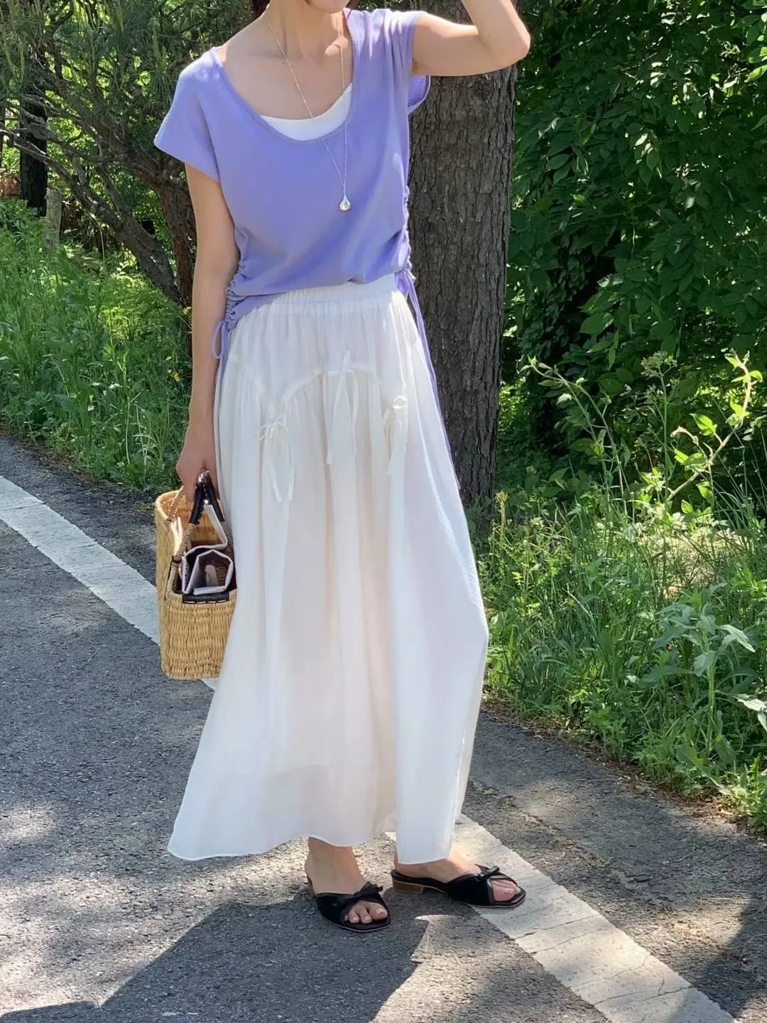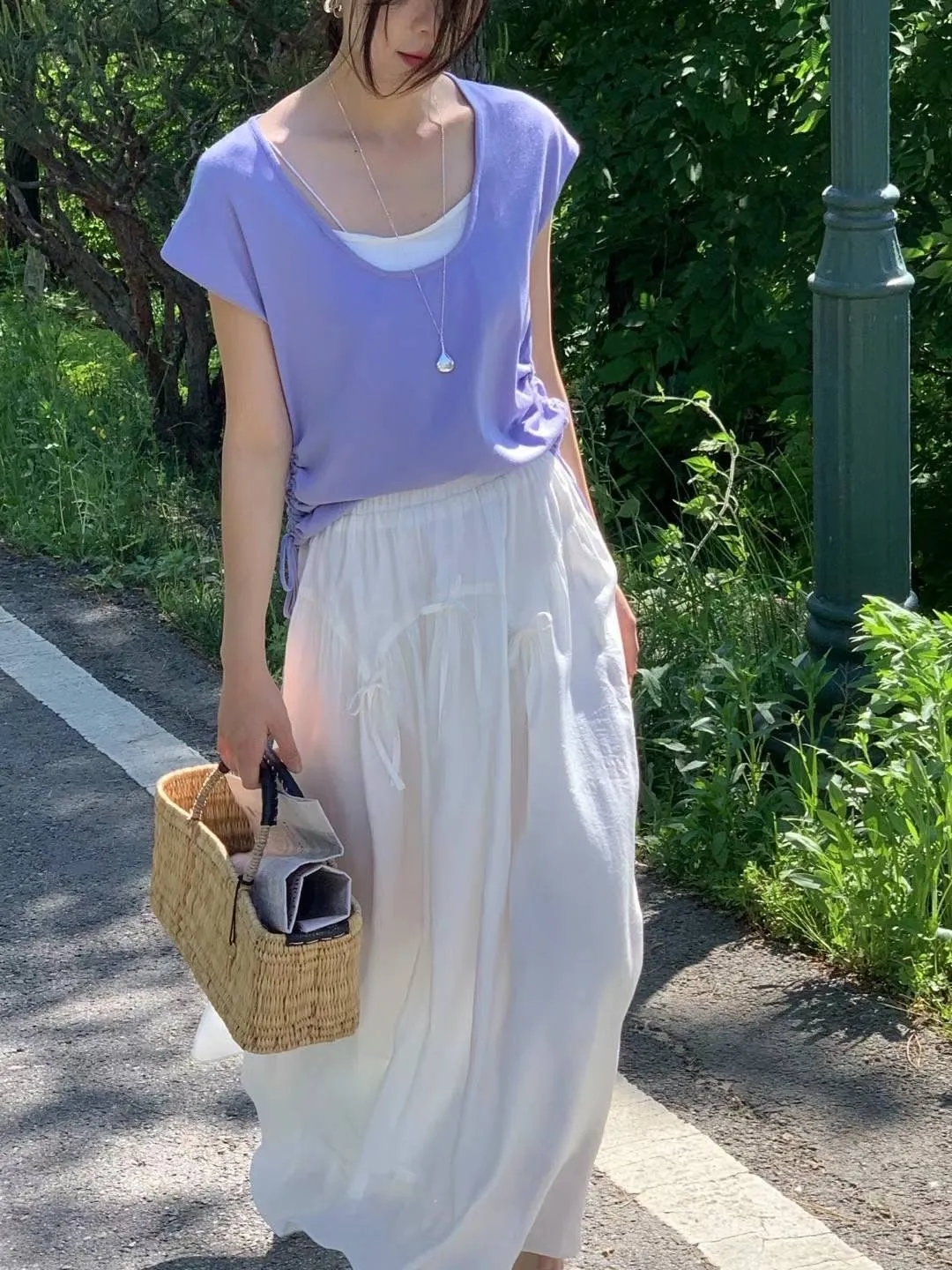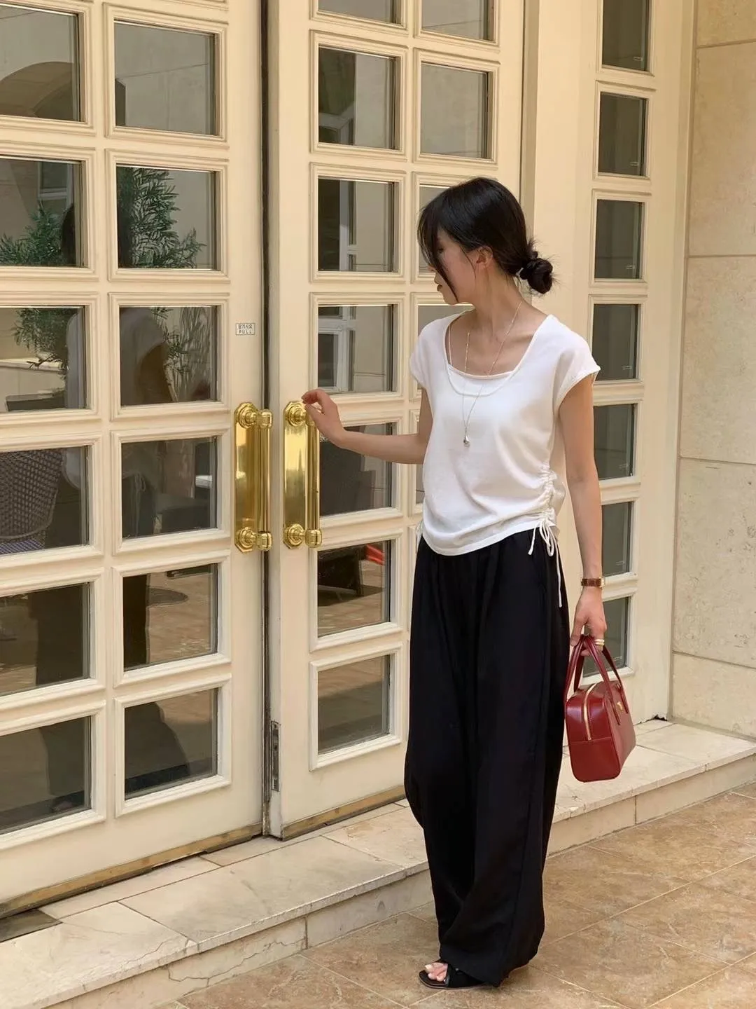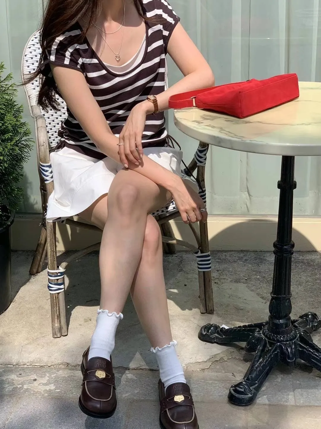 HJ1156側腰抽繩U領假兩件上衣 全白 全黑 全紫 條紋紫 條紋藍 條紋紅 條紋咖 官網價$870 線上價$840