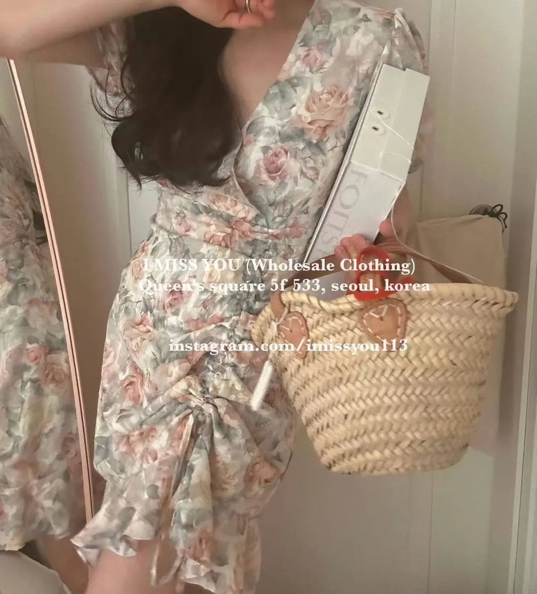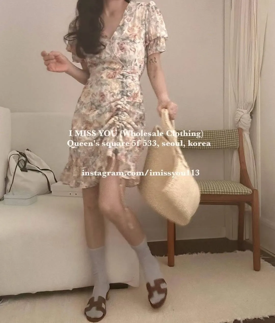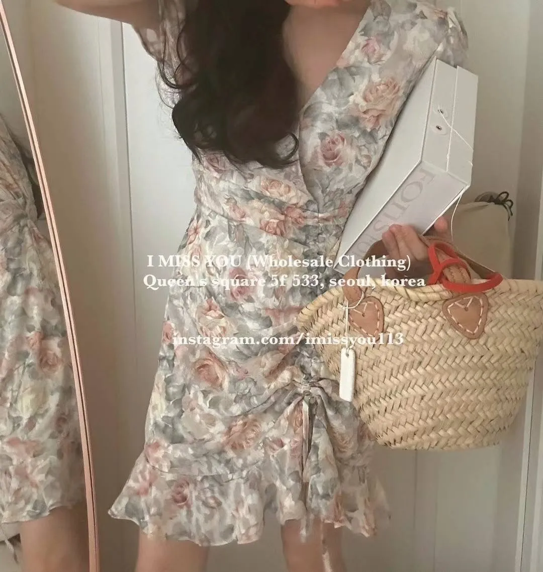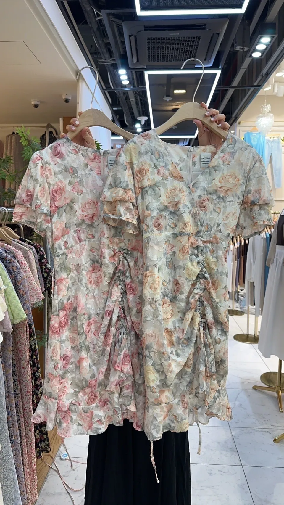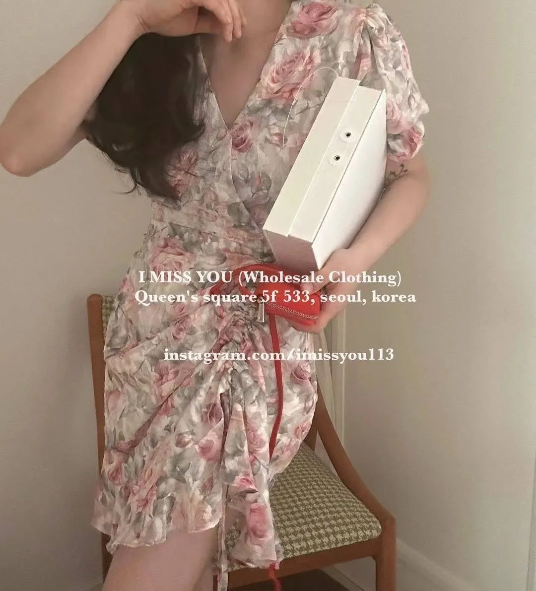 HJ122柔灰色調美花氣質側腿抽繩洋裝 綠 粉 官網價$1590 線上價$1560