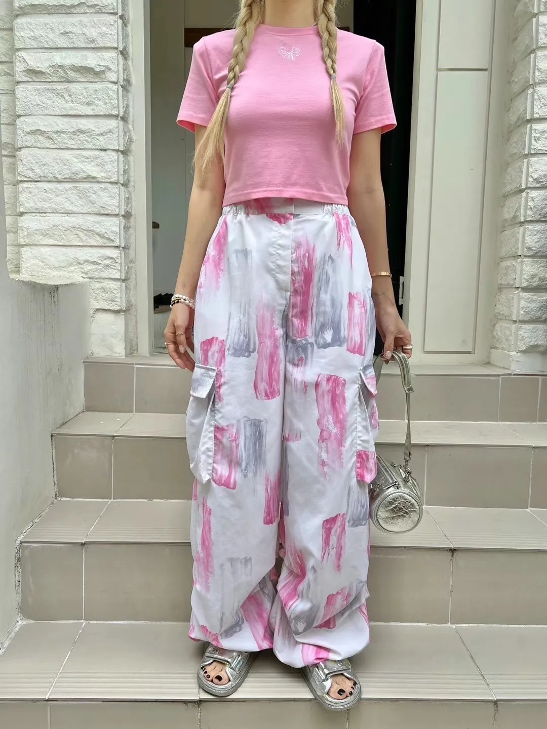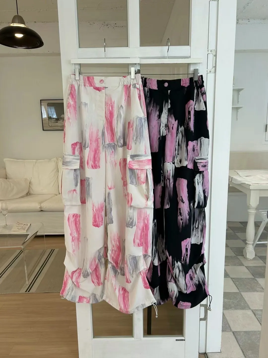 HJ1241噴漆雙側口袋工裝長褲 白 黑 官網價$1529 線上價$1499