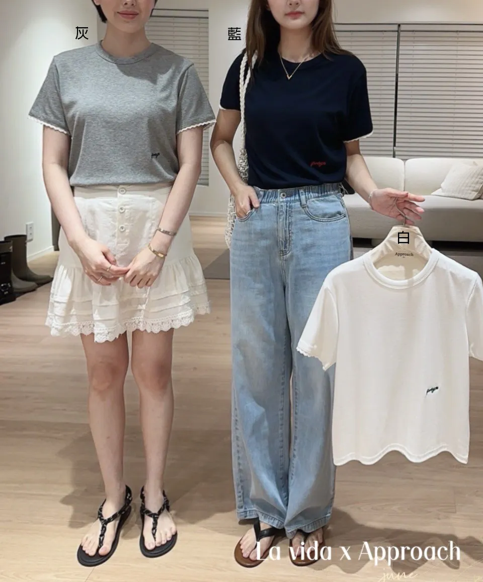 HJ1300拼接細緻蕾絲刺繡英文上衣 白 灰 藍 官網價$799 線上價$769