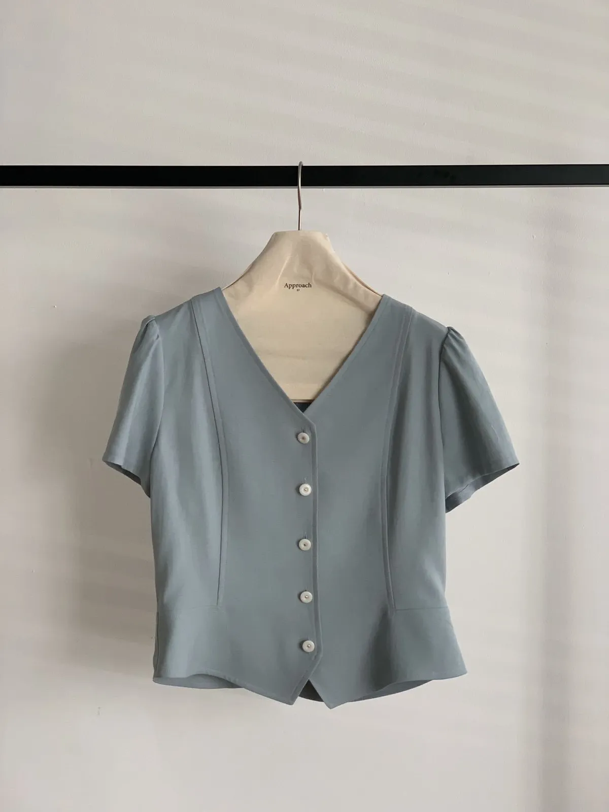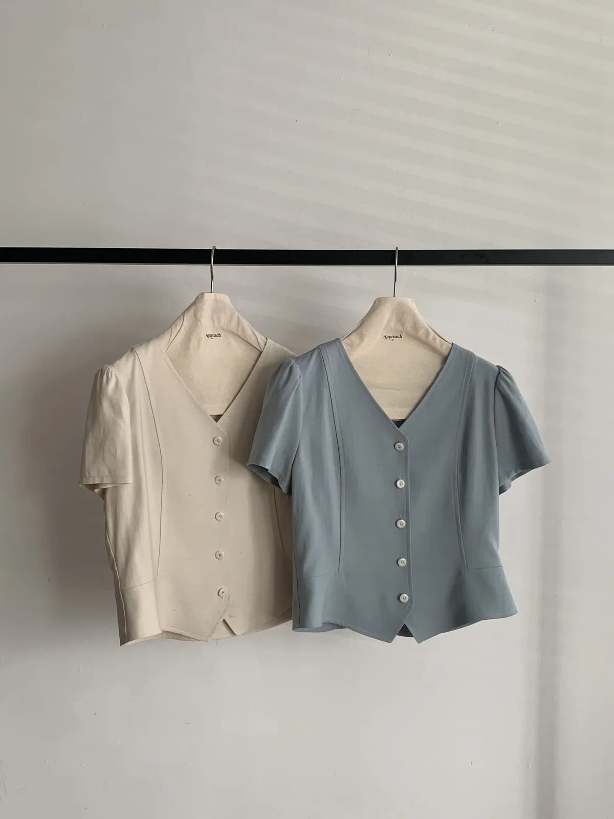 HJ1318氣質腰身排釦V領上衣 米 藍 官網價$1590 線上價$1560