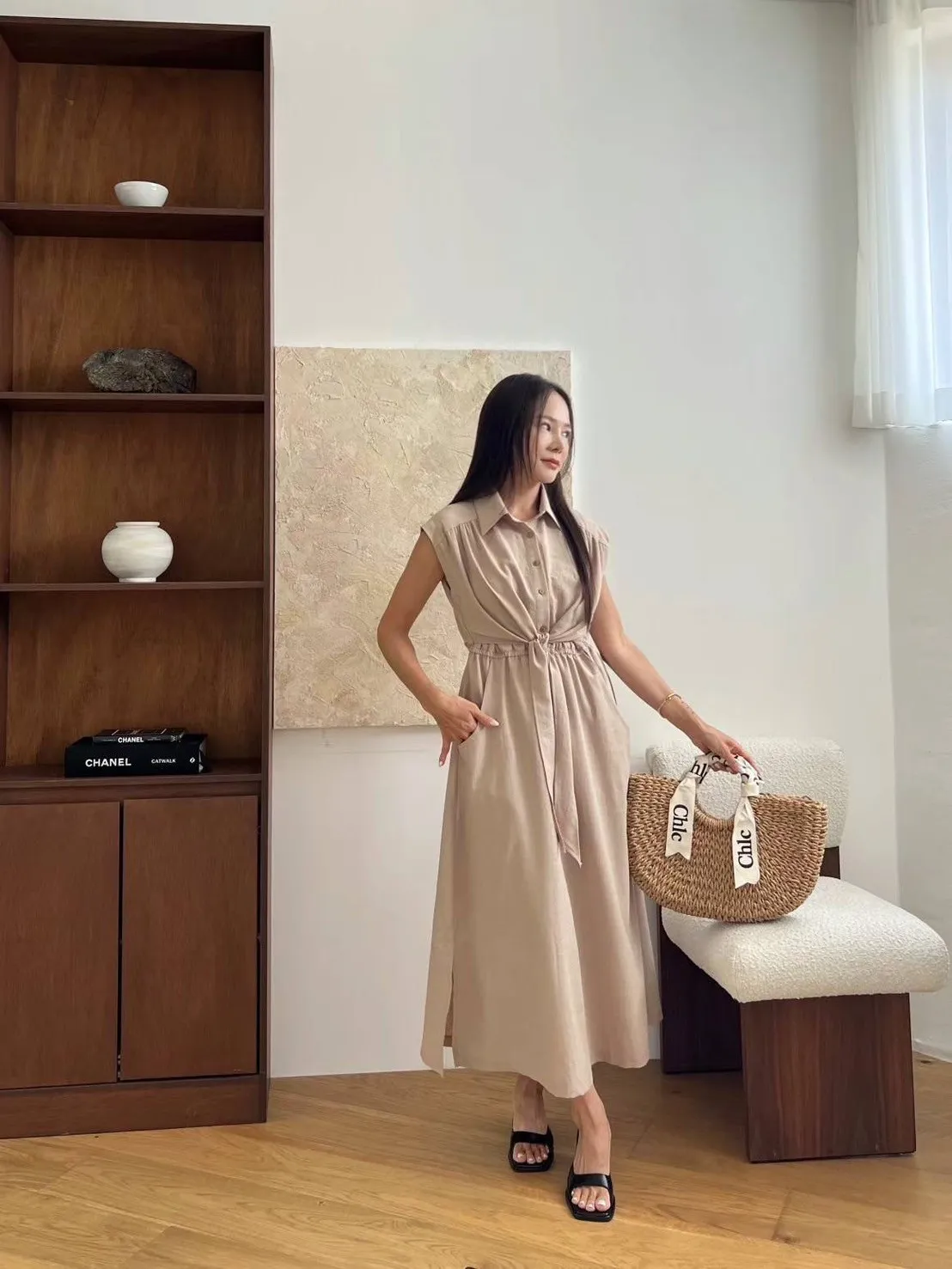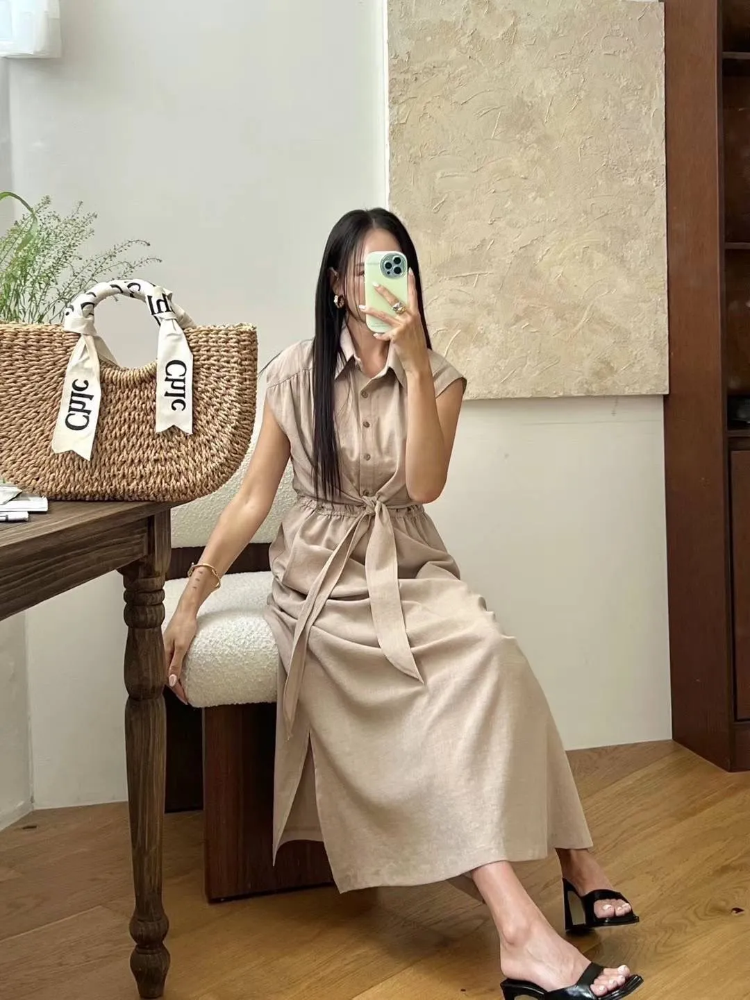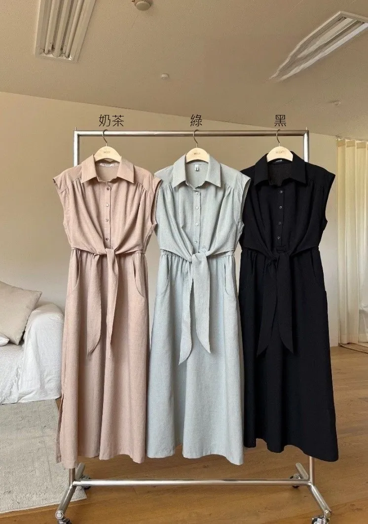 HJ146設計感襯衫領腰綁層次洋裝 棉麻洋裝 綠 黑 奶茶 官網價$1450 線上價$1420