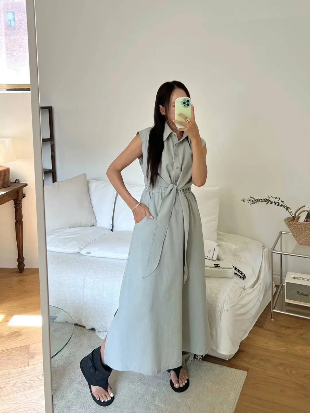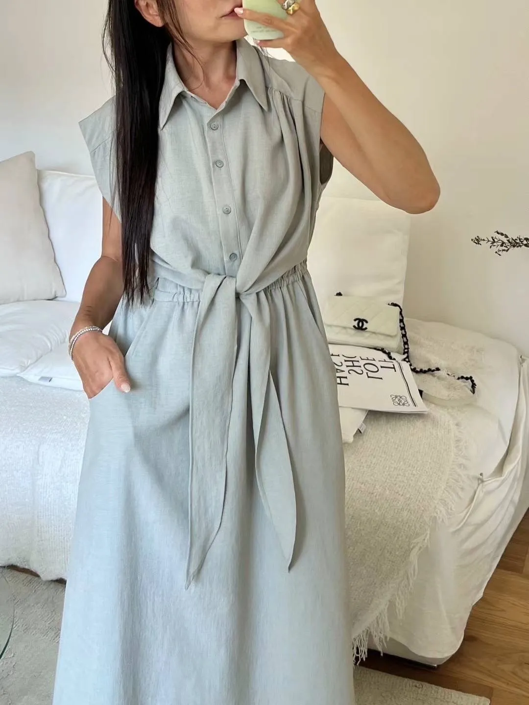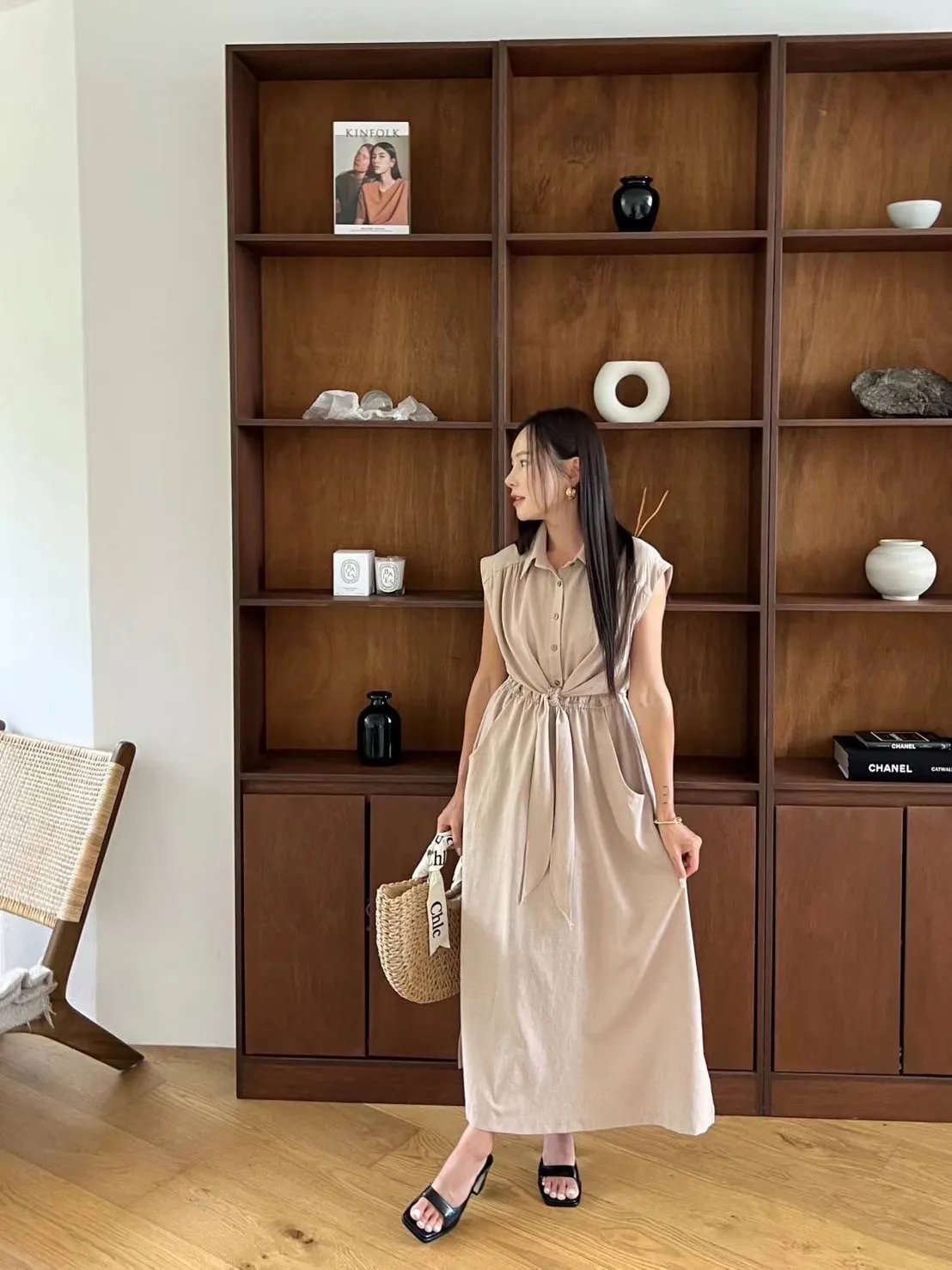 HJ146設計感襯衫領腰綁層次洋裝 棉麻洋裝 綠 黑 奶茶 官網價$1450 線上價$1420