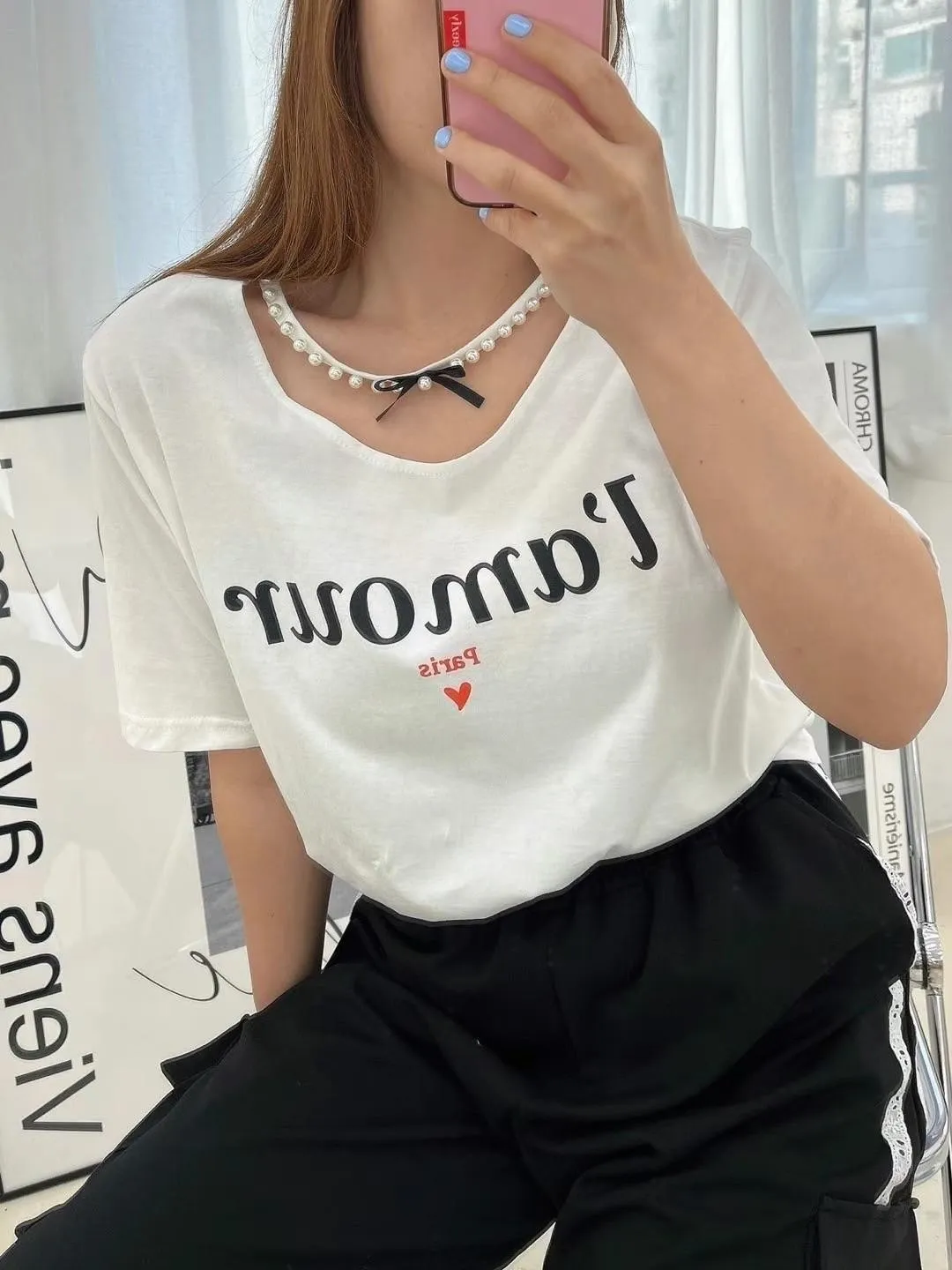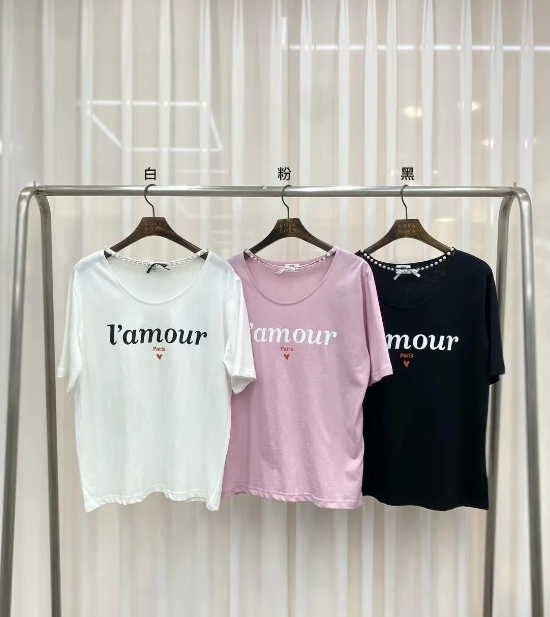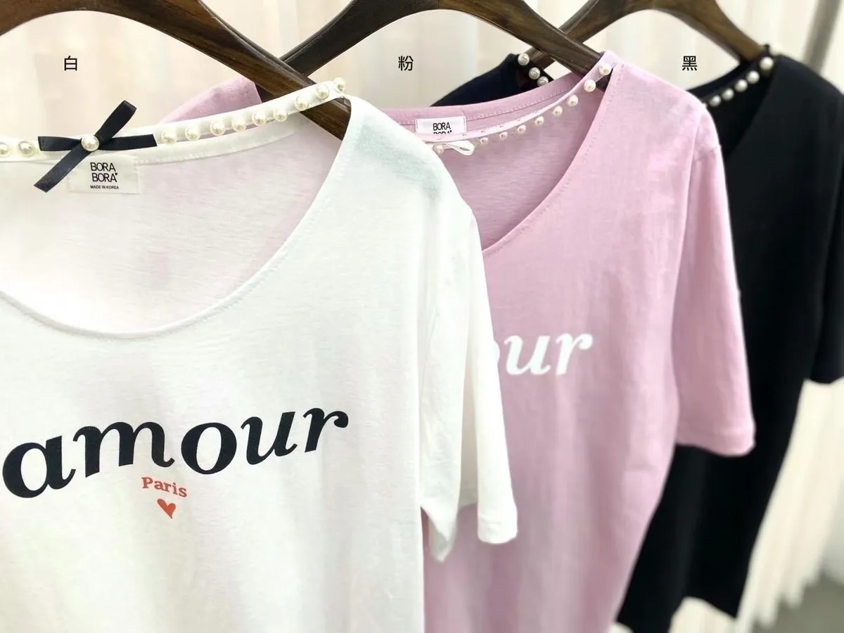 HJ175冰絲棉法文Lamour寬領Tshirt 白 粉 黑 官網價$650 線上價$620