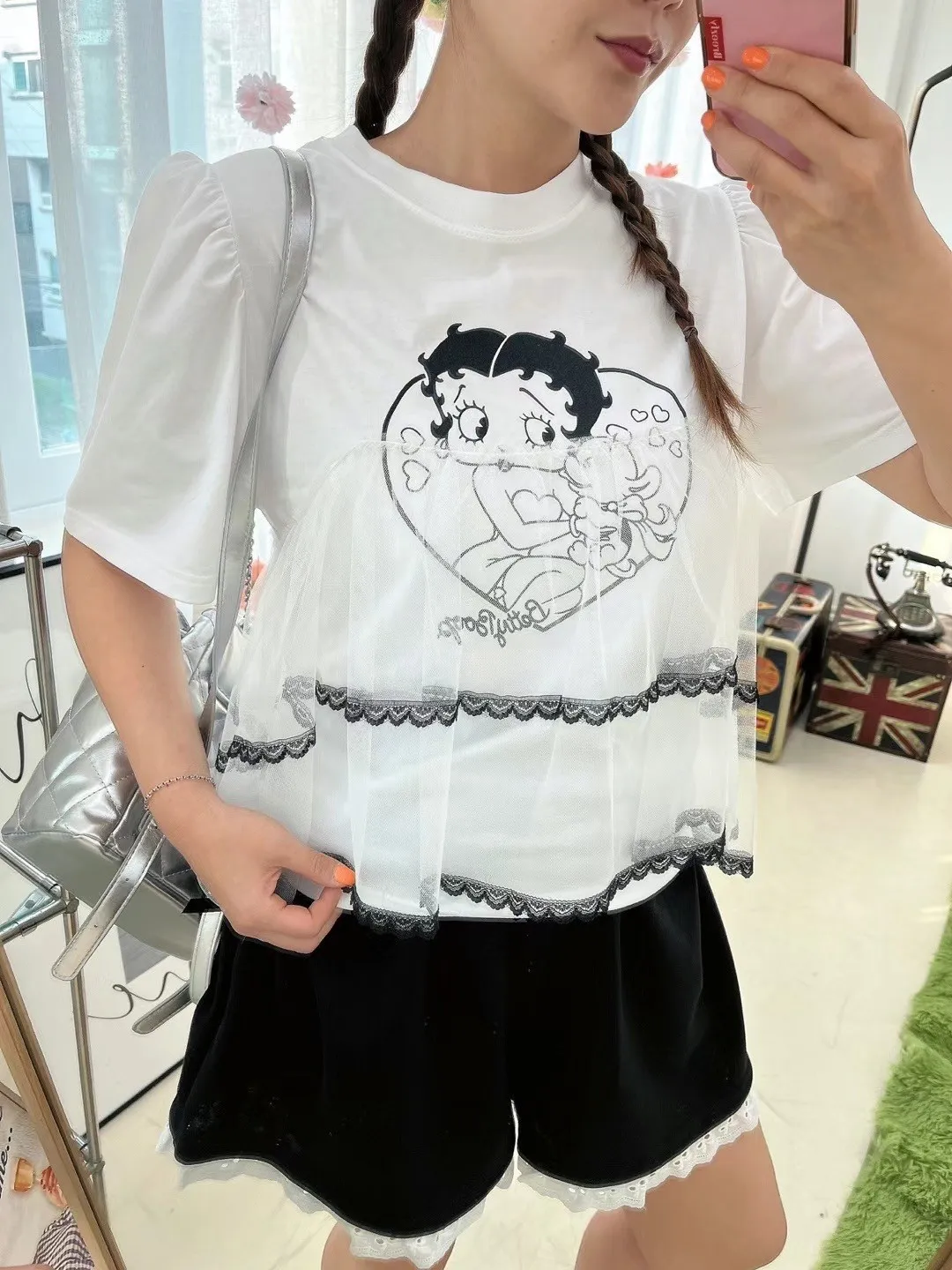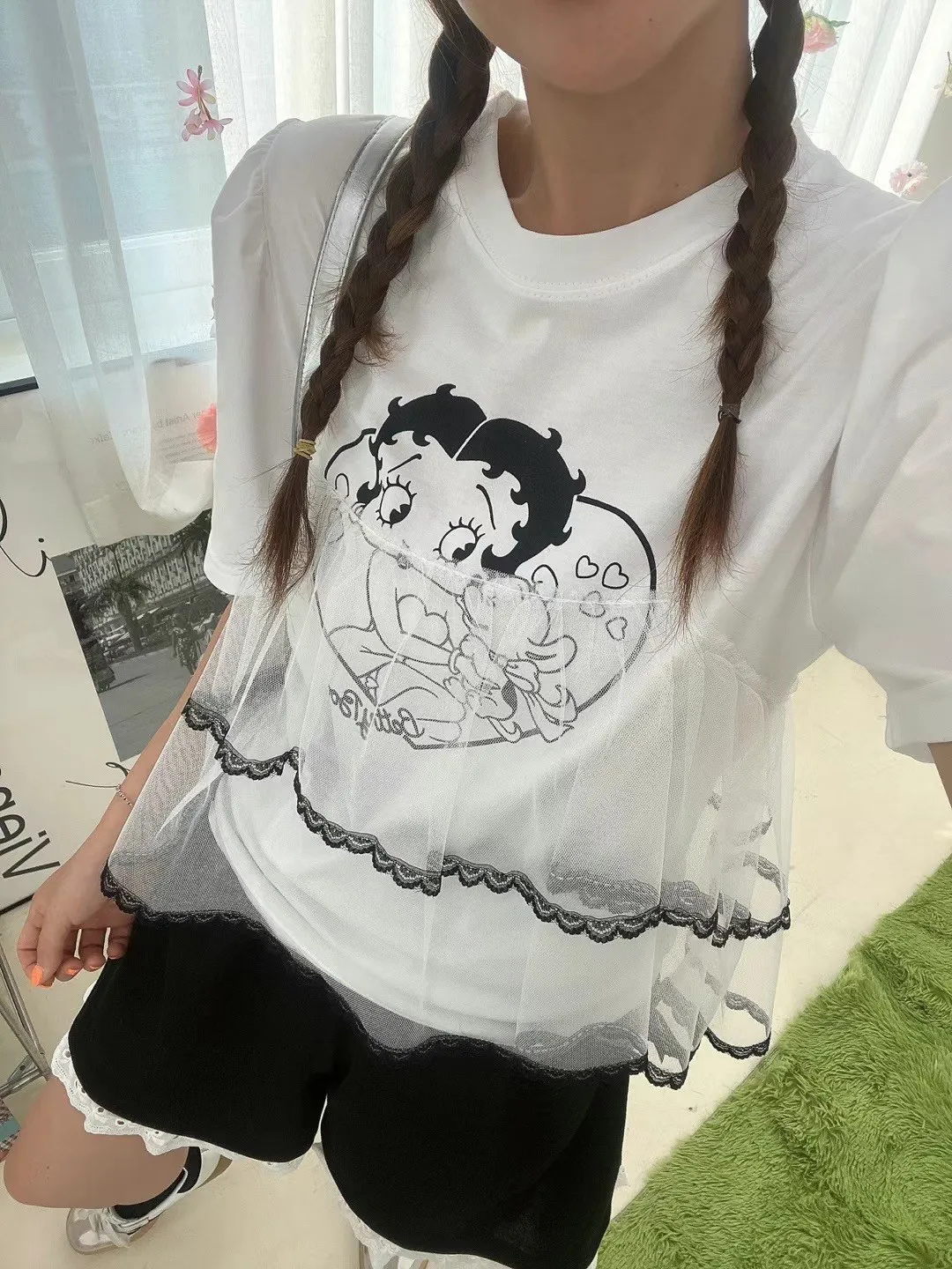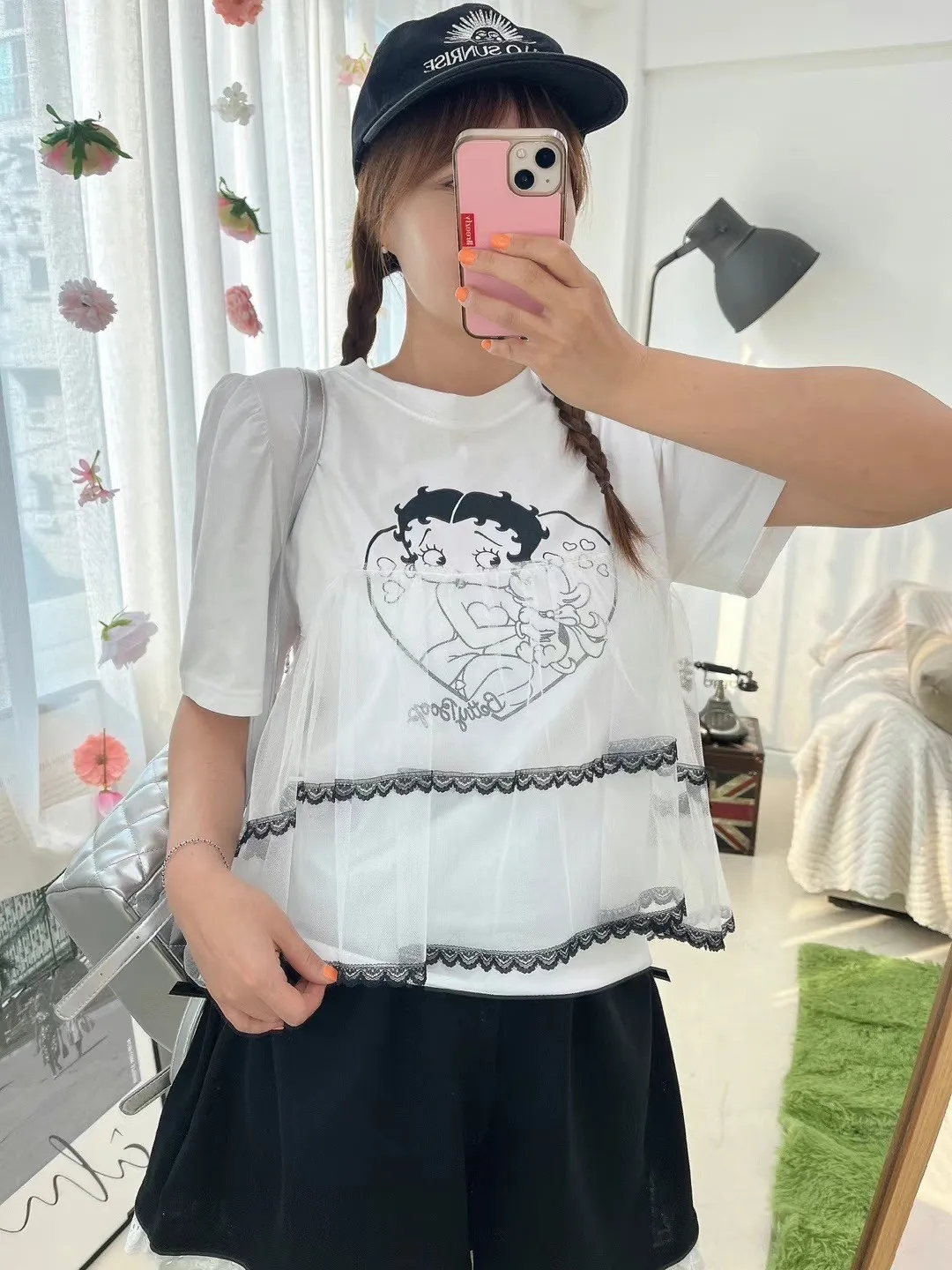 HJ190可愛貝蒂層次網紗 Tshirt 白 黑 官網價$799 線上價$769