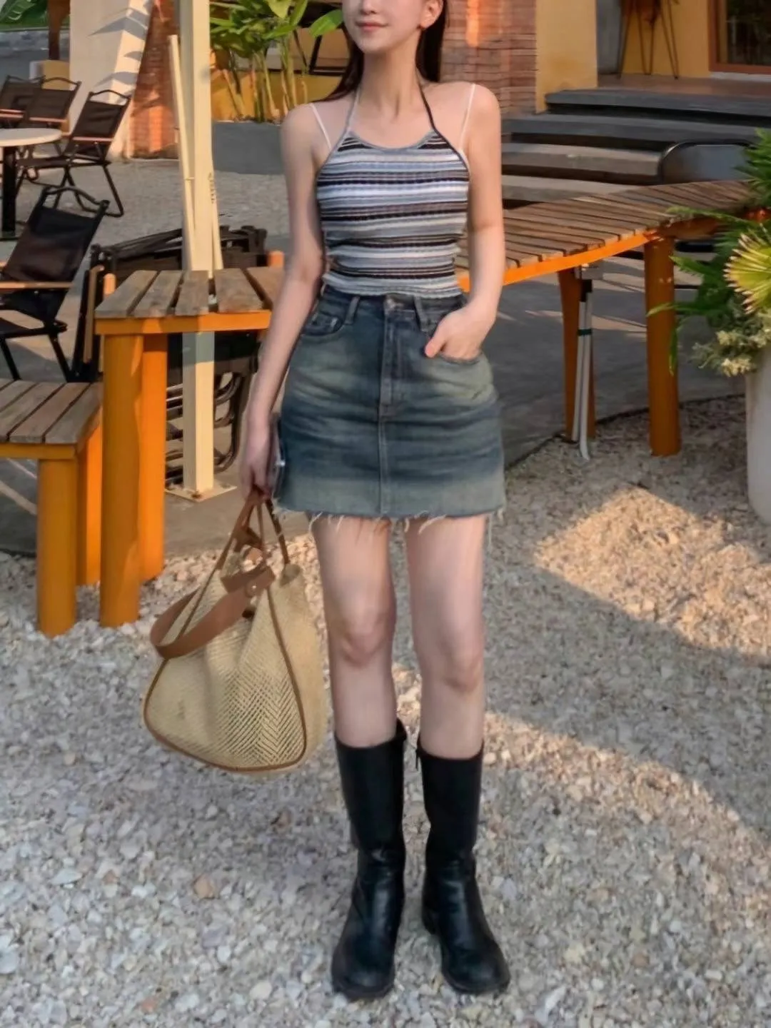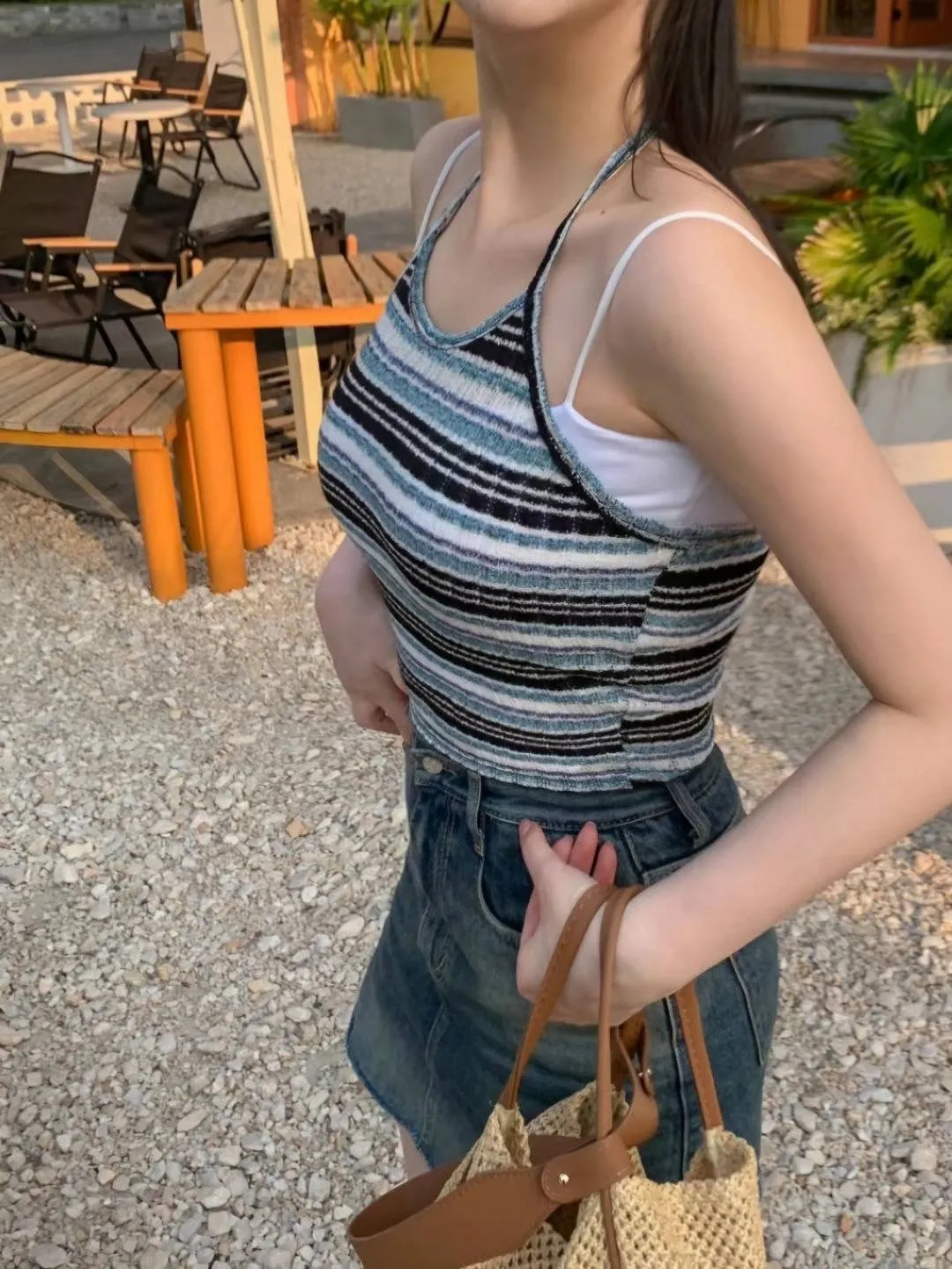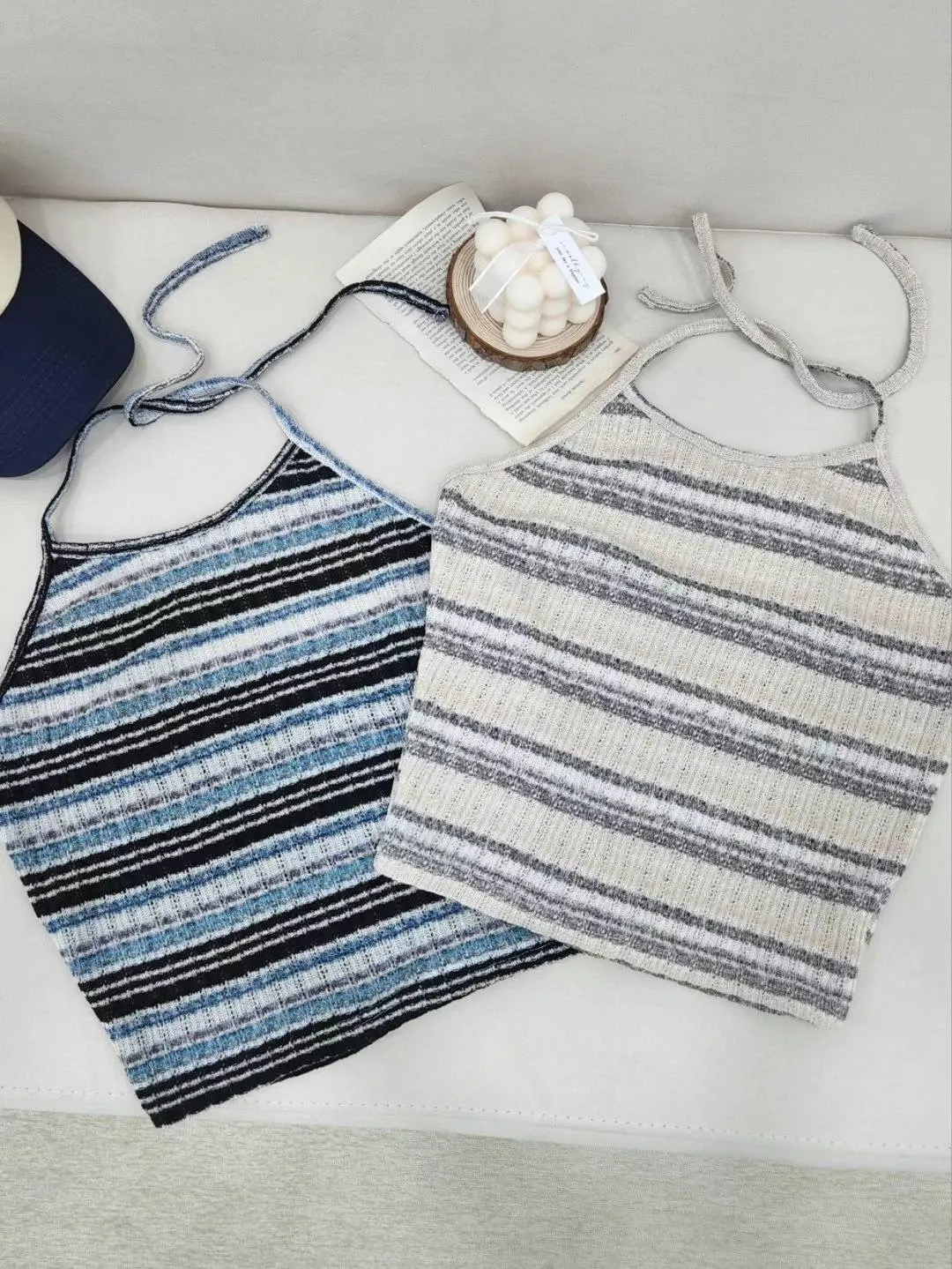 HJ217繞脖綁帶橫條紋鈎織上衣 藍 奶茶 官網價$360 線上價$330
