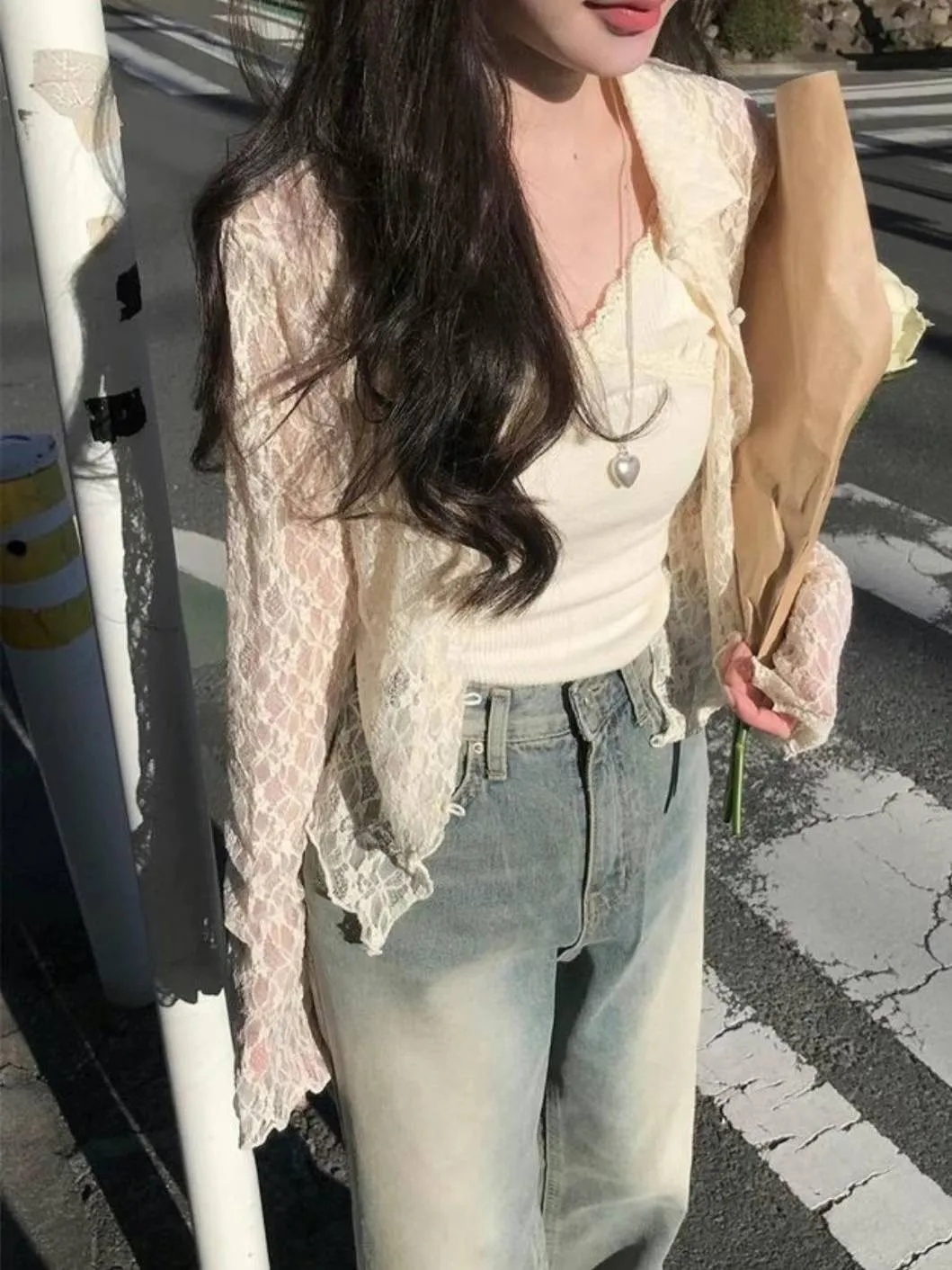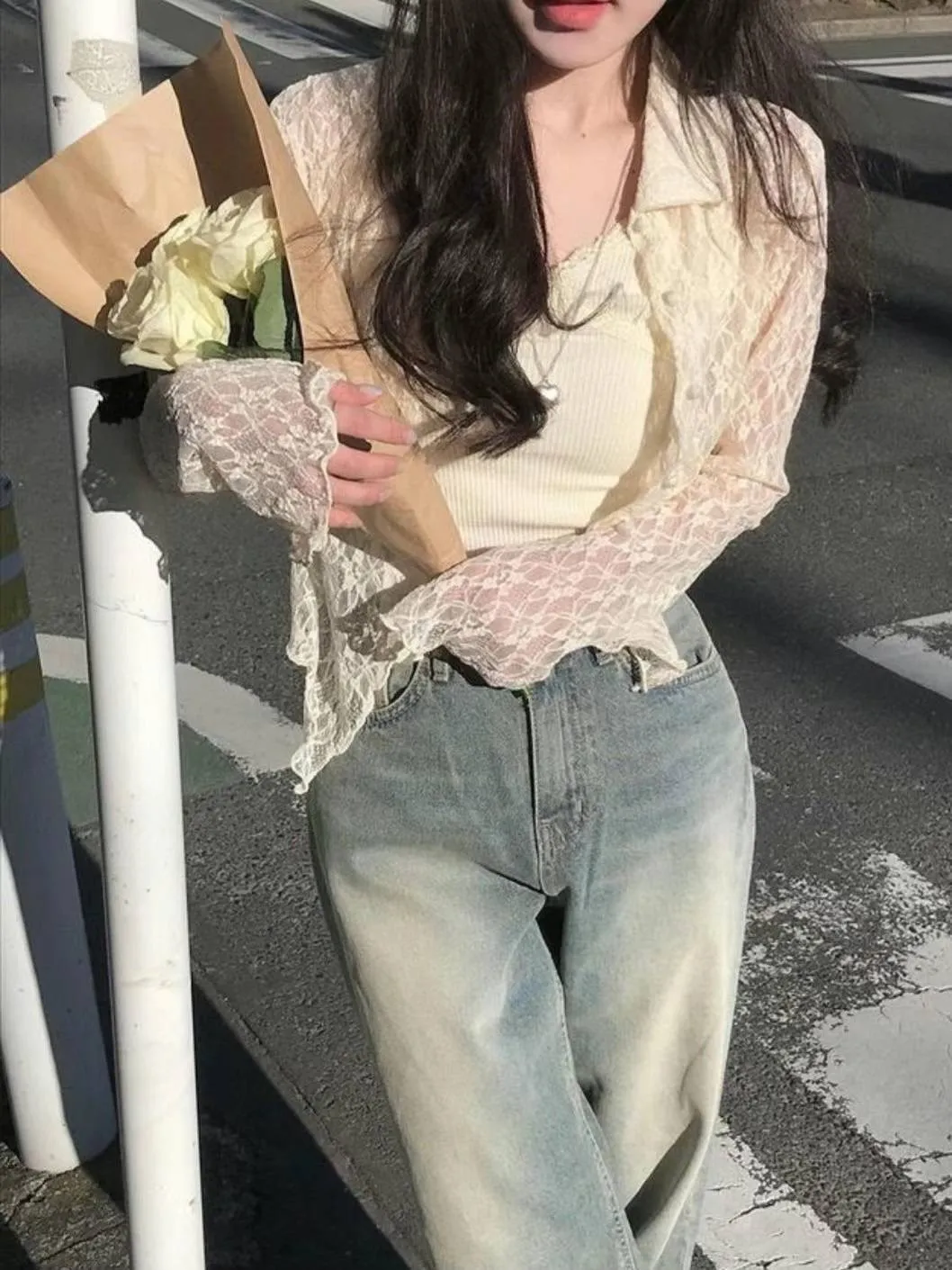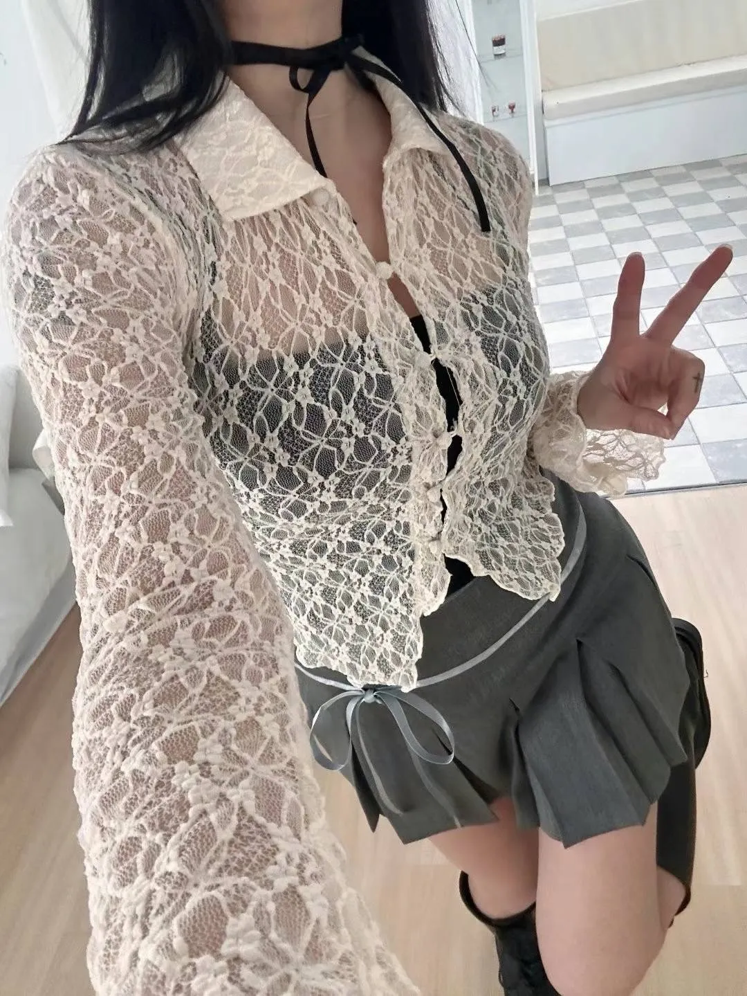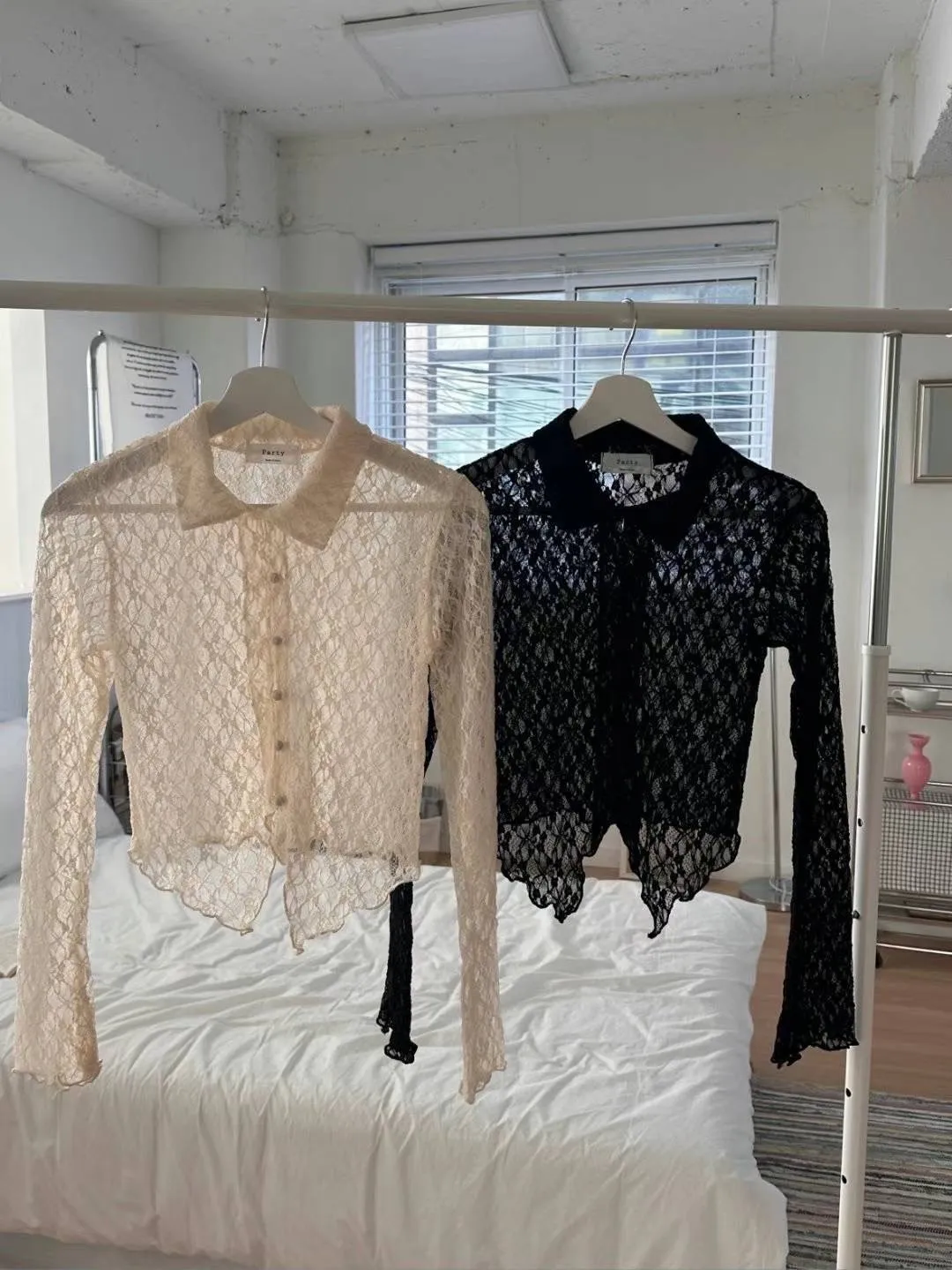 HJ222襯衫領蕾絲透光罩衫 米 黑 官網價$660 線上價$630