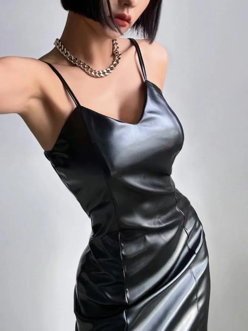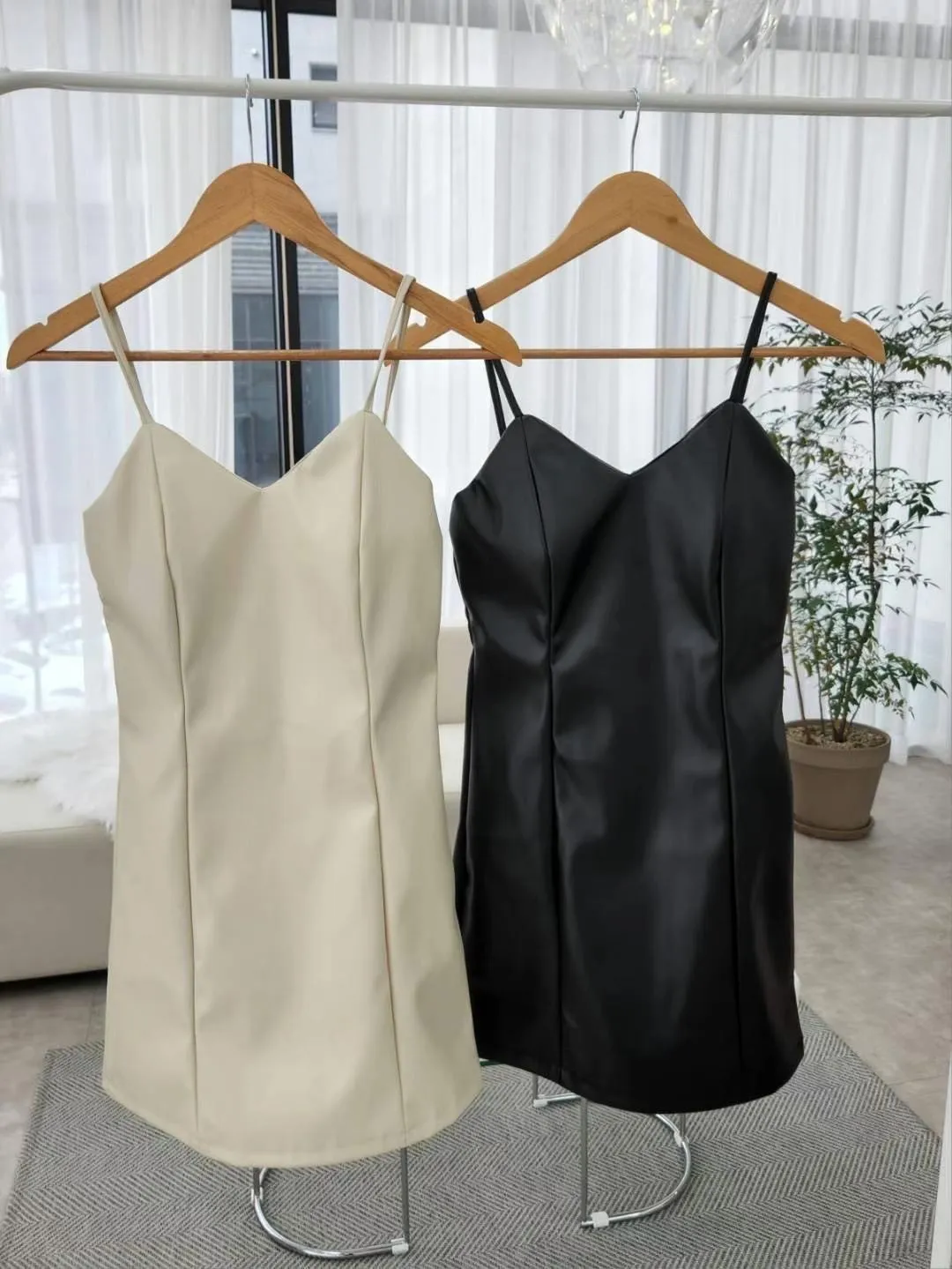 HJ225皮衣V領細肩帶連身短洋裝 米 黑 官網價$780 線上價$750