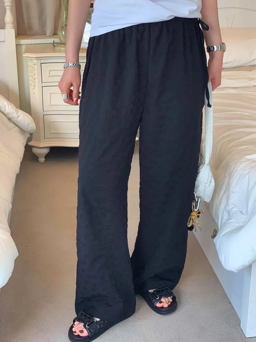 聚酯 立體小花面料 腰有鬆緊 側綁繩 有口袋 不易皺 寬鬆舒適 適合夏天