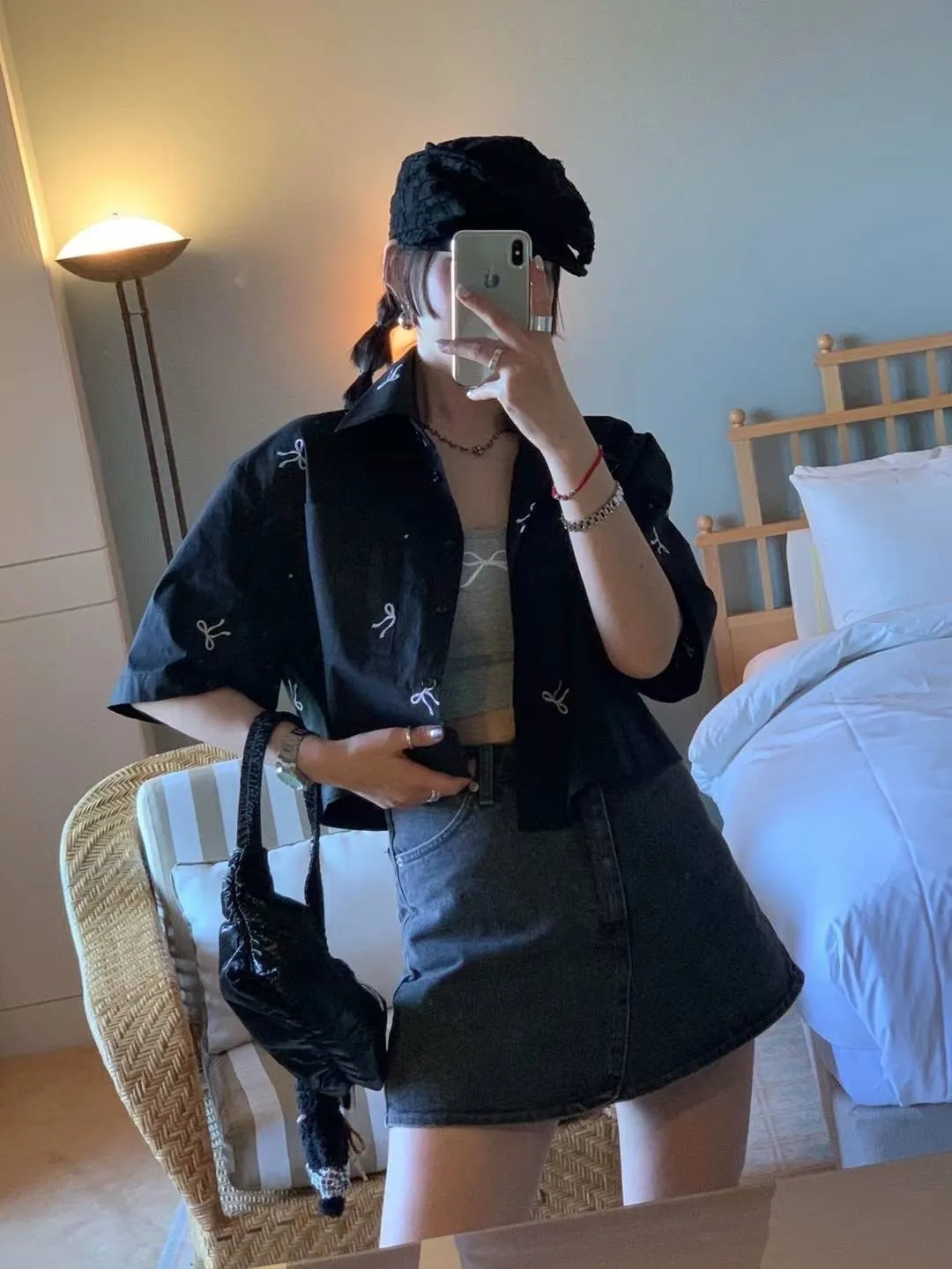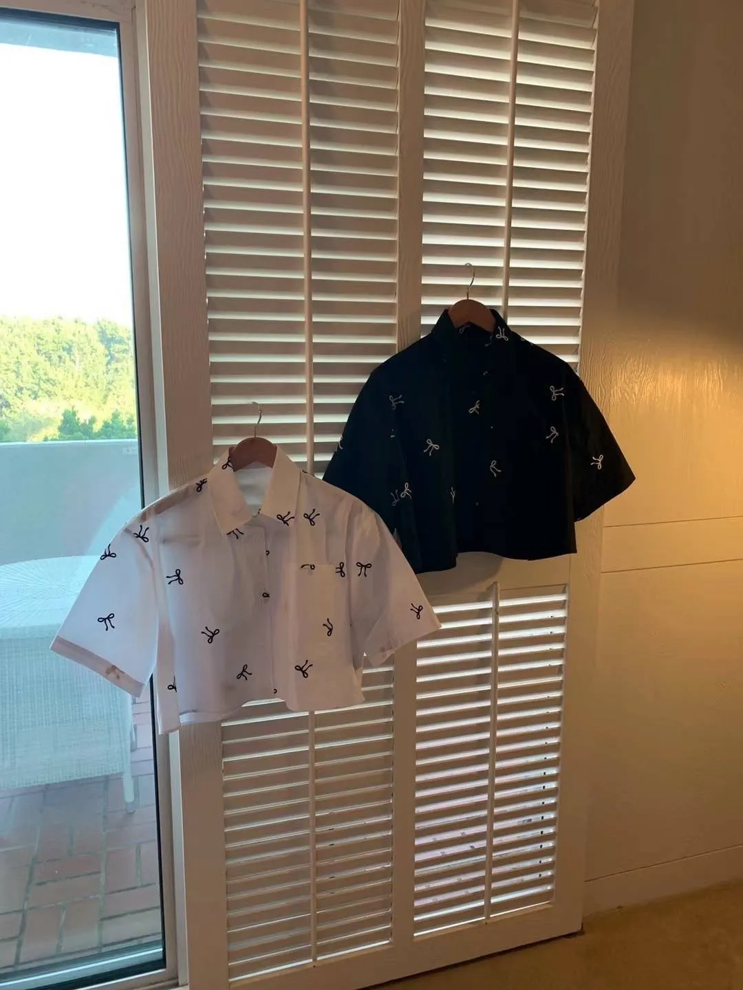 HJ253蝴蝶結刺繡短版襯衫 白 黑 官網價$1080 線上價$1050