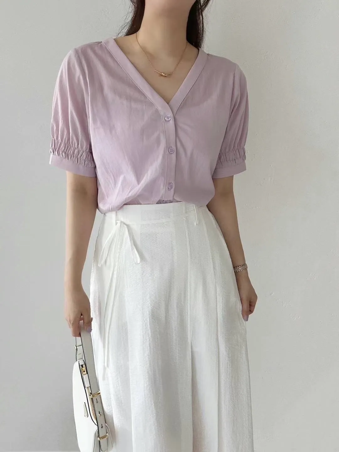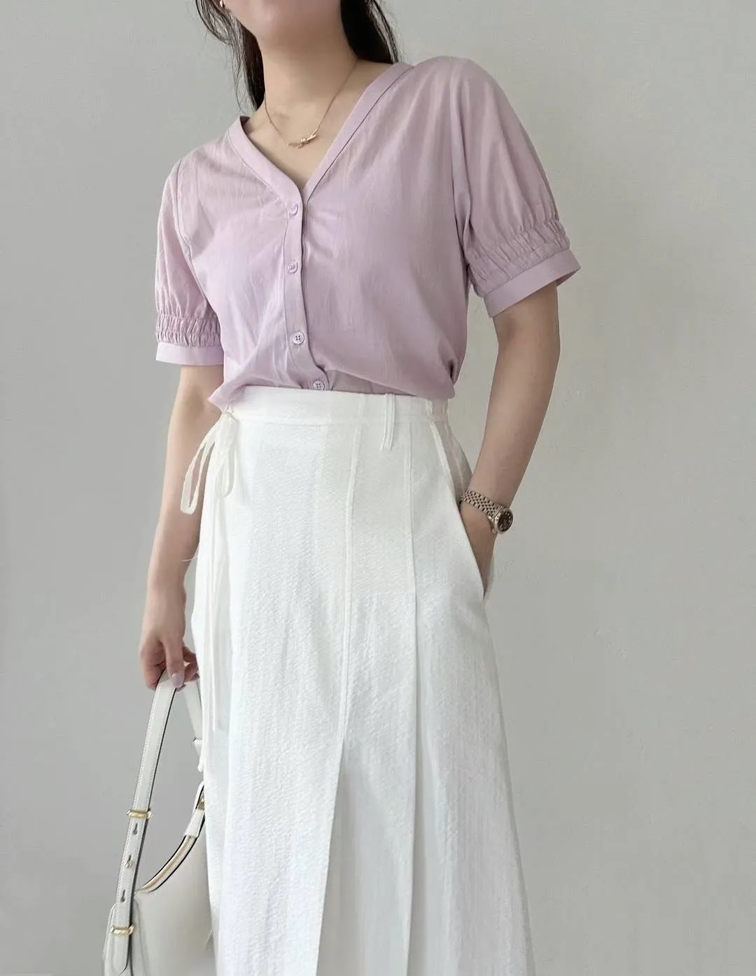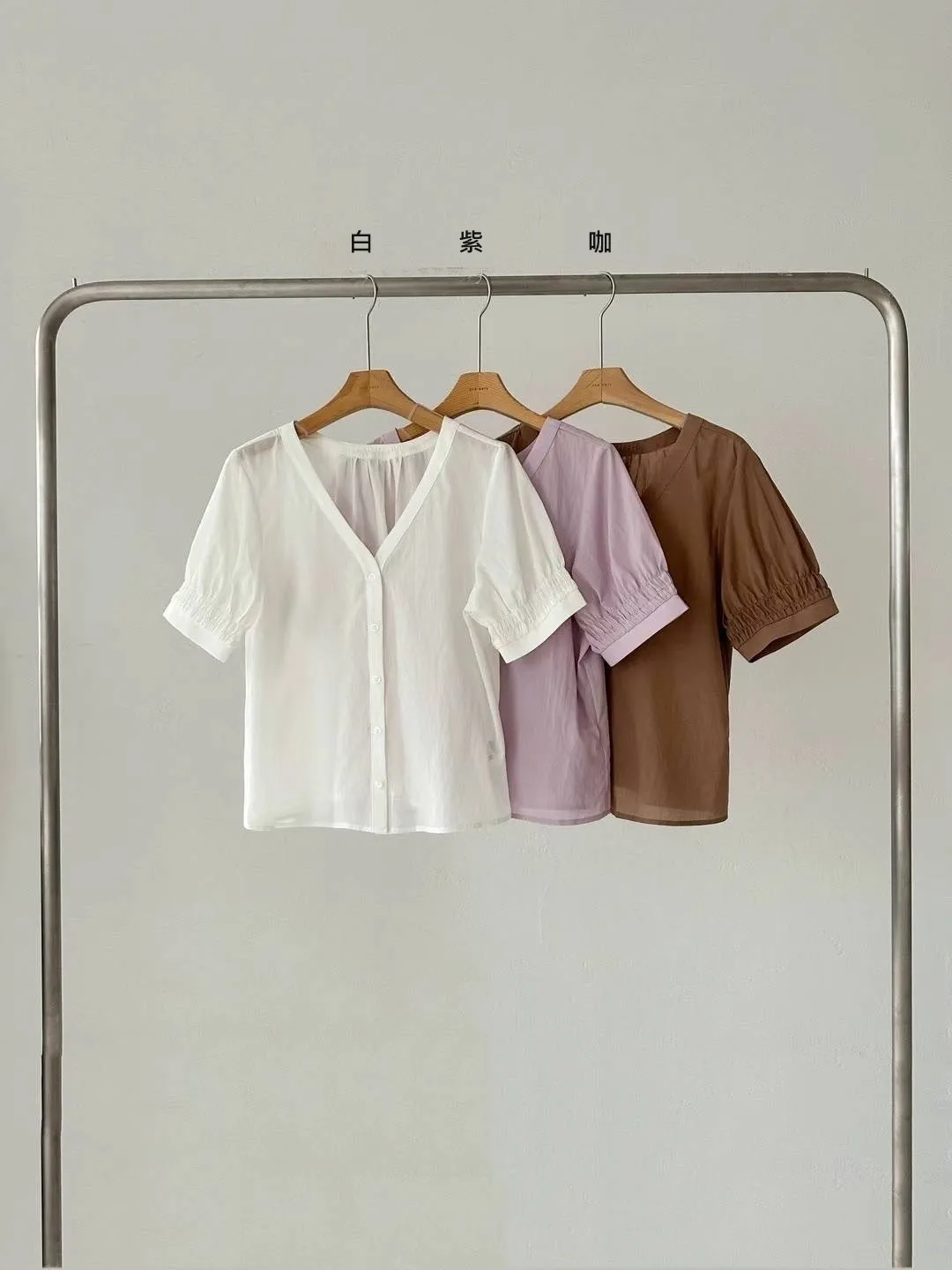HJ434薄款透光V領排釦美衣 白 紫 咖 官網價$1120 線上價$1090