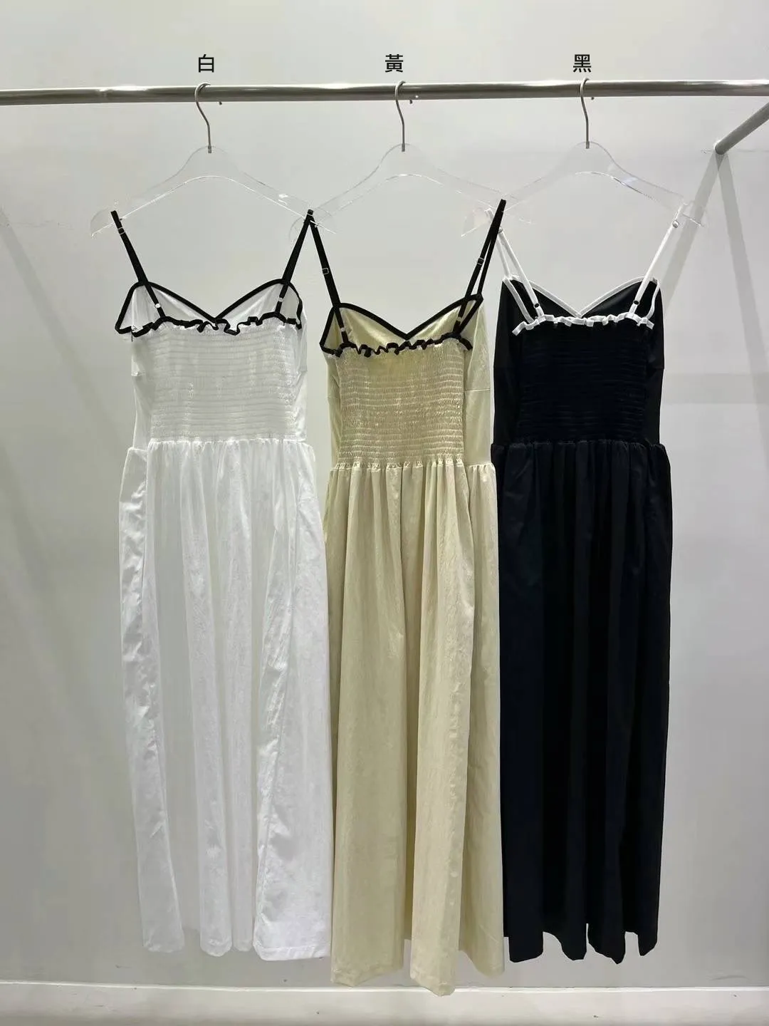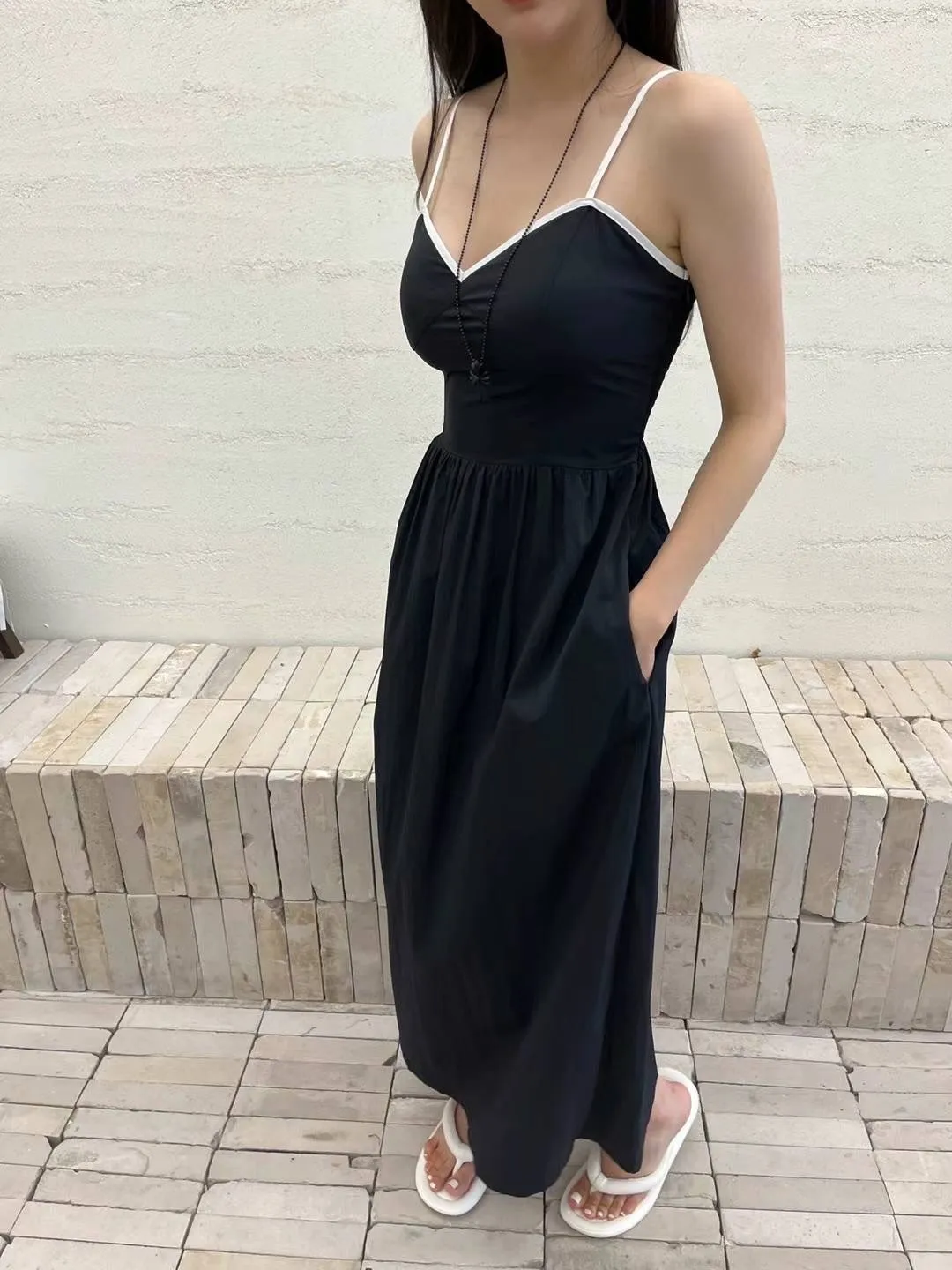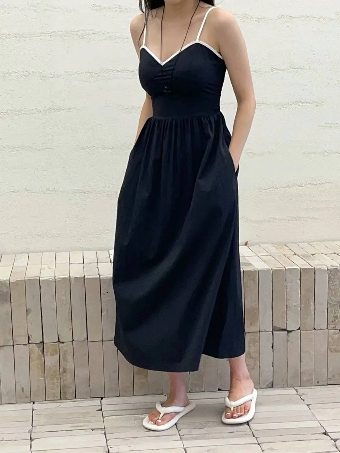 棉+縲縈+彈力 涼爽面料 肩帶可調 有口袋 後背荷葉滾邊 傘擺裙