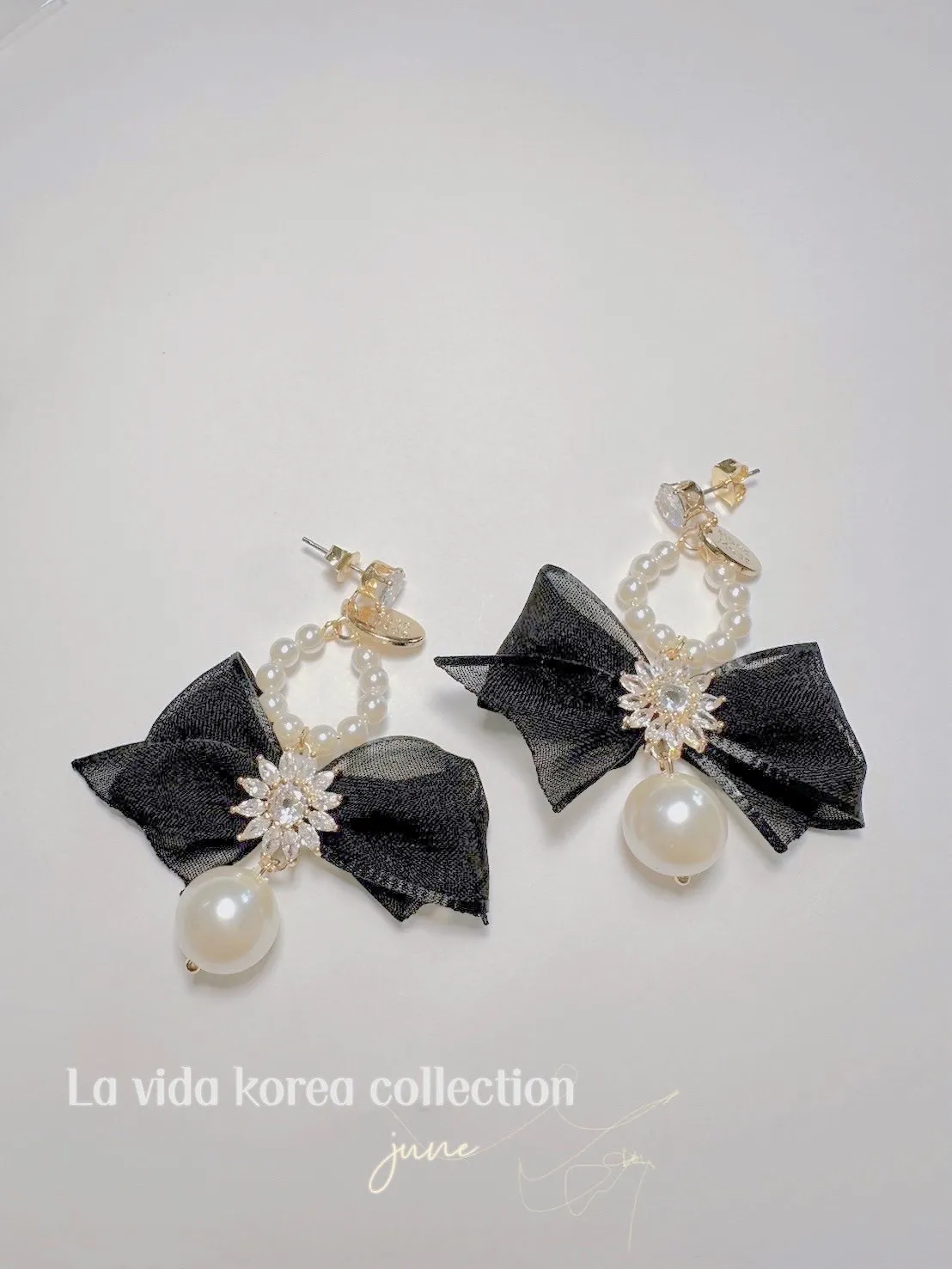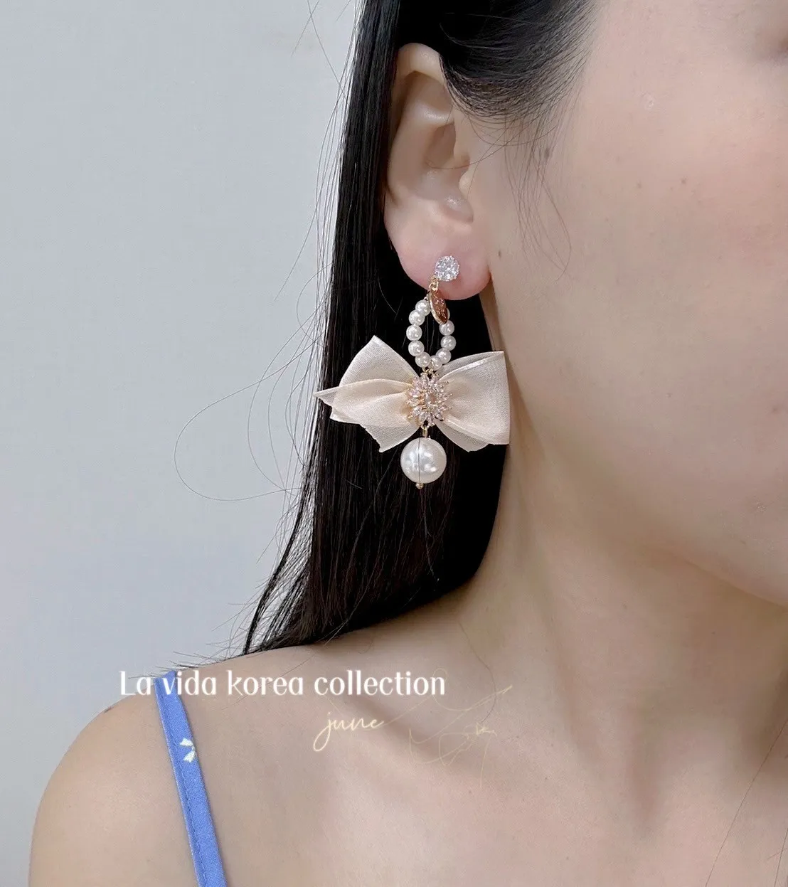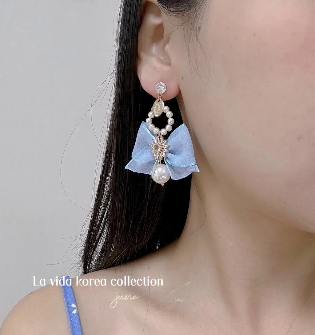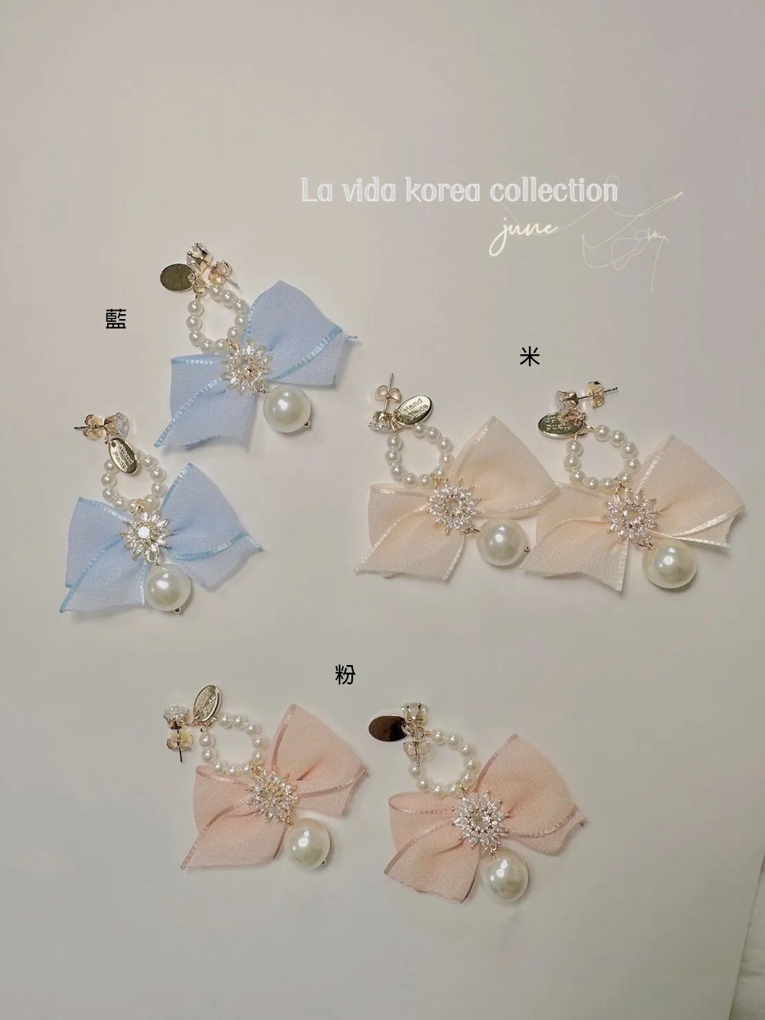 HJ911緞帶鑽花珍珠耳環 米 藍 黑 粉 耳針 耳夾(螺) 官網價$319 線上價$299