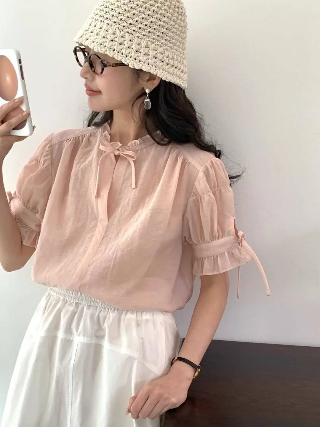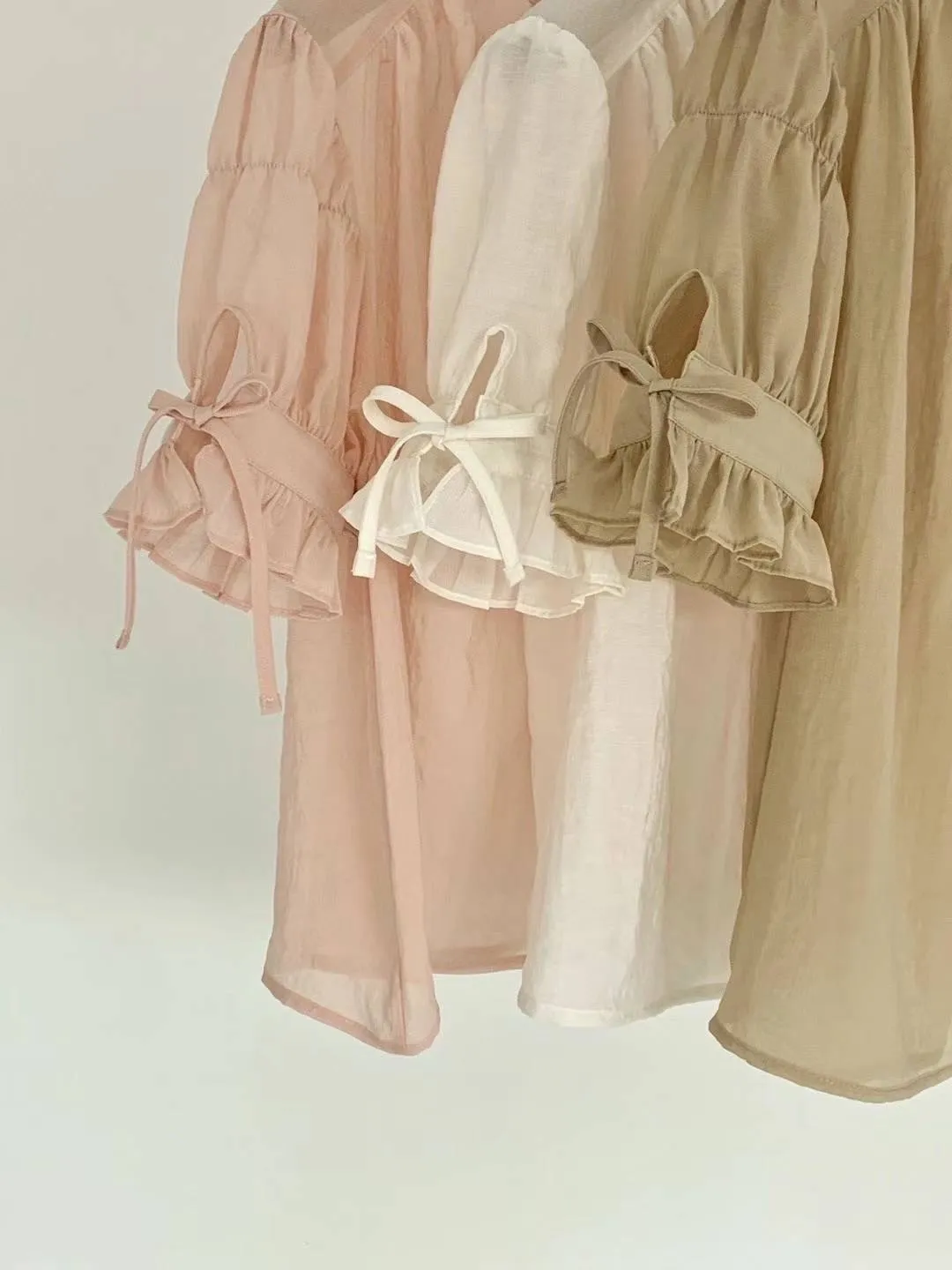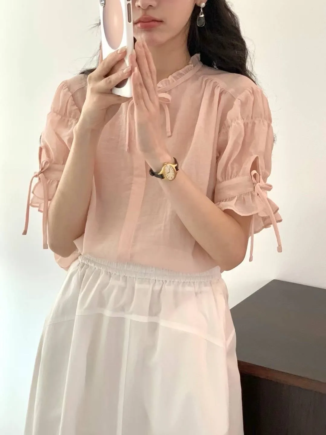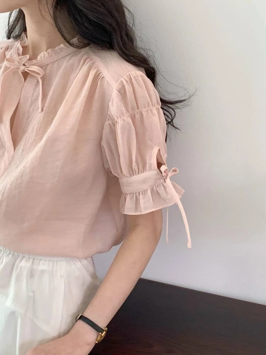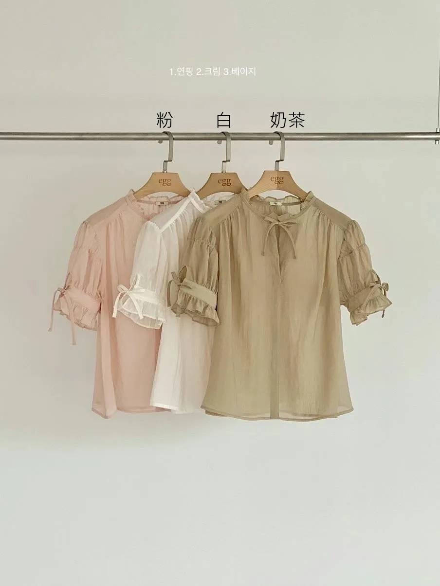 HJ962極薄款浪漫胸袖綁帶上衣 白 粉 奶茶 官網價$1670 線上價$1640