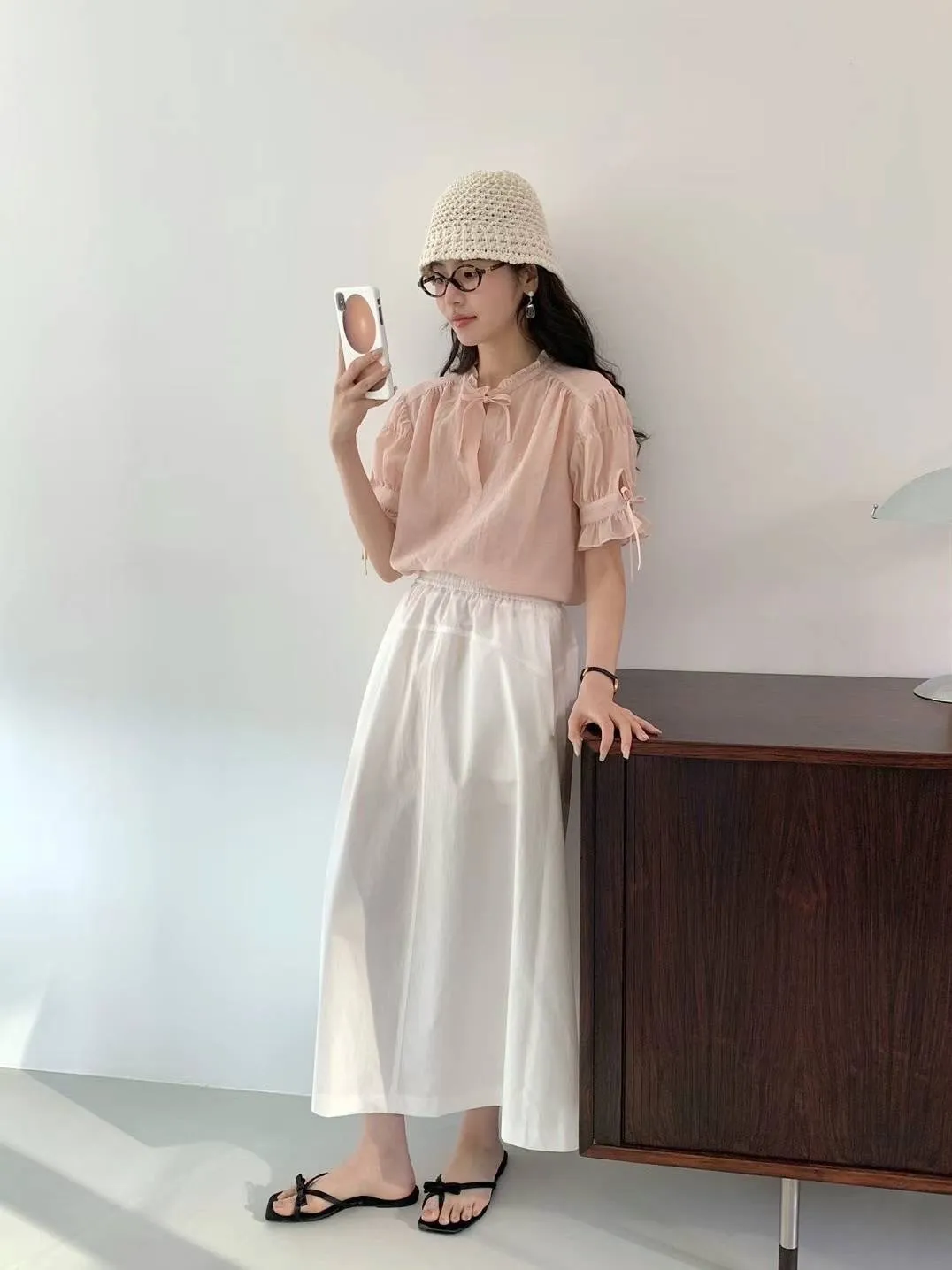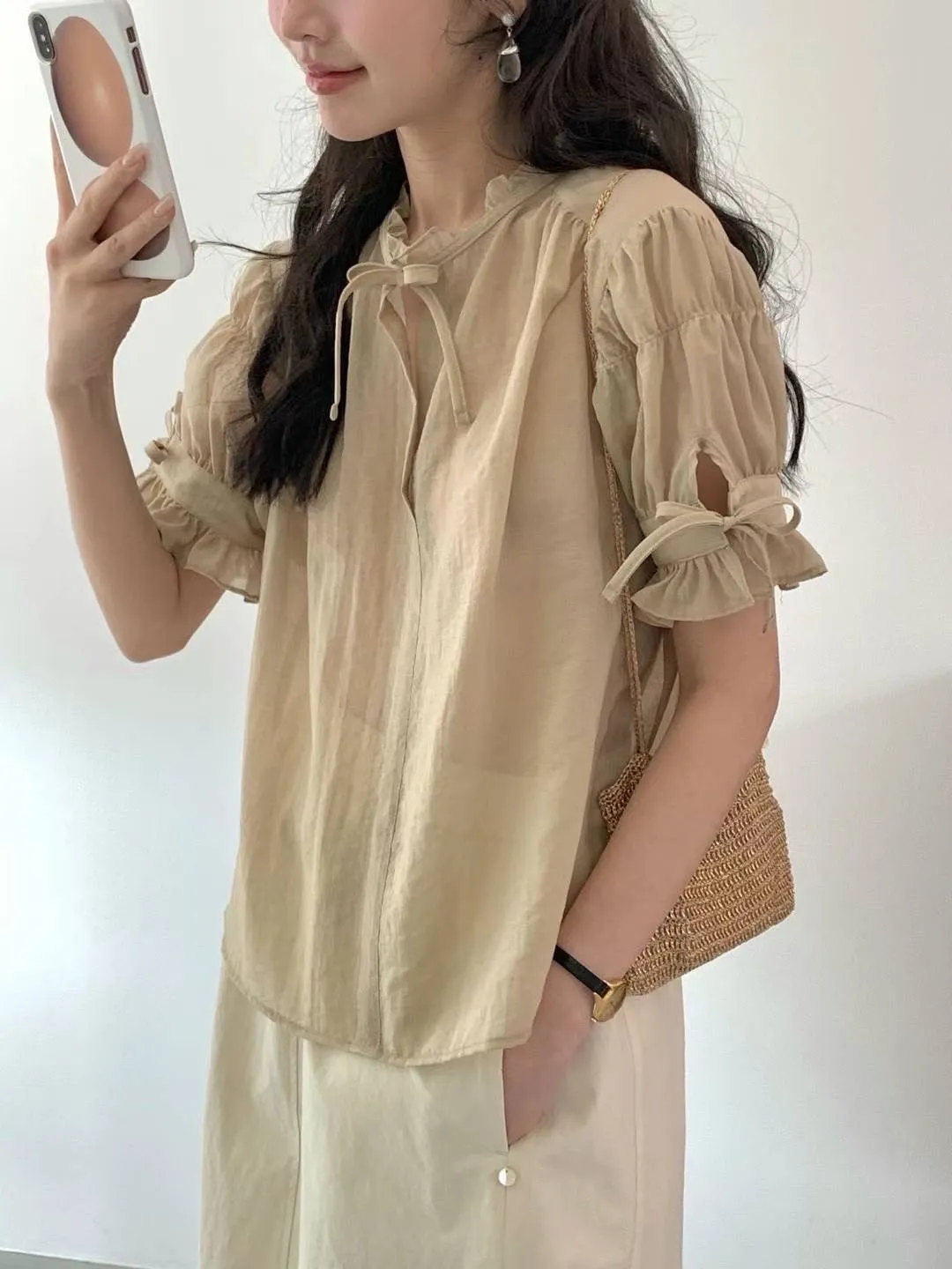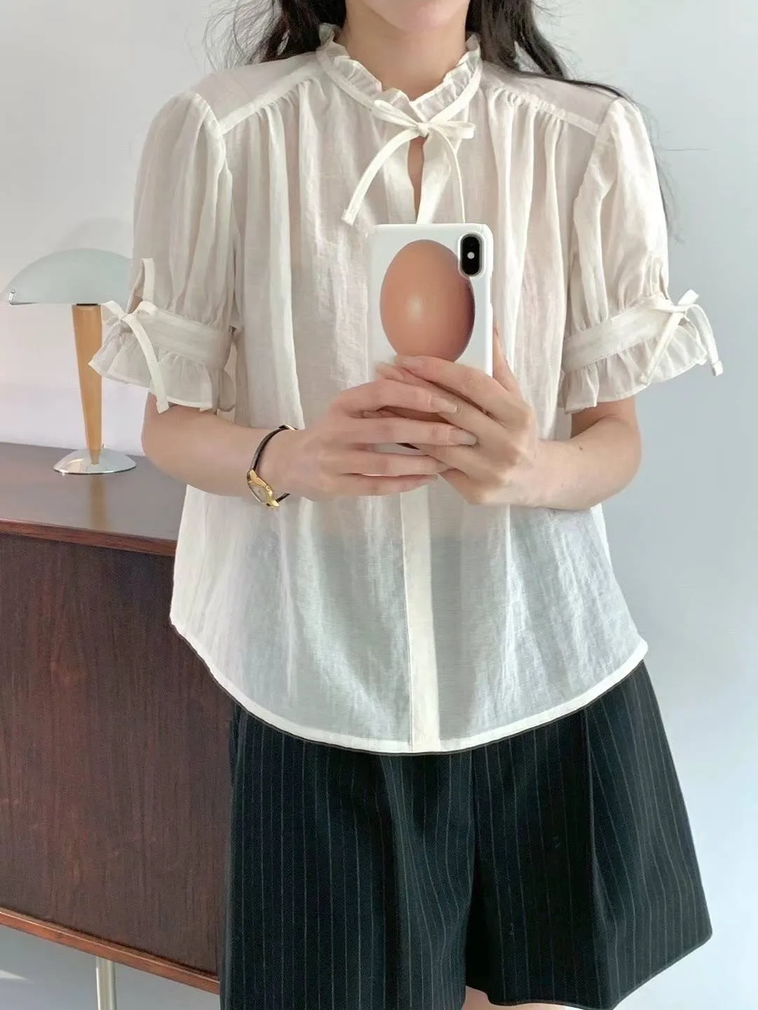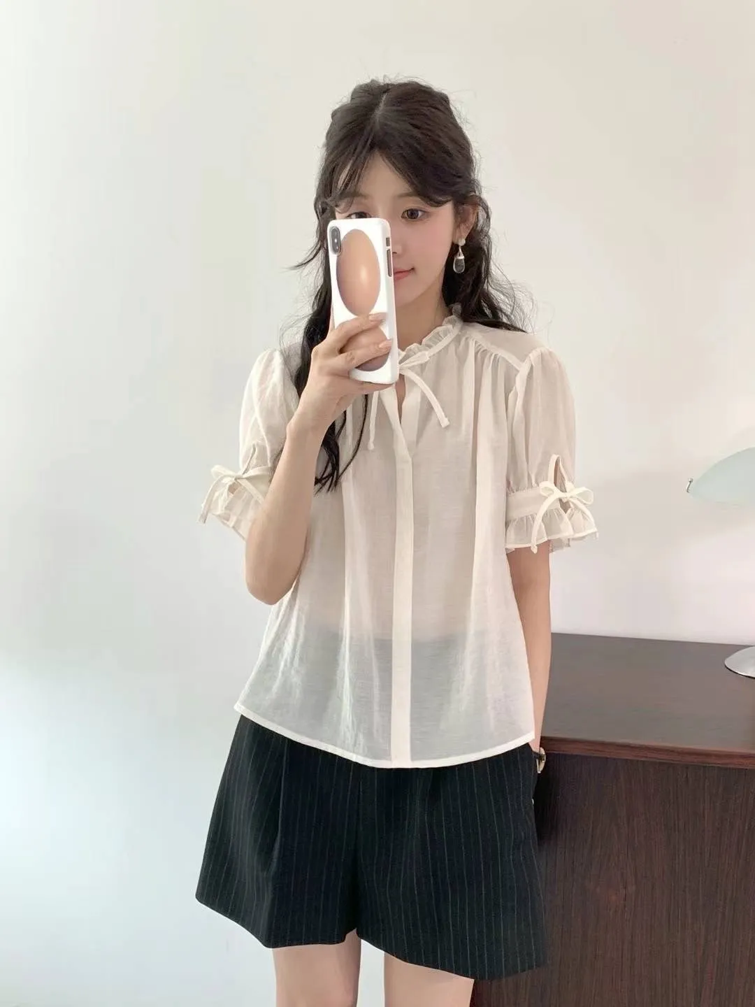 HJ962極薄款浪漫胸袖綁帶上衣 白 粉 奶茶 官網價$1670 線上價$1640