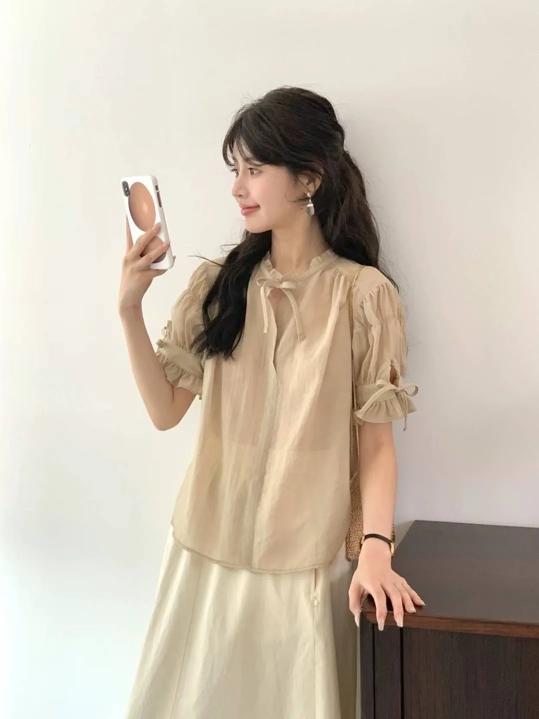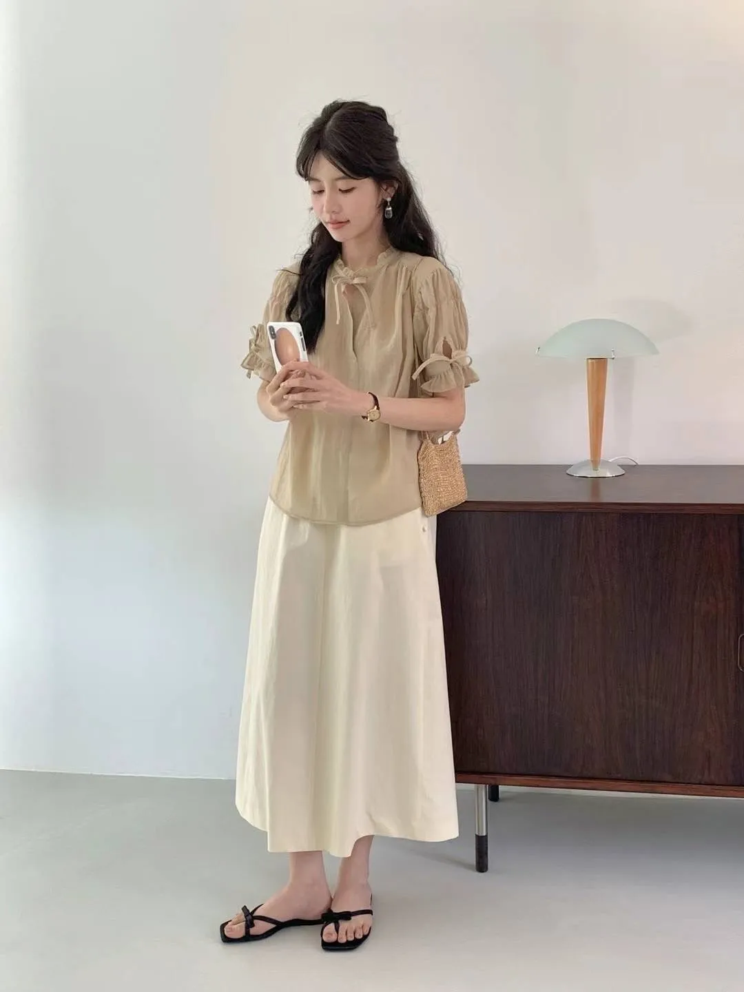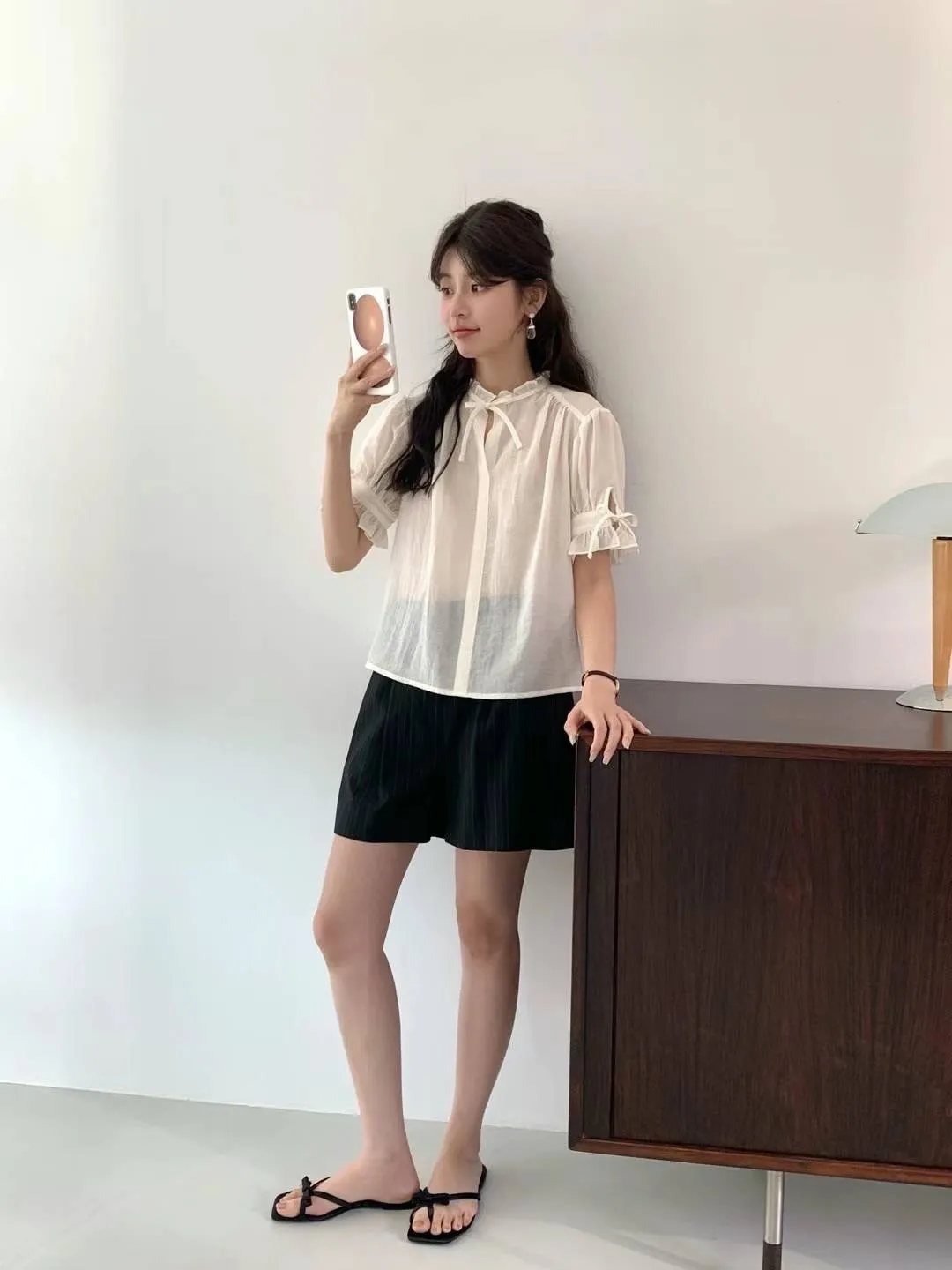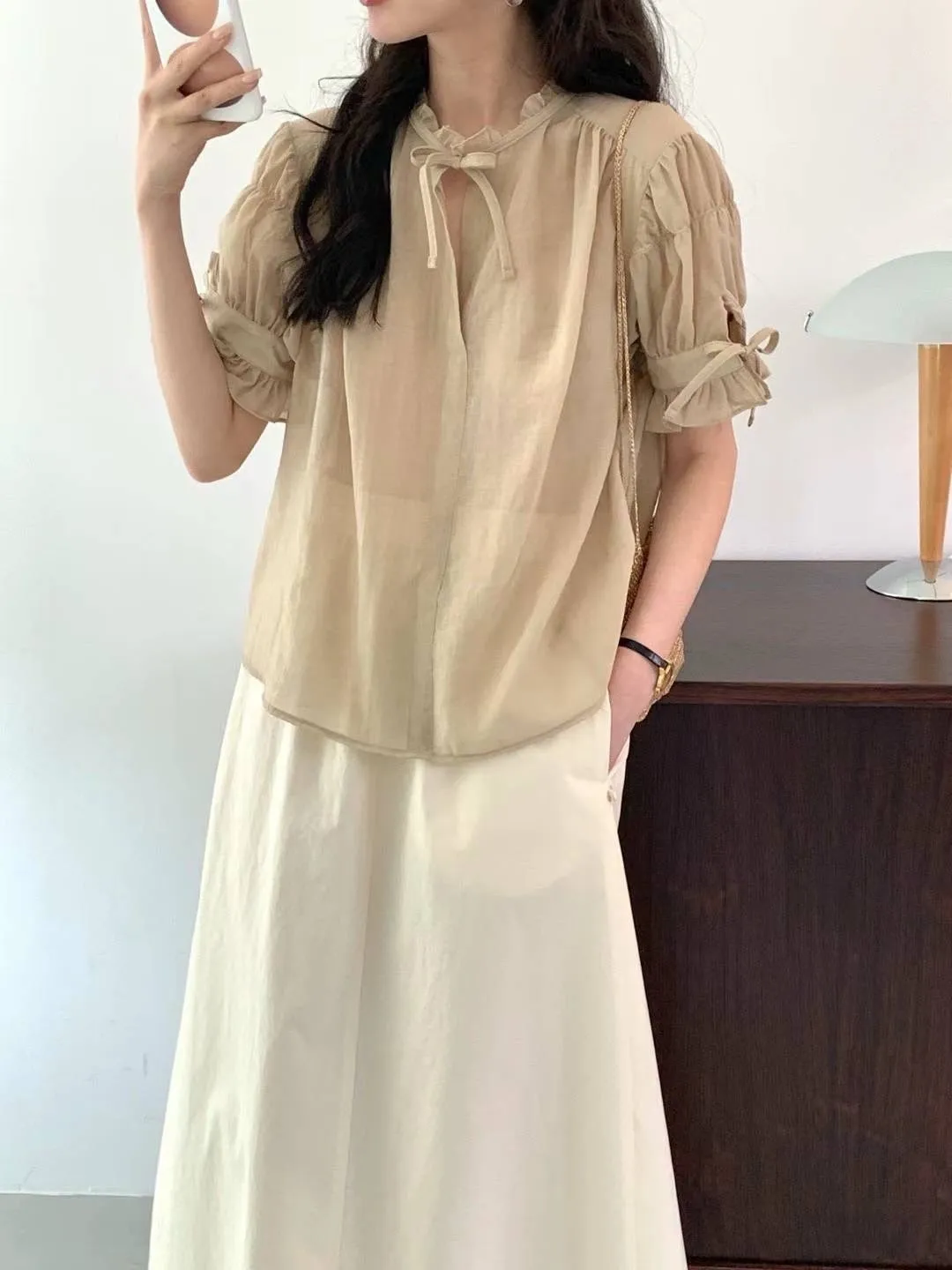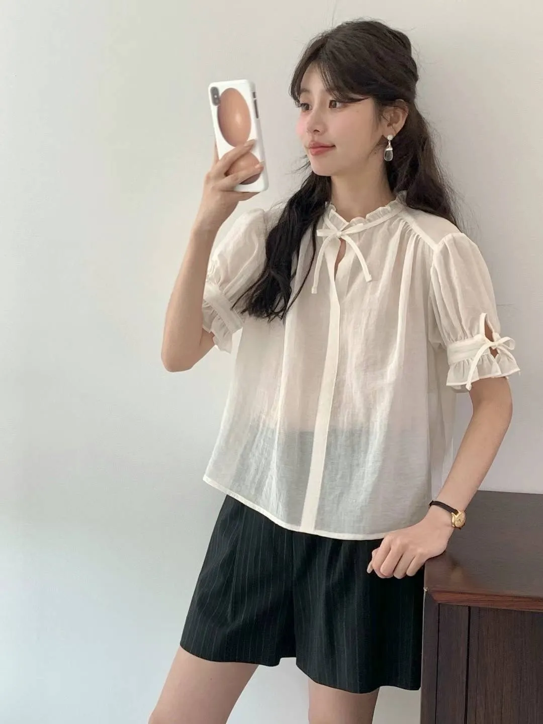 HJ962極薄款浪漫胸袖綁帶上衣 白 粉 奶茶 官網價$1670 線上價$1640