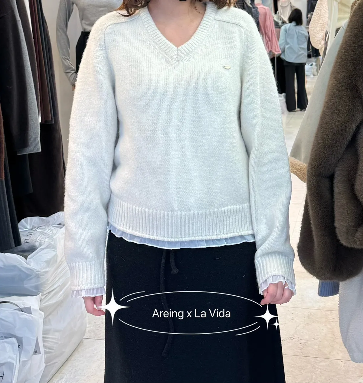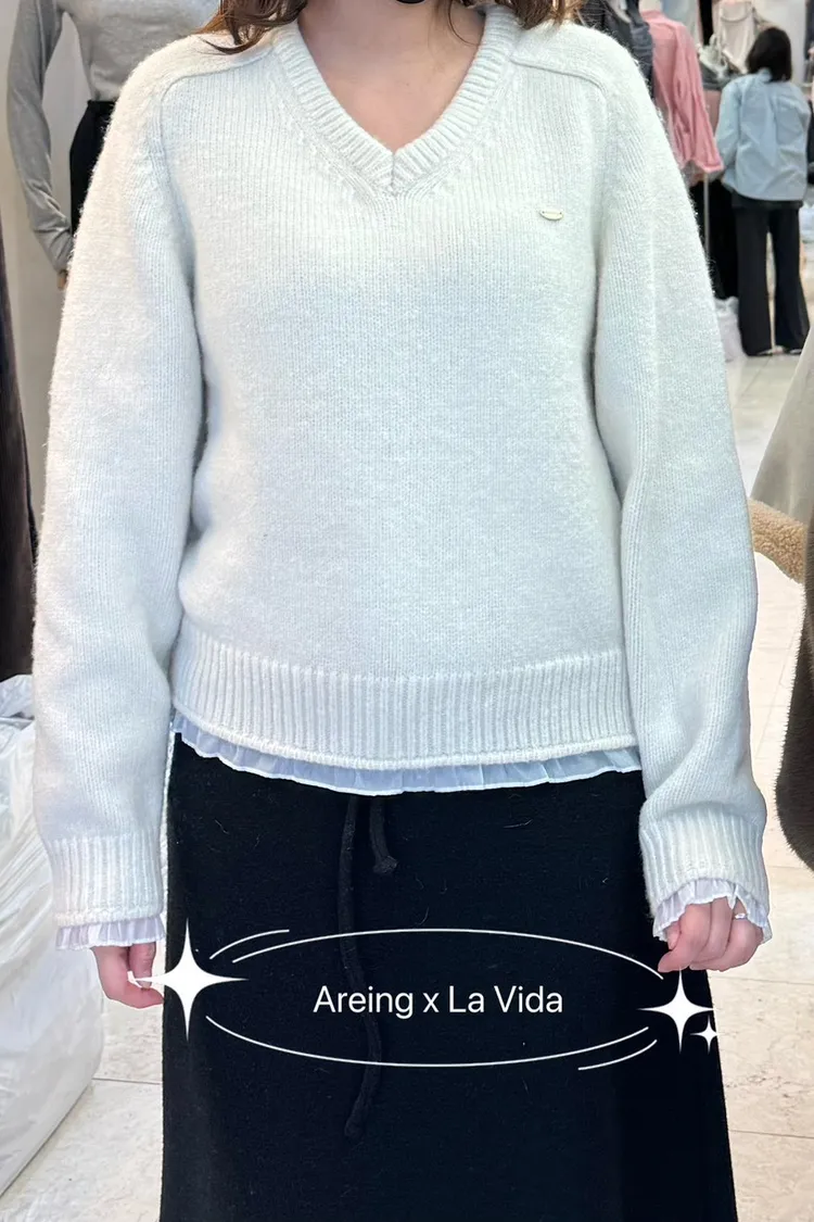 羊毛20% V領顯瘦 袖口下擺歐根紗層次滾邊